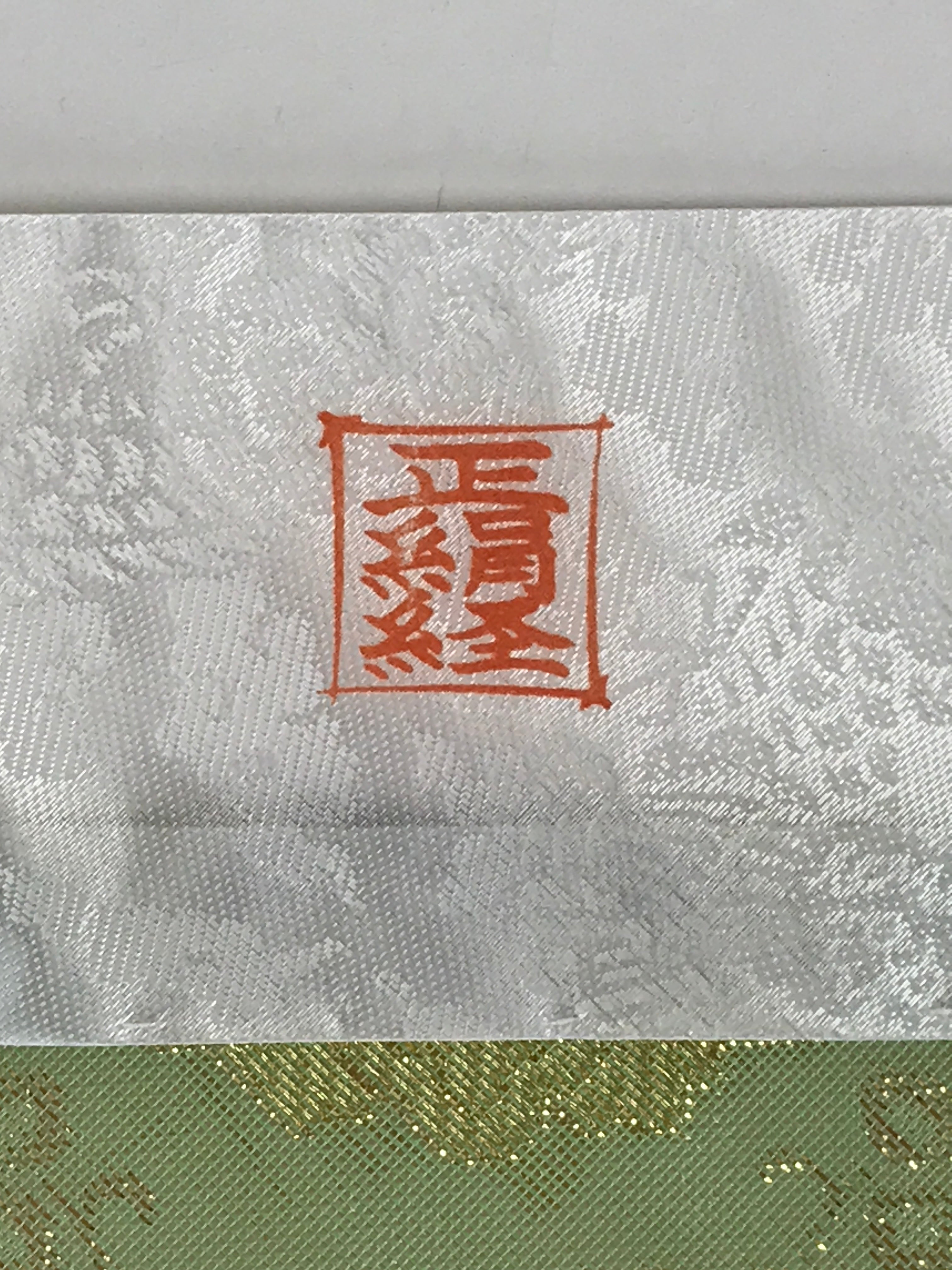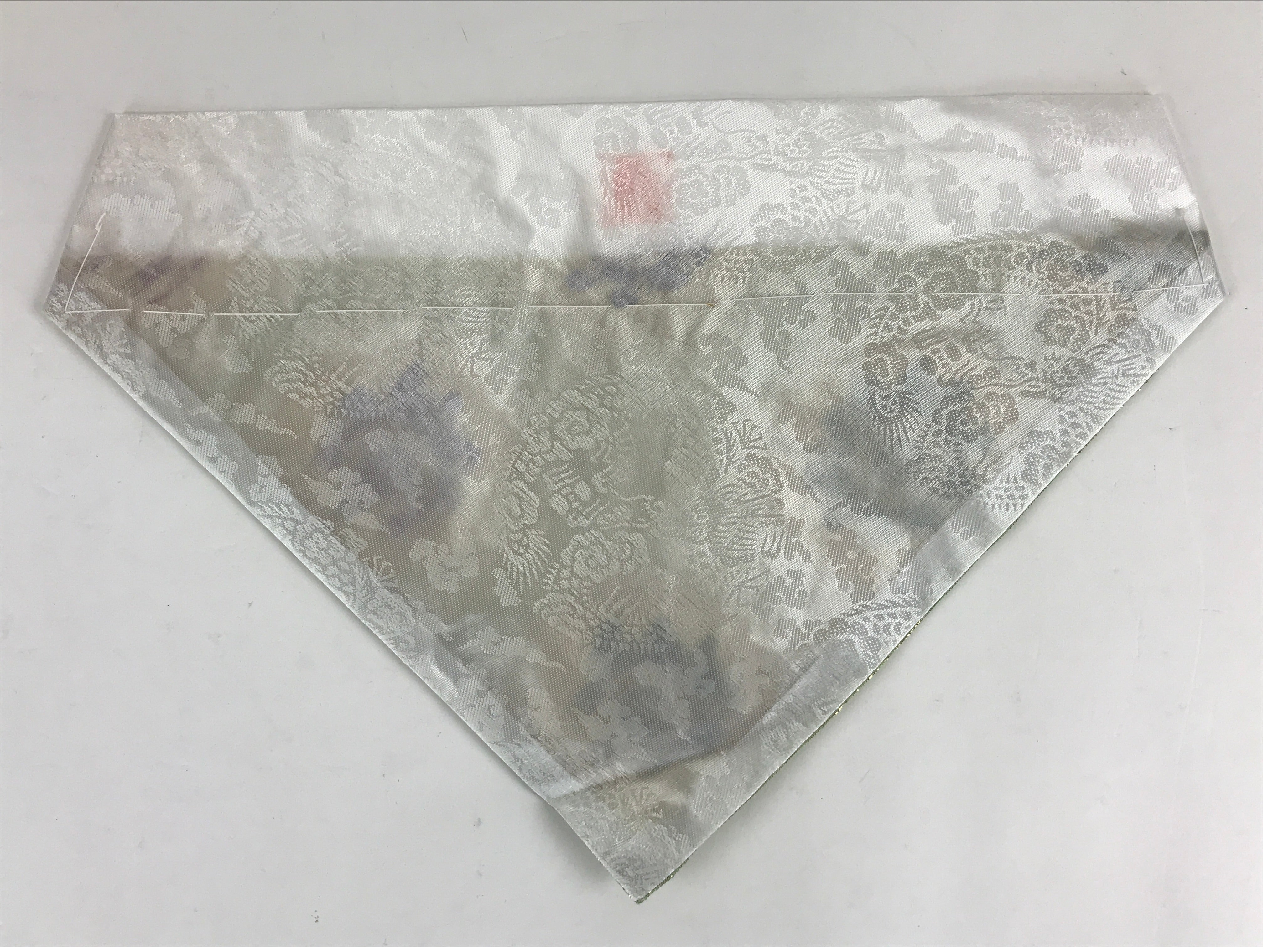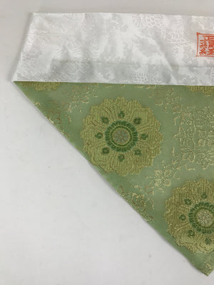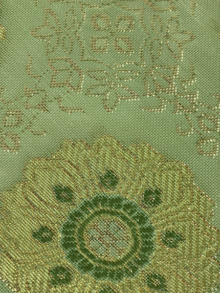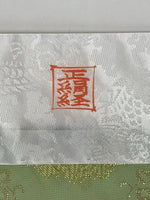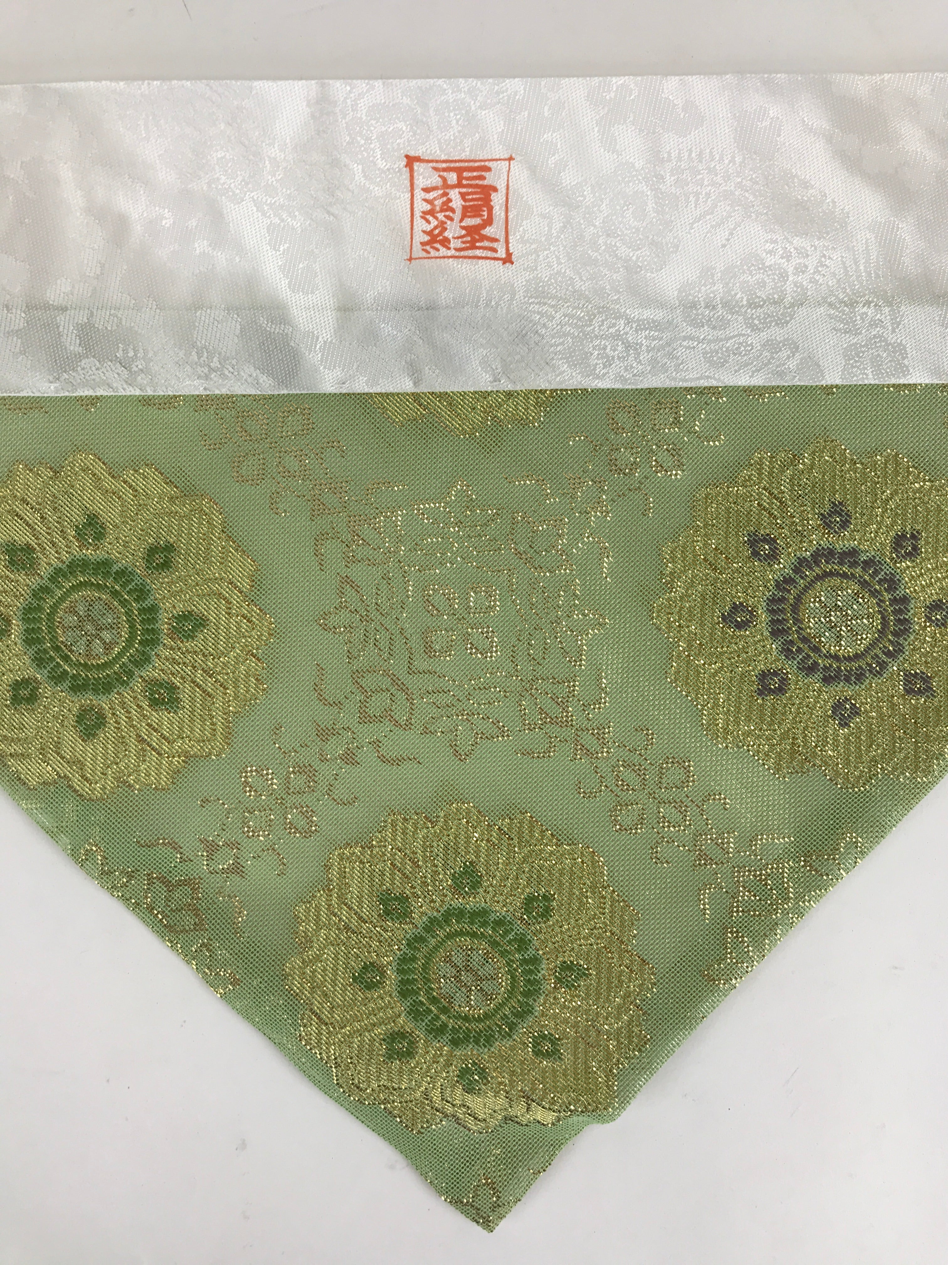 This is a vintage Japanese Buddhist altar tablecloth Uchishiki. It is light green openwork fabric for summer, embroidered with gold floral patterns. It has a kanji stamp that says "Silk". Triangular uchishiki is mainly used by followers of Jodo Shinshu Buddhism as the upper table (Maejyoku) and the front table (Uwajyoku) in the Buddhist altar during events such as New Year's Day, the equinoctial week, Obon, and memorial services.