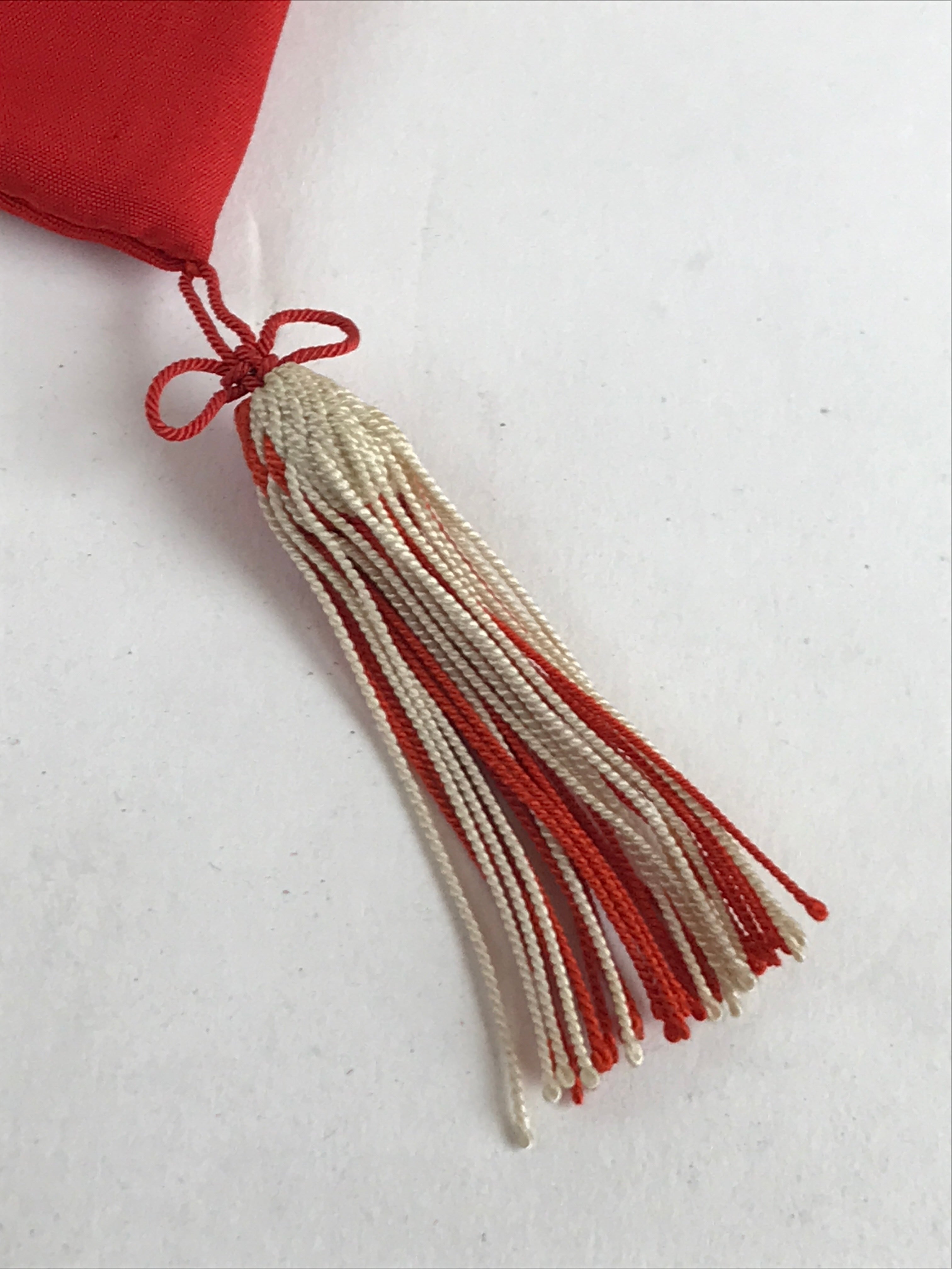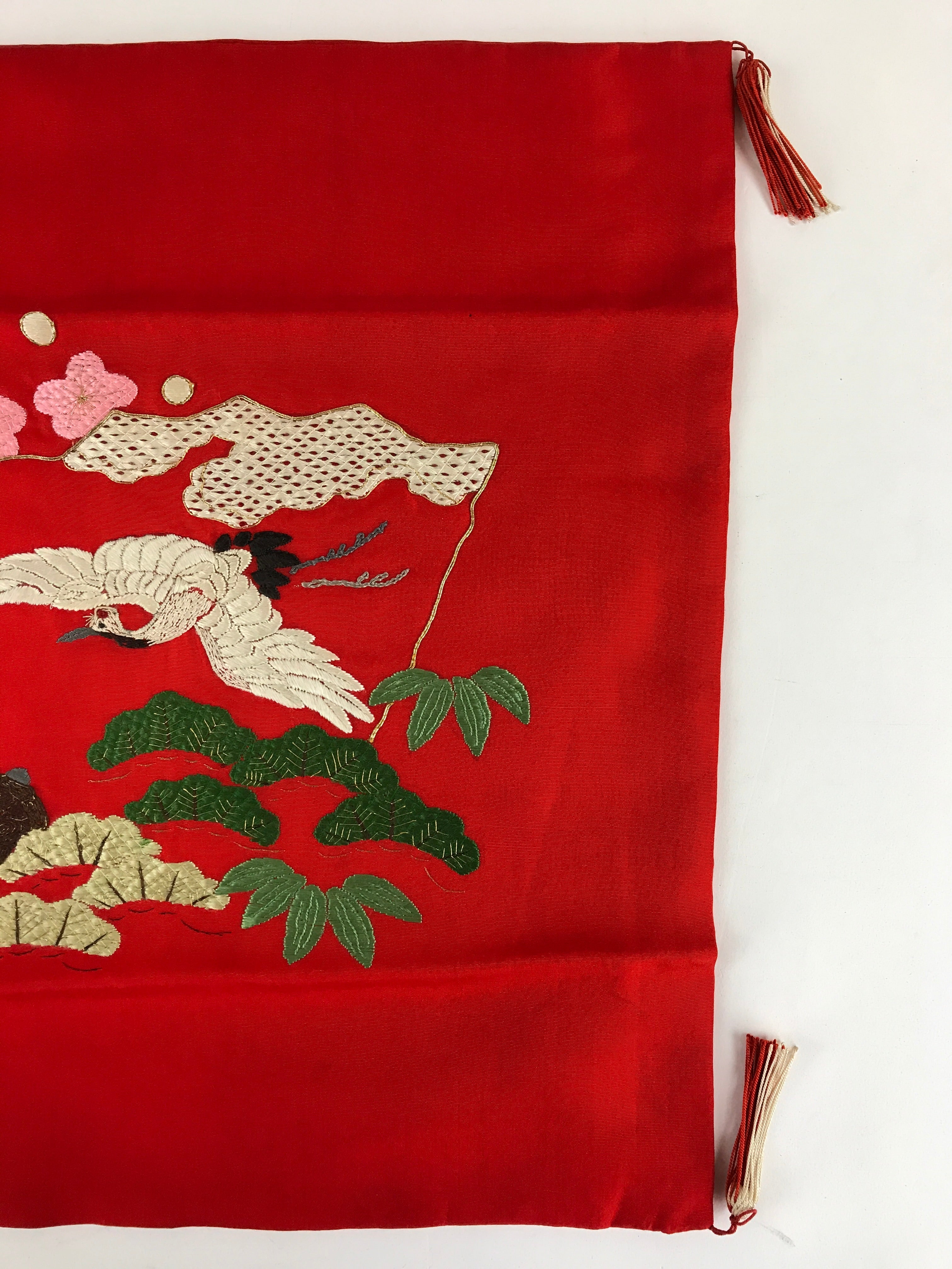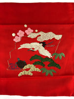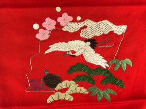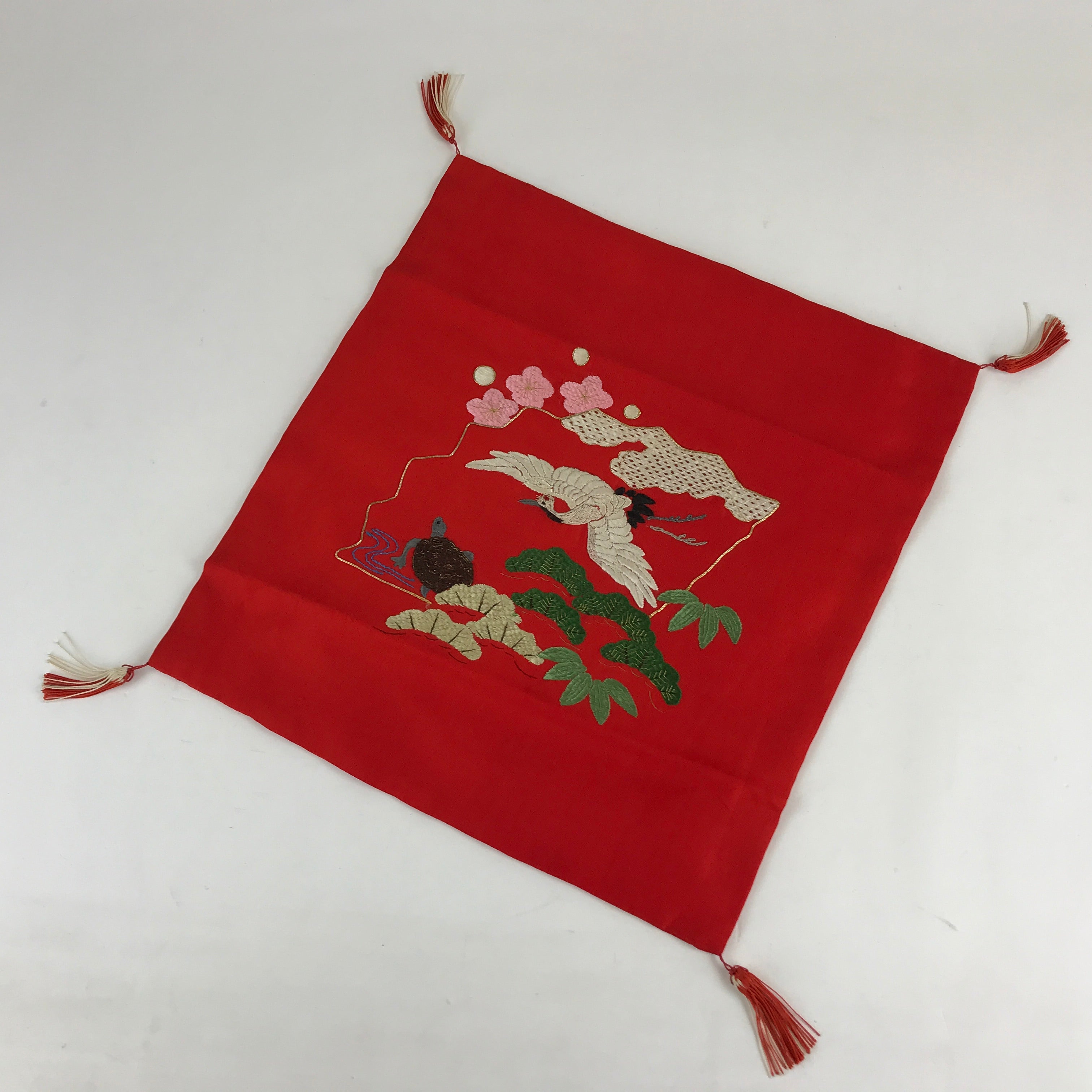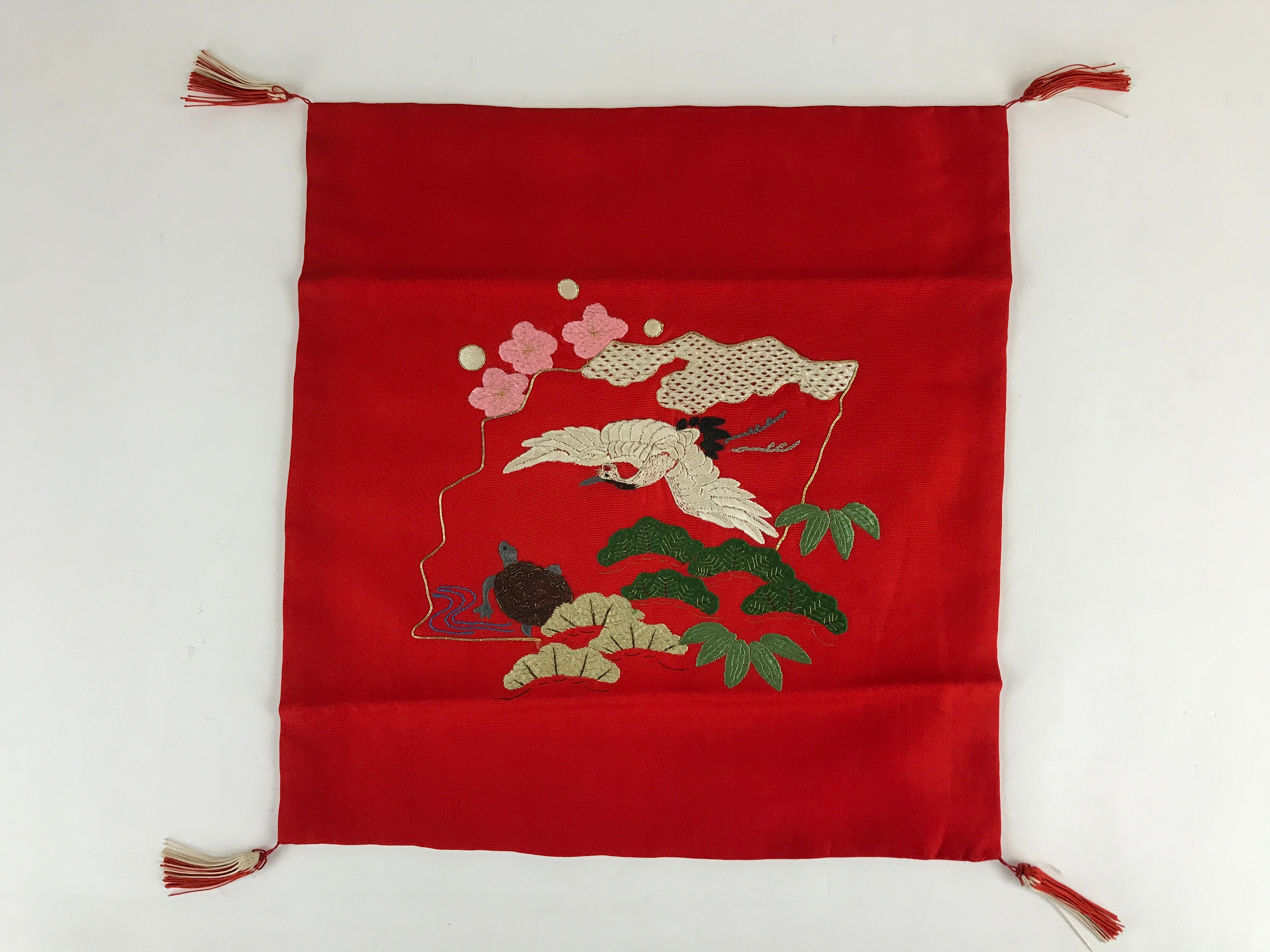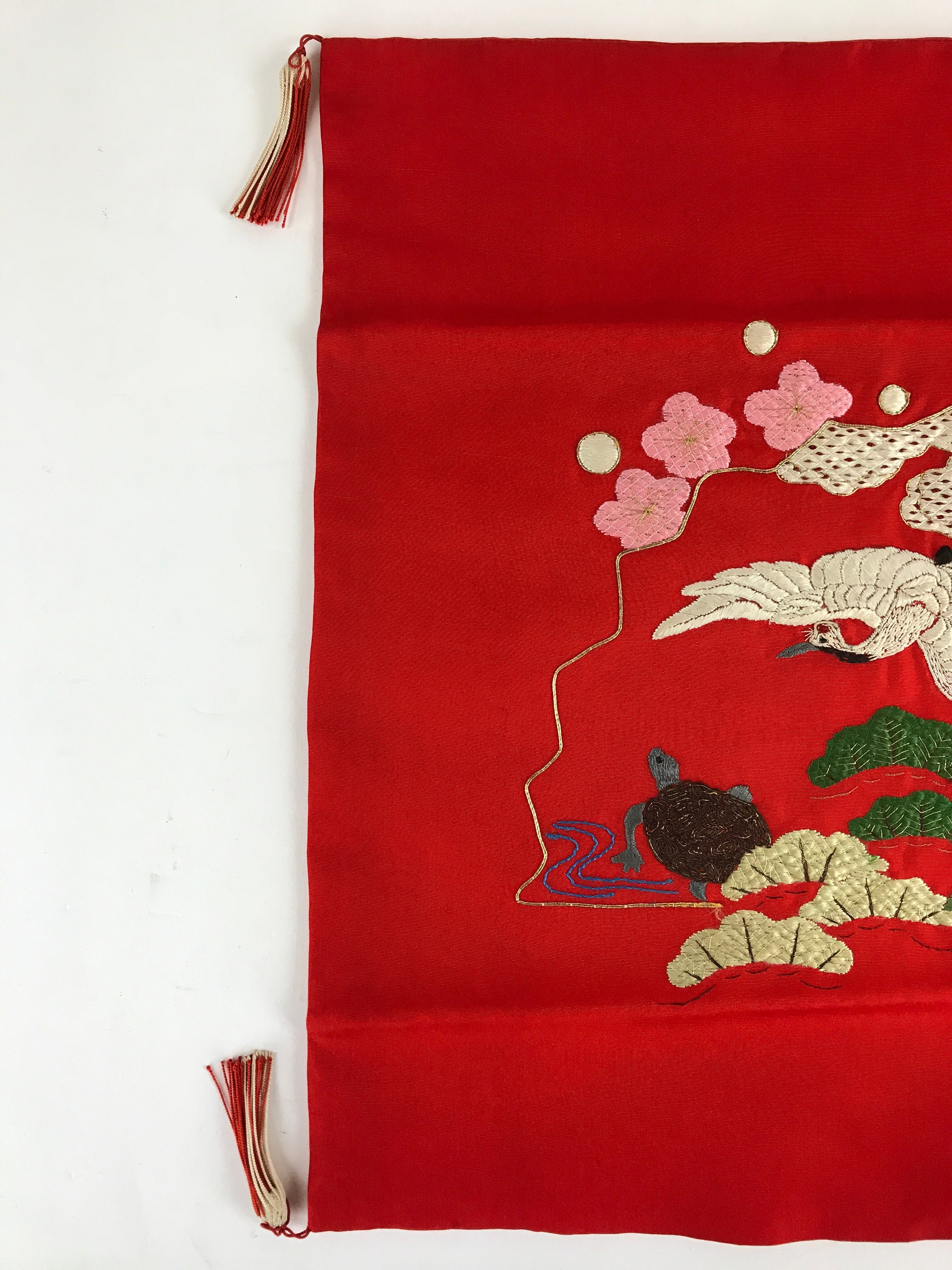 This is a vintage Japanese Buddhist altar tablecloth Uchishiki. It has embroidered with a crane and turtle. Sects other than the Jodo Shinshu sect (Jodo sect, Nichiren sect, Soto sect, Shingon sect, etc.) use the square uchishiki. Decorate on the upper table (Maejyoku) and the front table (Uwajyoku) in the Buddhist altar during events such as New Year's Day, the equinoctial week, Obon, and memorial services.