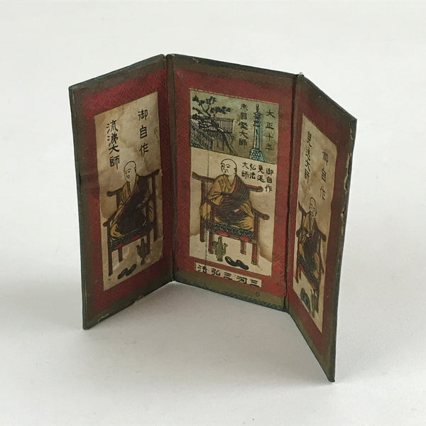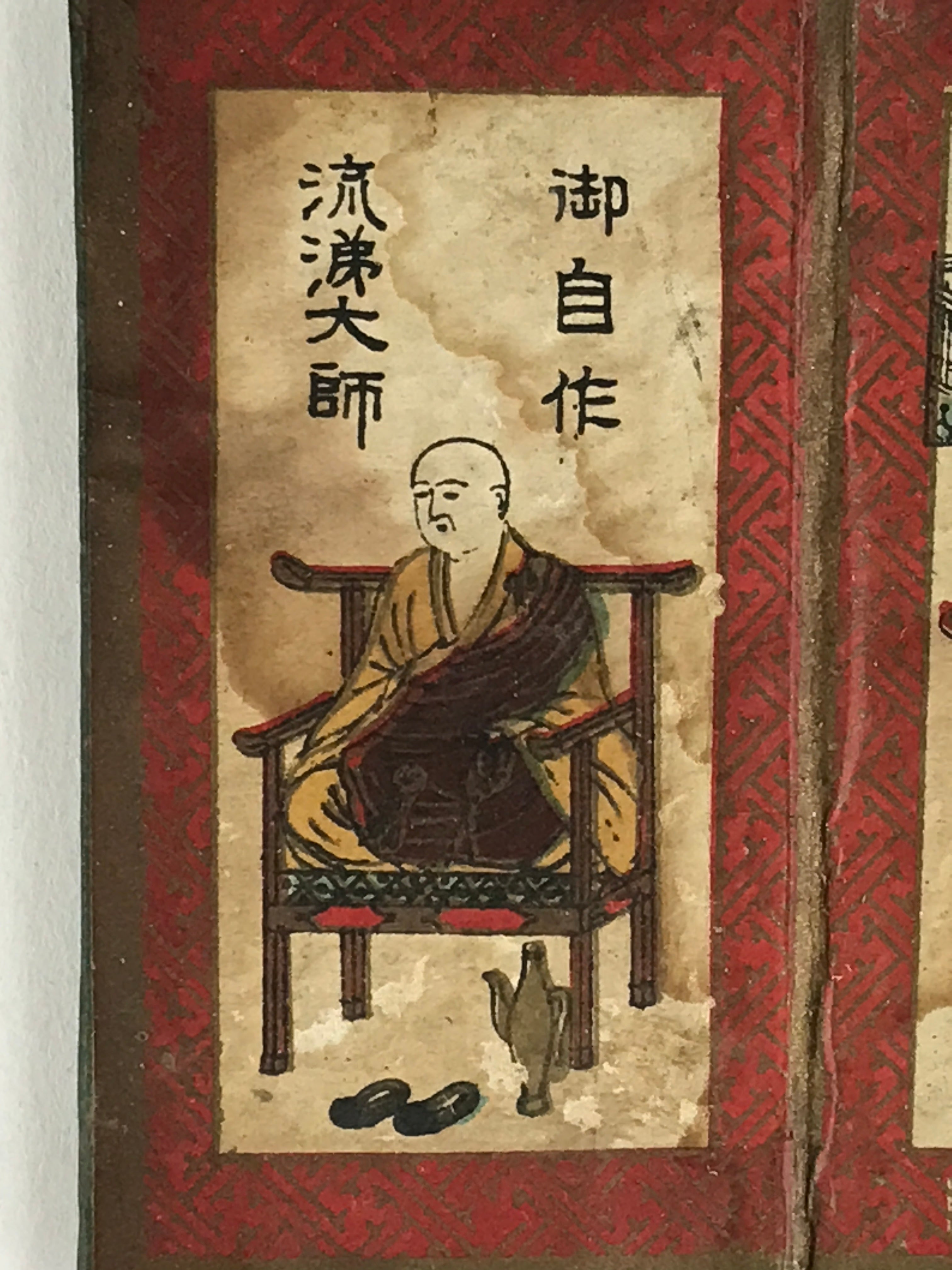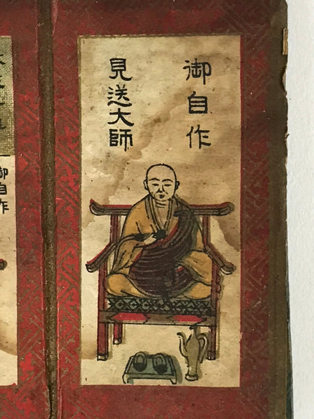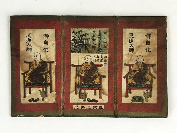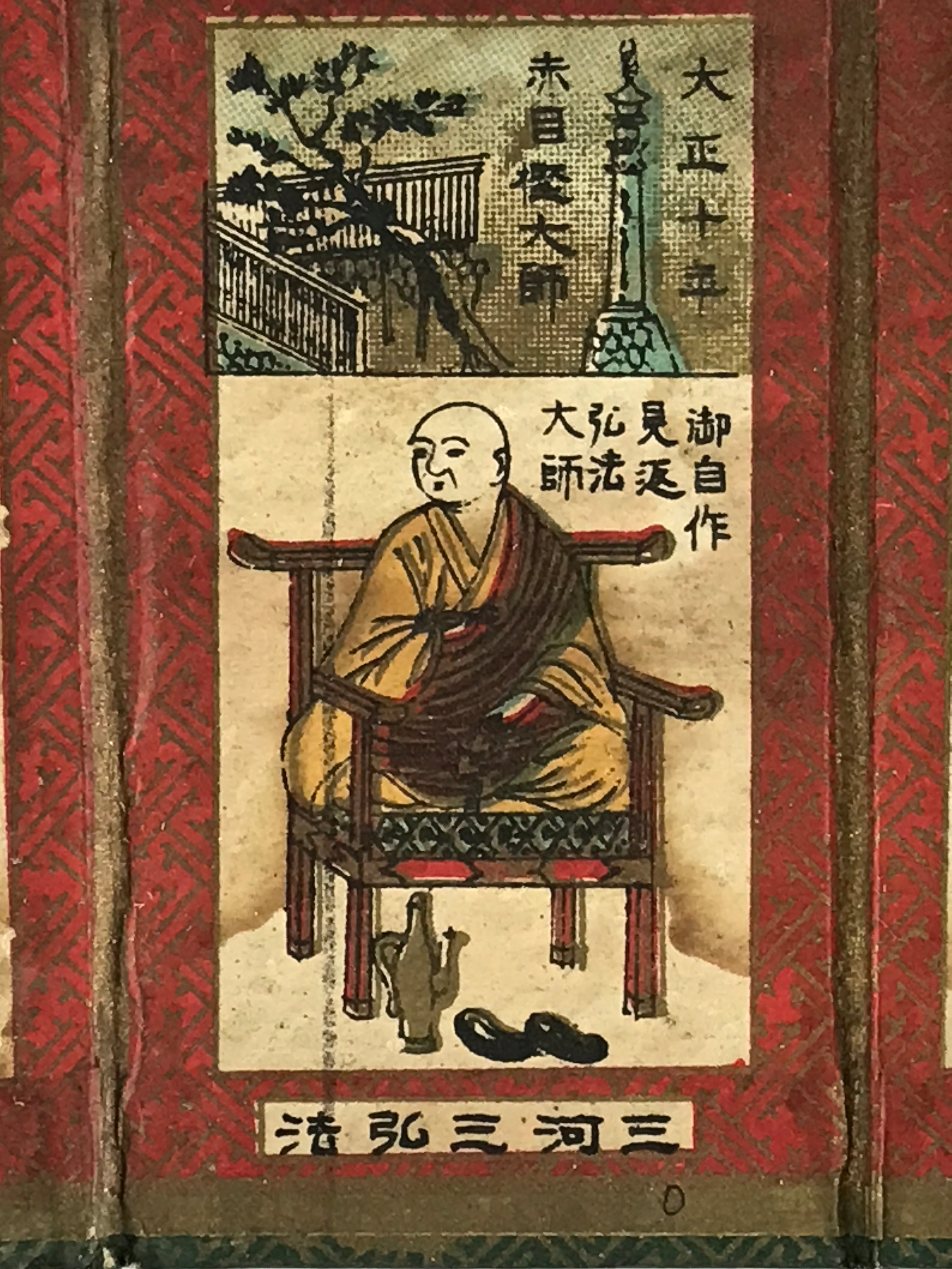 This is a Japanese Buddhist amulet. This image is Kobo Daishi. It is said that in 814, Kobo Daishi (Kukai) was on a pilgrimage in the east part of Japan and made a tour of Mikawa Province, stopping at Henjoin, Saifukuji, and Mitsuzoin, and carved a statue of Daishi himself.
