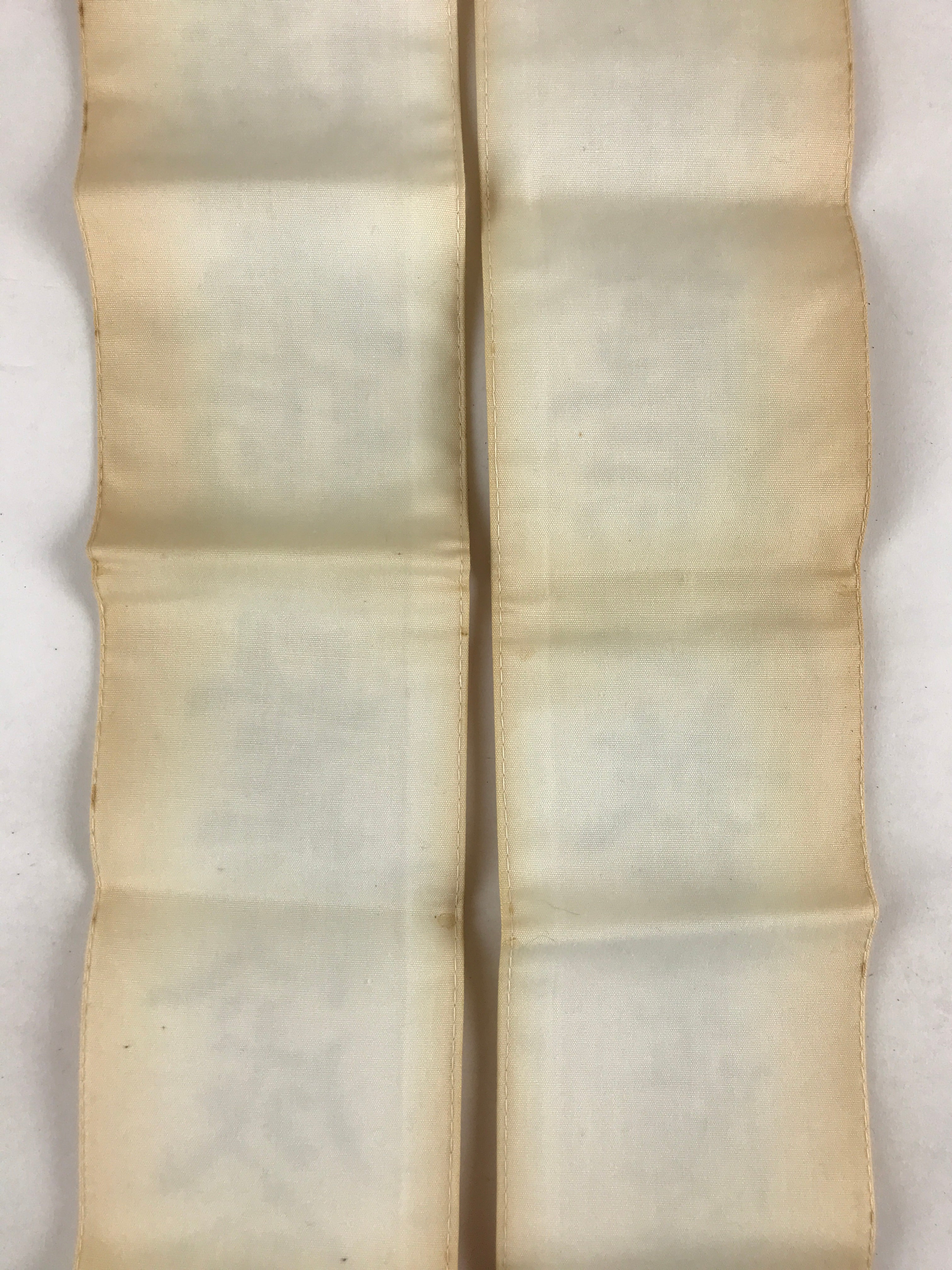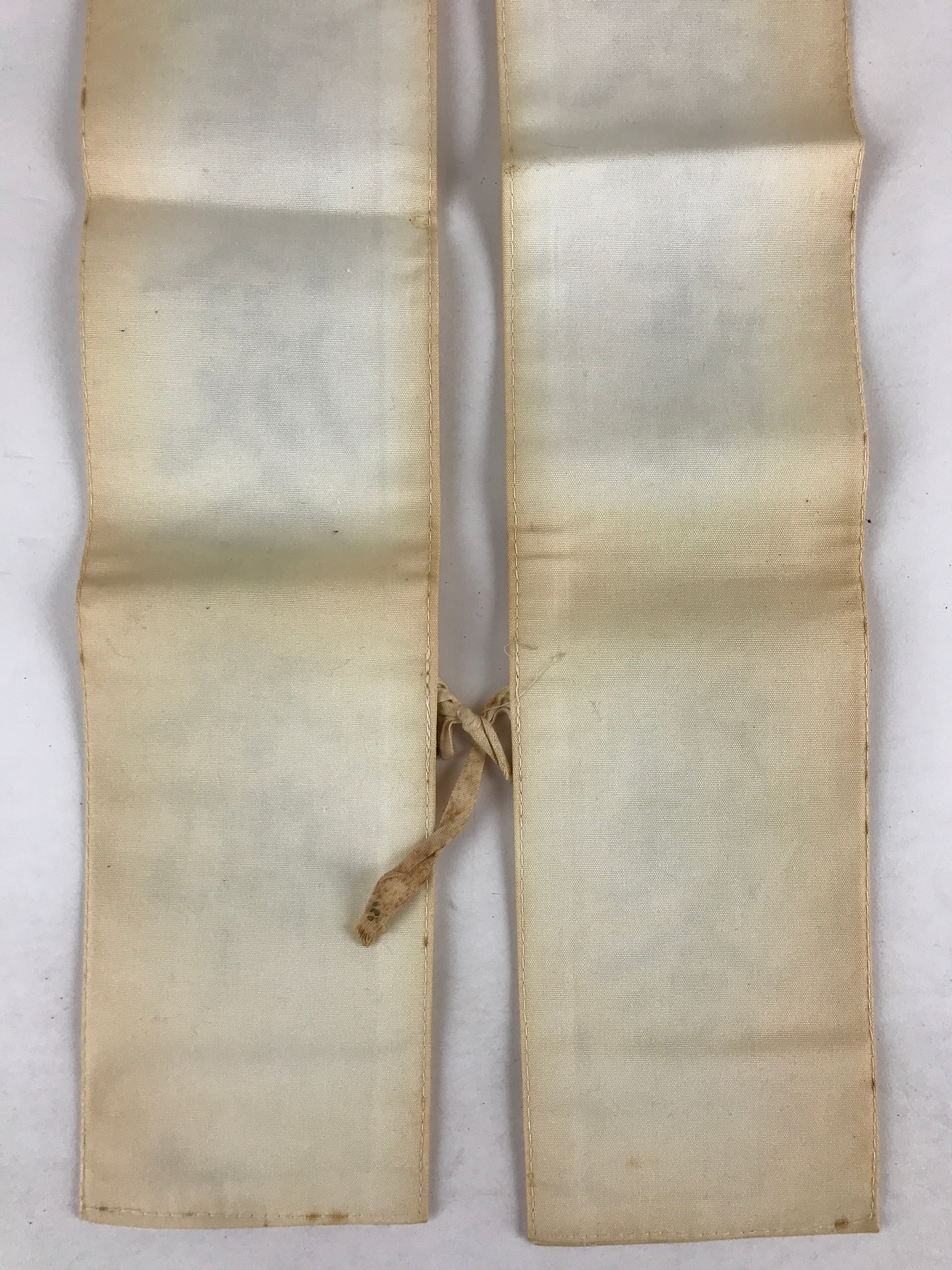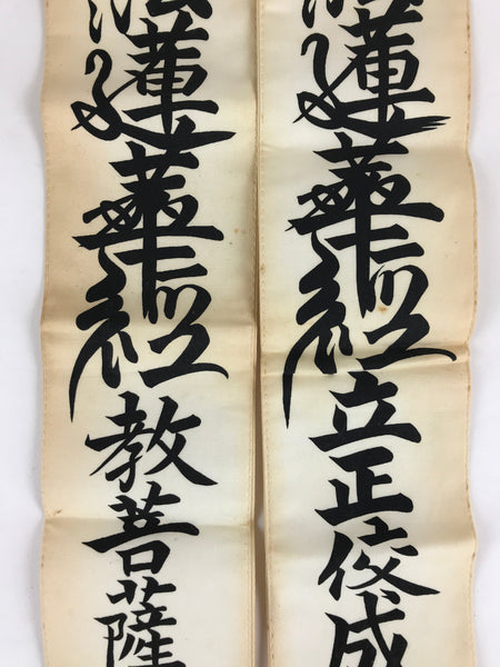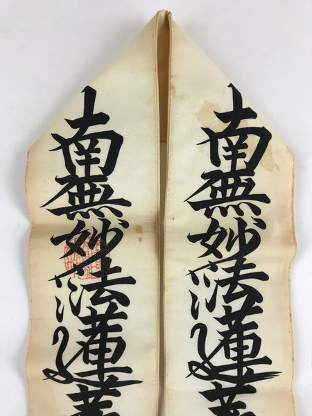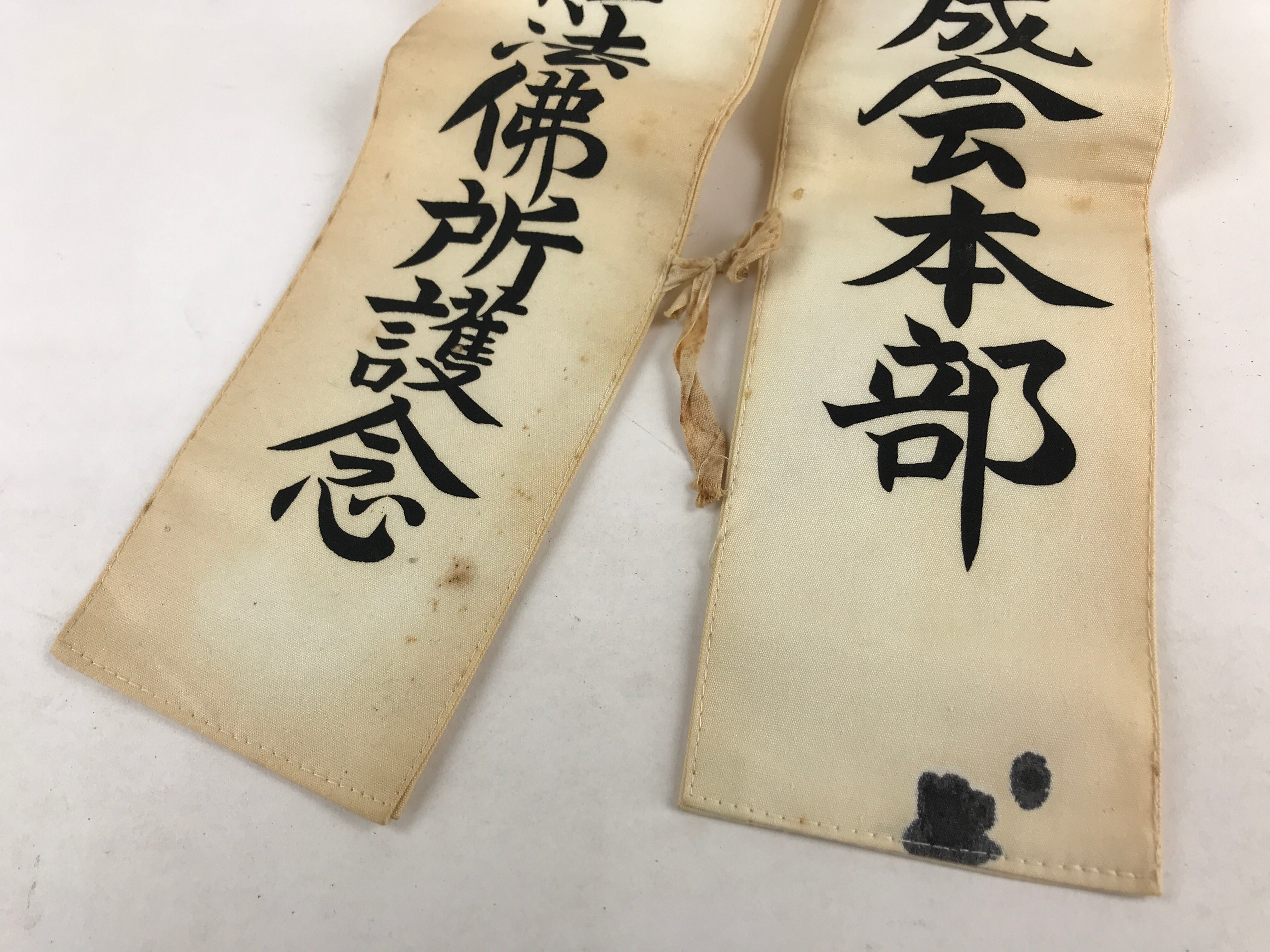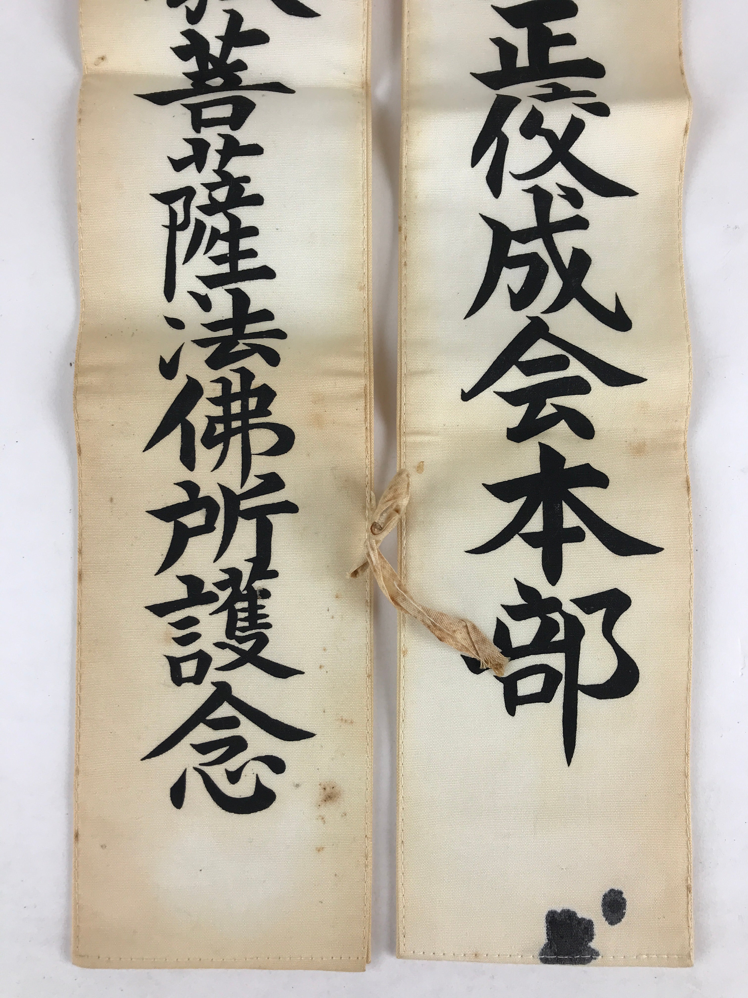 This is a Japanese Buddhist Nichiren sect Tasuki. Tasuki is a type of costume worn from the shoulders to the sides. The kanji written are Lotus Sutra Nanmyoho-Renge-Kyo and Risshō Kōsei Kai/Nanmyoho-Renge-Kyo, Bodhisattva Law, and Buddhist Spirits.