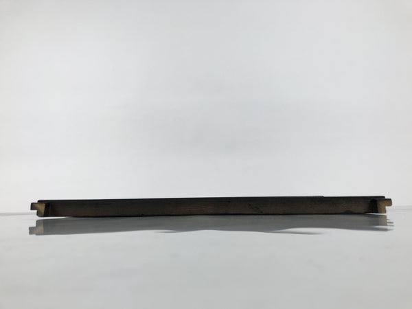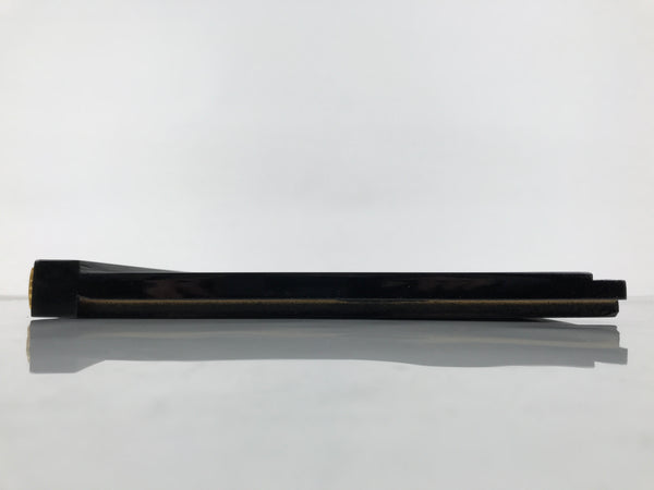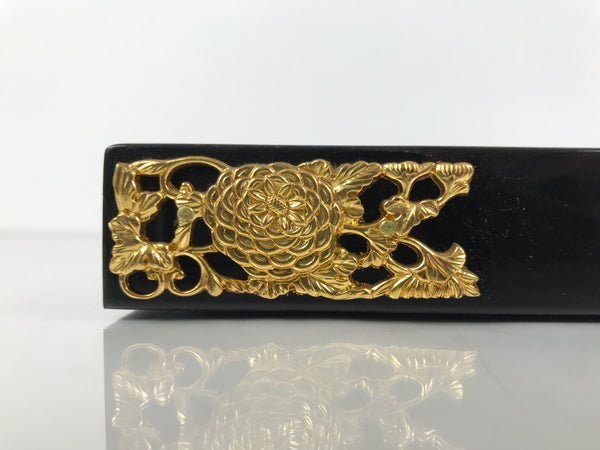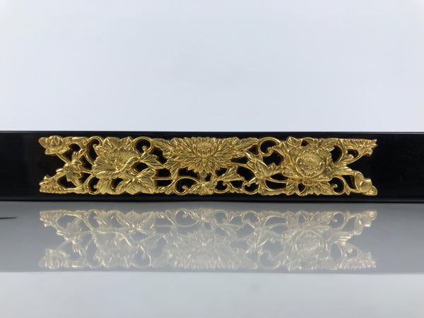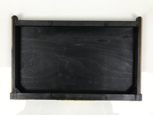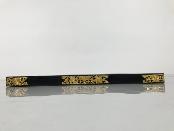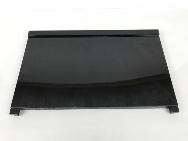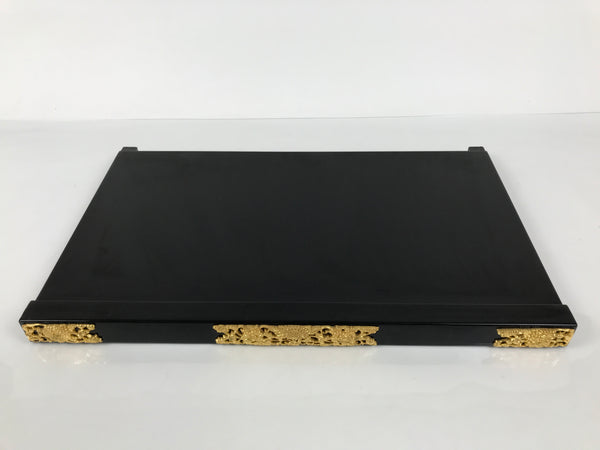 This item comes from a Japanese vintage wooden Buddhist altar cabinet. This flat, square panel drawer is mostly coated in glossy classic black lacquer and would usually pull out of a butsudan to form a table, tray, or shelf. There are gold-colored metal decorative panels on the front side that feature chrysanthemums (kiku) and peonies (botan).