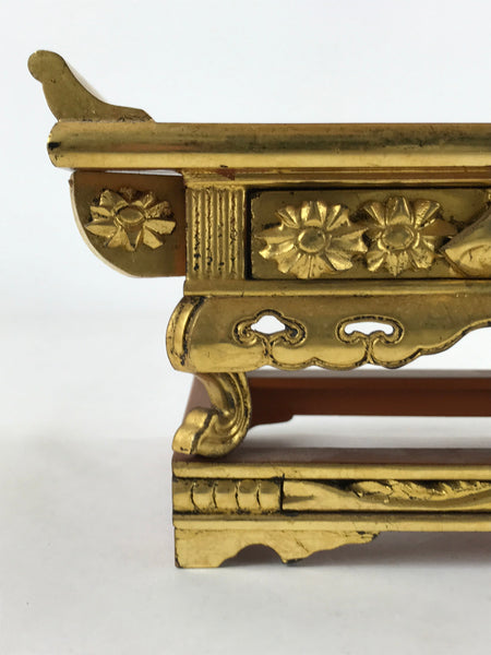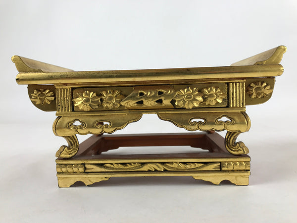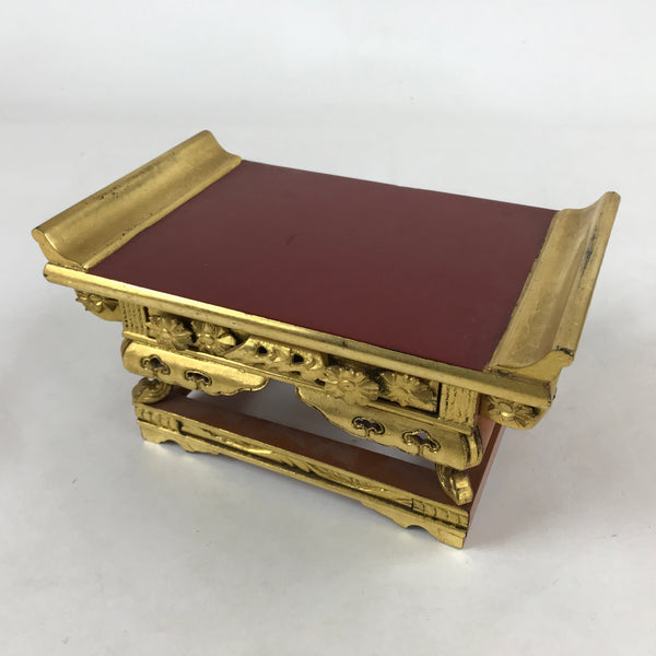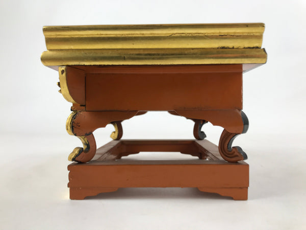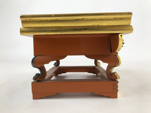 This is a vintage Japanese Buddhist altar offering table (Maejyoku). It is coated with gold, red, brown, and black lacquer. It has a handcarved floral motif on the front side. The top side is red with gold, while the back side is black, and underside brown.