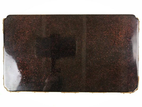 This is a vintage Japanese Buddhist altar offering table (Maejyoku). It is coated with gold and black lacquer. It contains one removable tabletop piece. The edges are decorated with simple brass metal. The top piece has a unique lacquer technique called nishiji nuri, a lacquer style that usually features glossy black with copper-colored flecks or glitter.