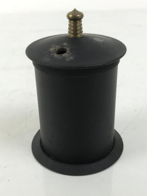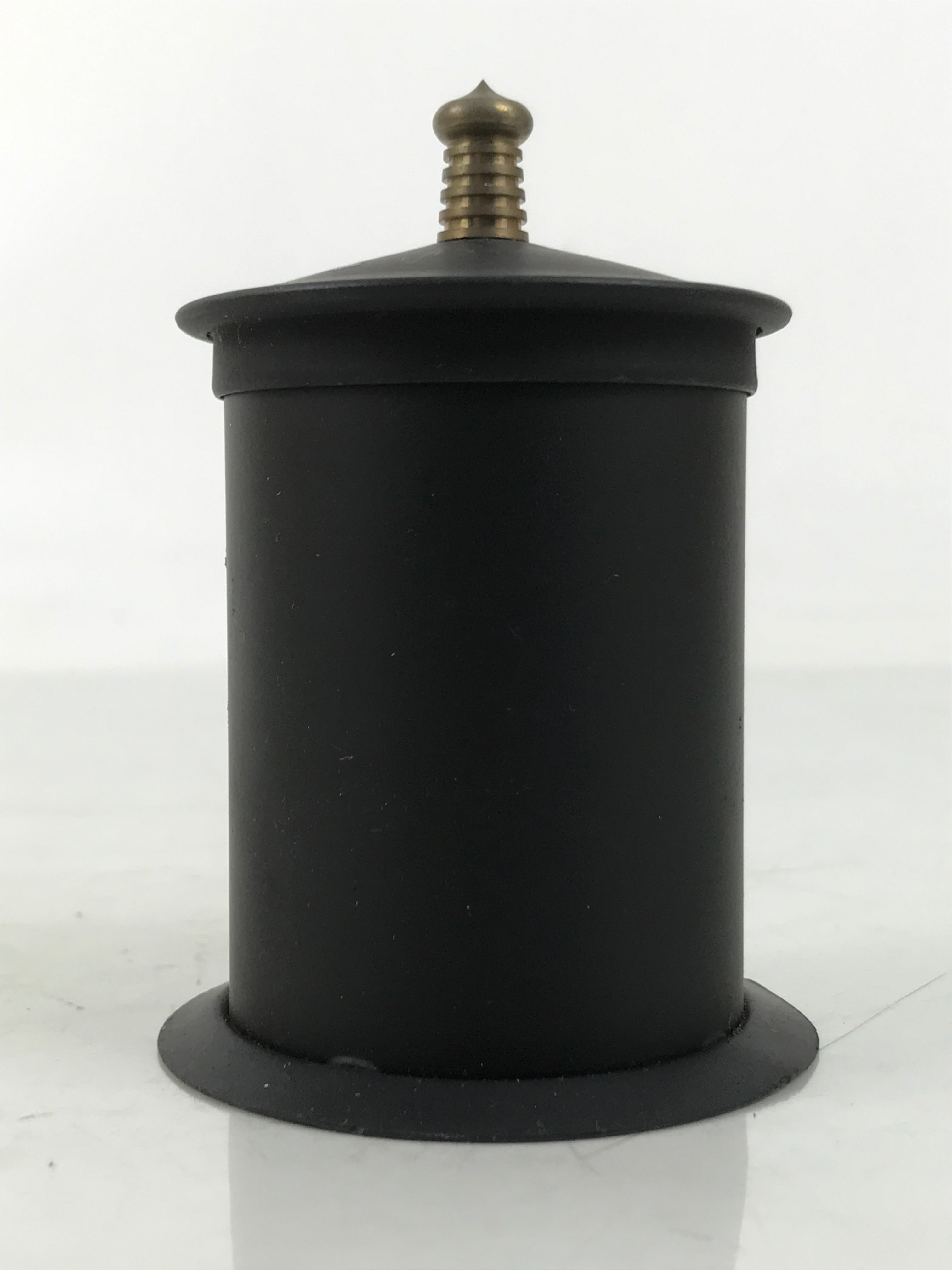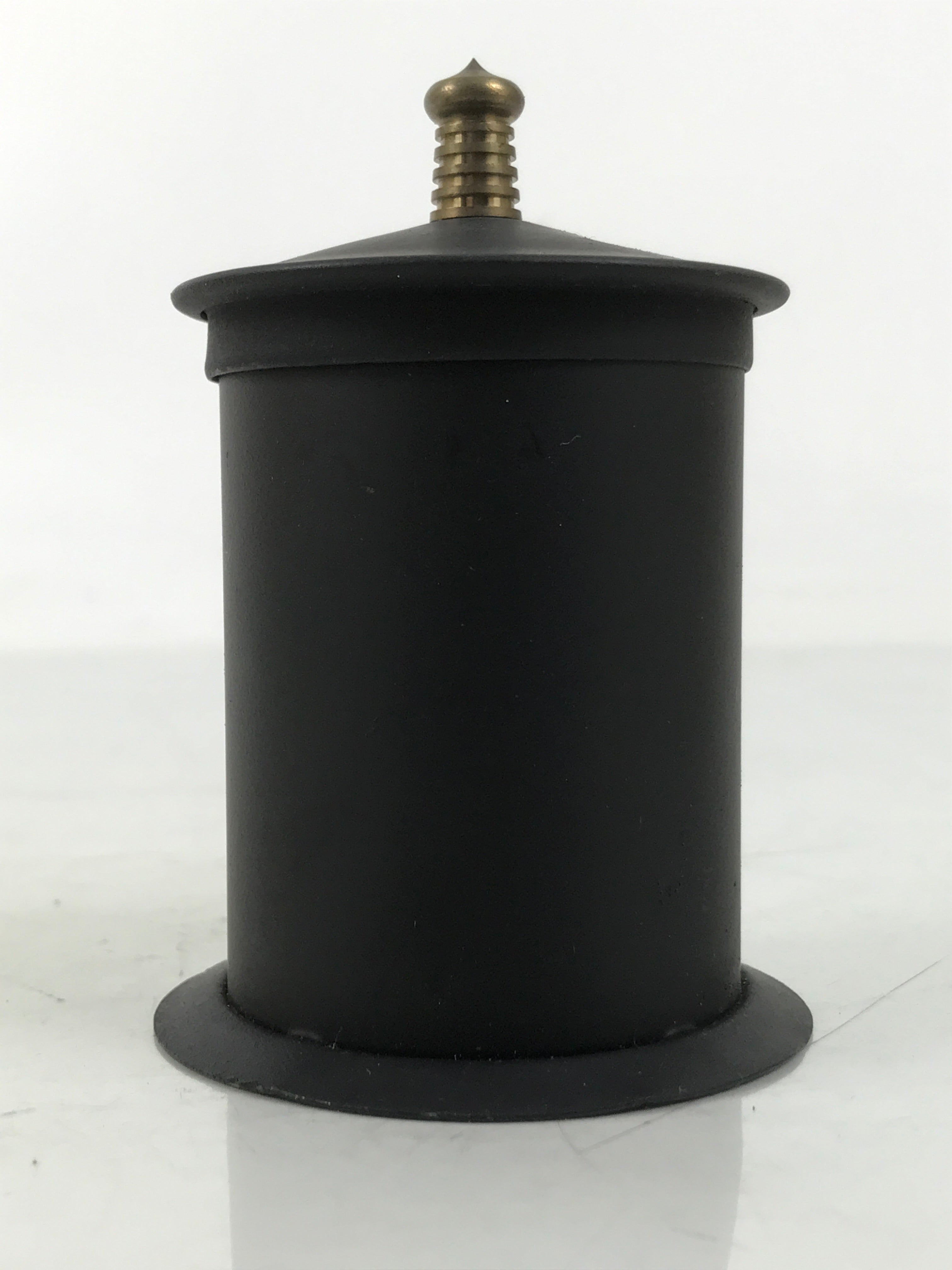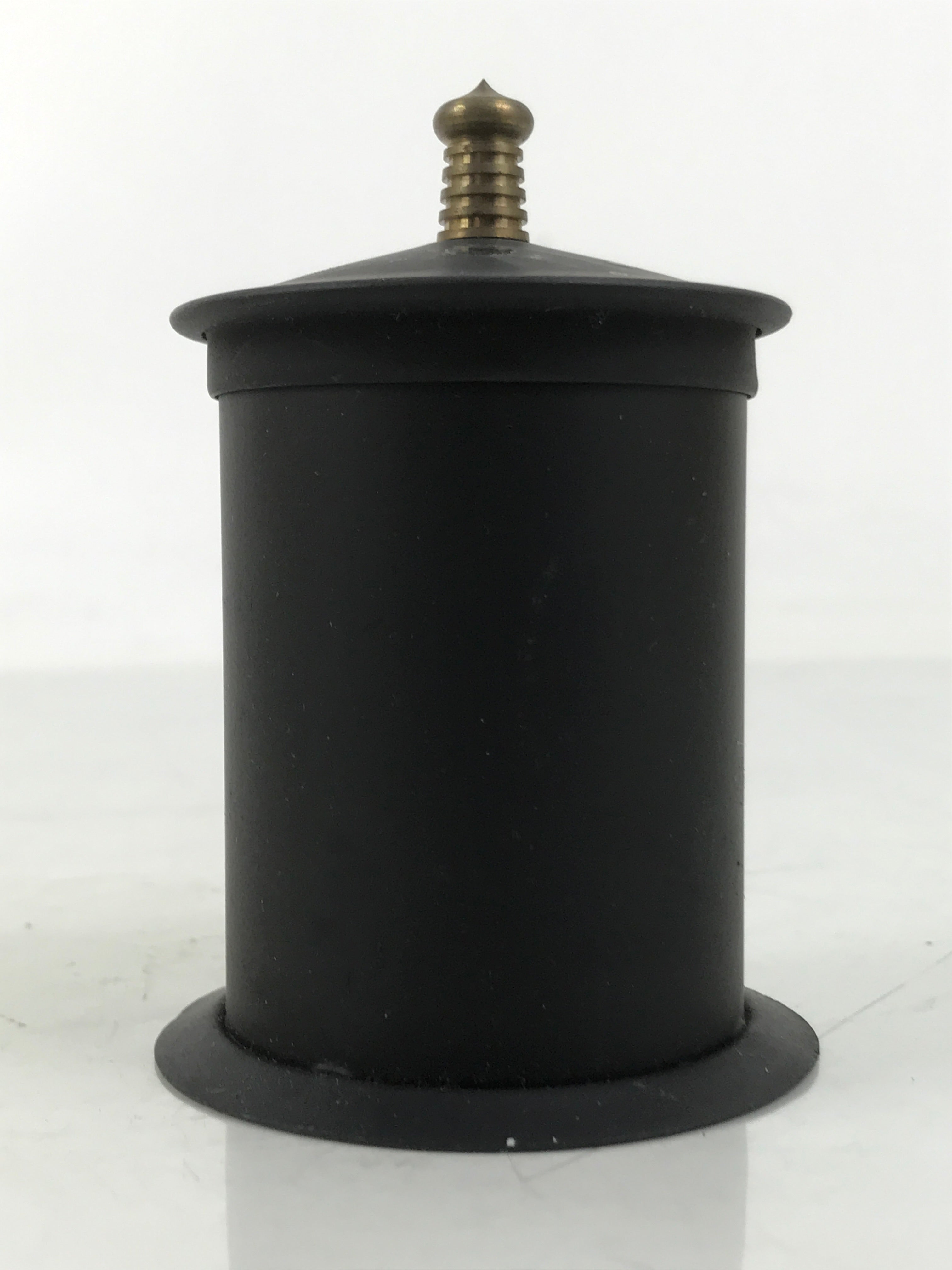 This item is a vintage metal matchstick extinguisher jar (hikeshi) made for use as an altar fitting in a Japanese Buddhist altar.  It is a tool that can safely dispose of matches after lighting candles or incense by inserting a used matchstick into the hole in the lid. It is mostly black and cylindrical with the exception of the brown metal finial on the lid.