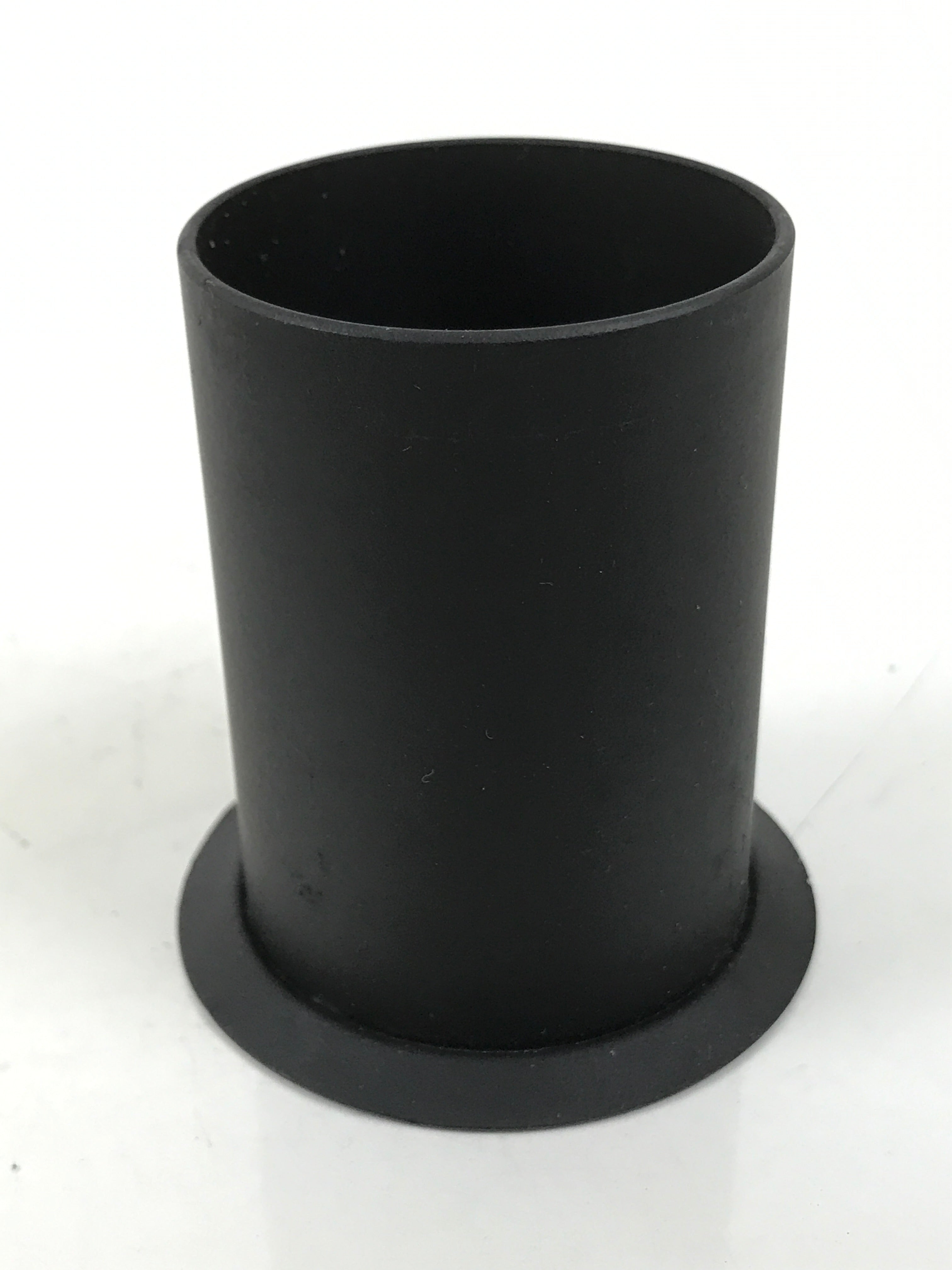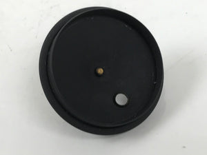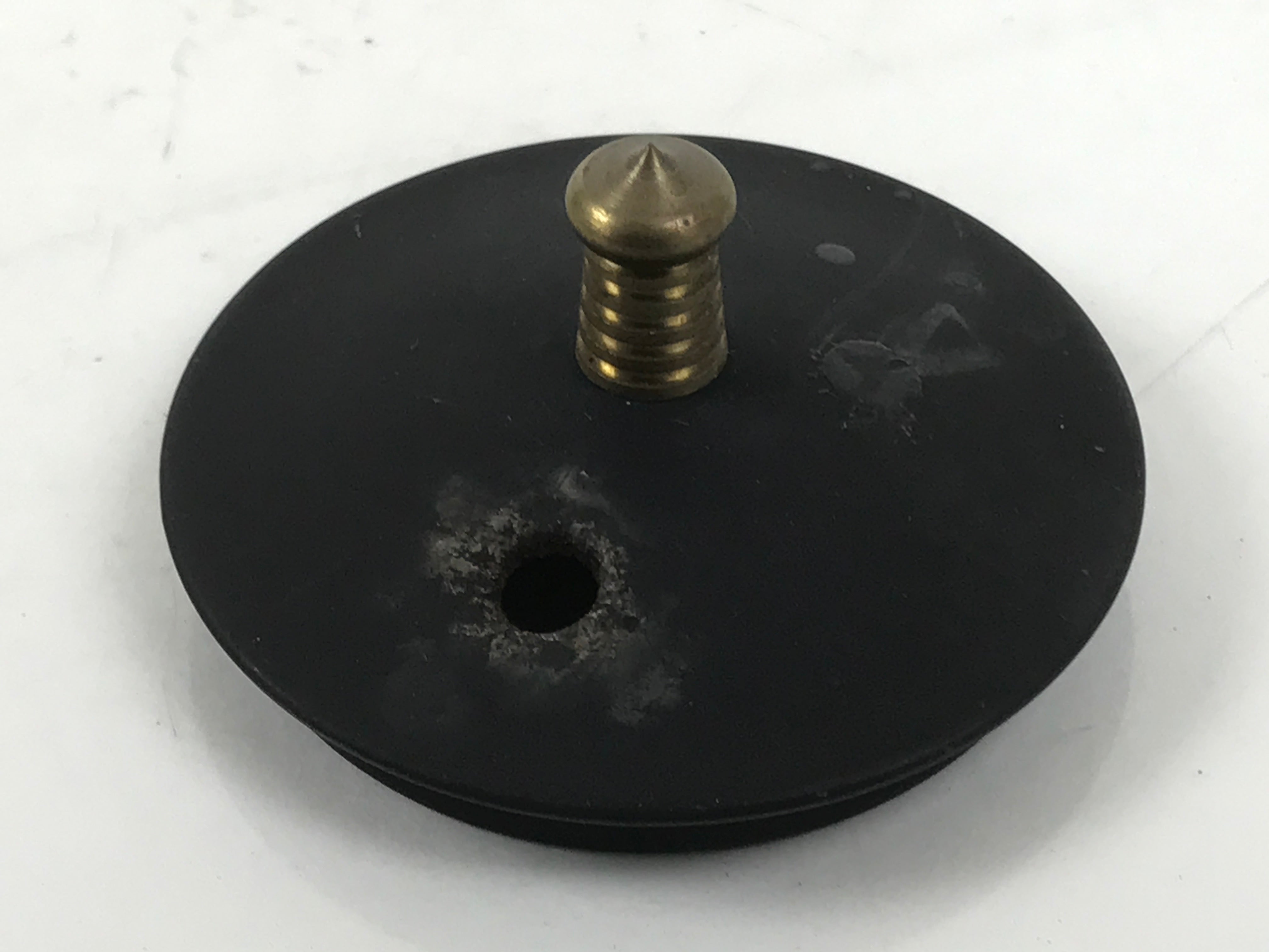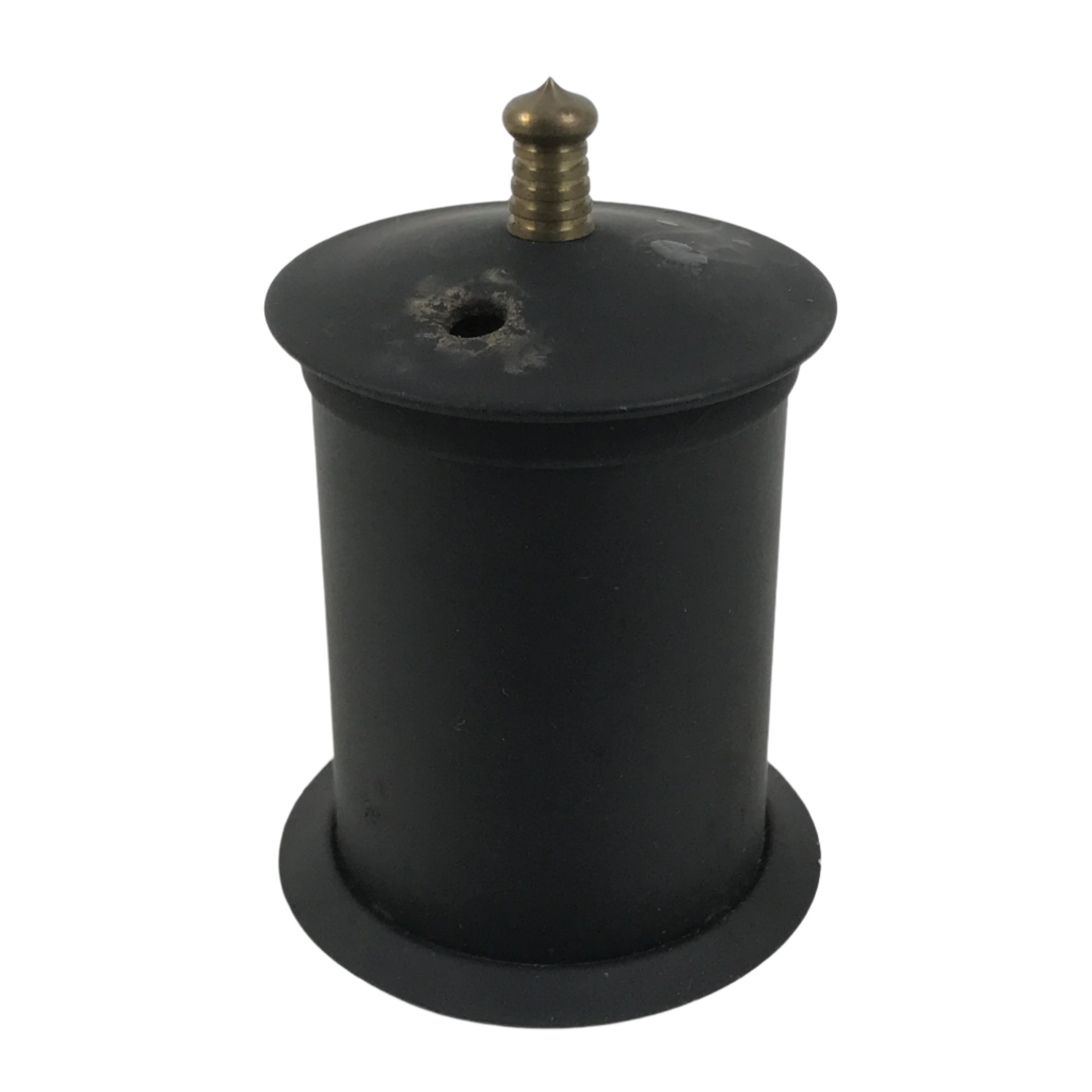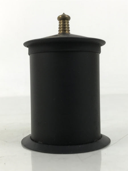 This item is a vintage metal matchstick extinguisher jar (hikeshi) made for use as an altar fitting in a Japanese Buddhist altar.  It is a tool that can safely dispose of matches after lighting candles or incense by inserting a used matchstick into the hole in the lid. It is mostly black and cylindrical with the exception of the brown metal finial on the lid.