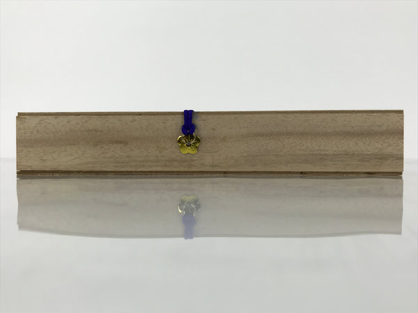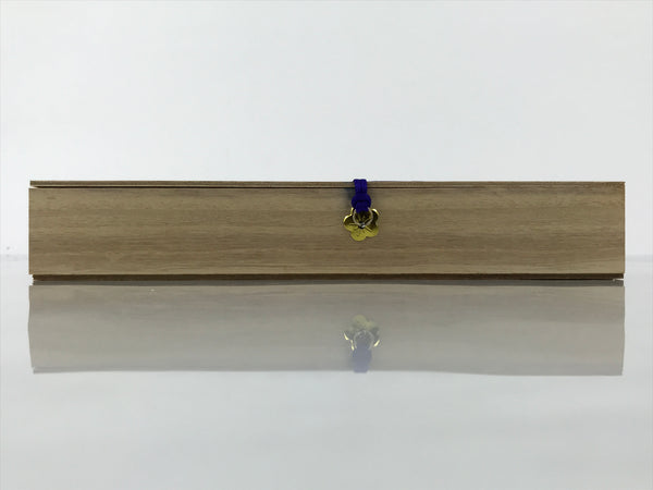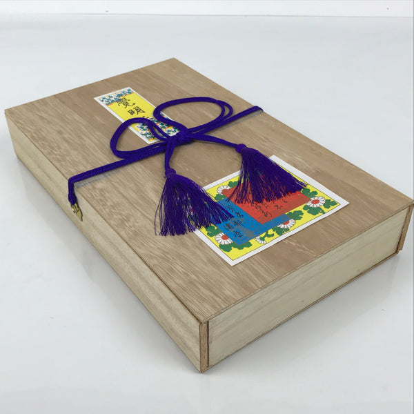 These are vintage Japanese Buddhist o-senko, incense sticks cased in a wooden box. It contains about four hundred and fifty-five sticks; seven bundles of incense sticks, and about sixty-five incense sticks in a bundle. Red paper bundling the sticks has a Japanese inscription. Purple string ties the wooden box and the lid, and the string is set with plum blossom-shaped metal parts on the box sides.