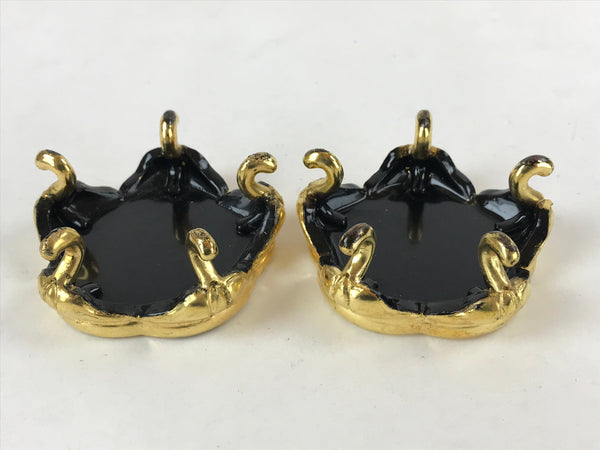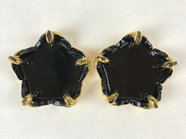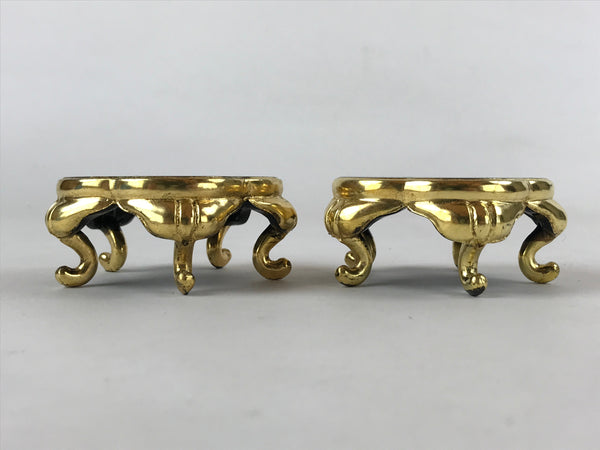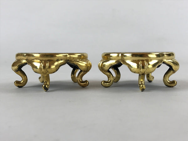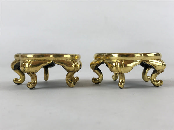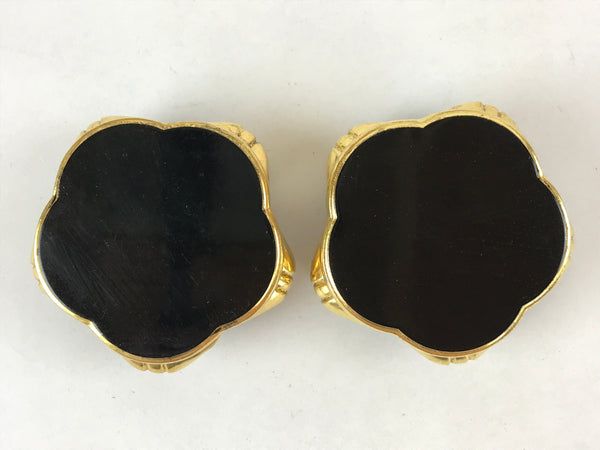 This is a pair of Japanese offering cup stands for a Buddhist altar. Also called bukki, this important altar accessory is gold and black and has an elegant plum blossom-shaped top surface. It stands on five curved gold legs. It is used often in pairs to hold small cups of rice, sake, and more as an offering to Buddha and one's ancestors.