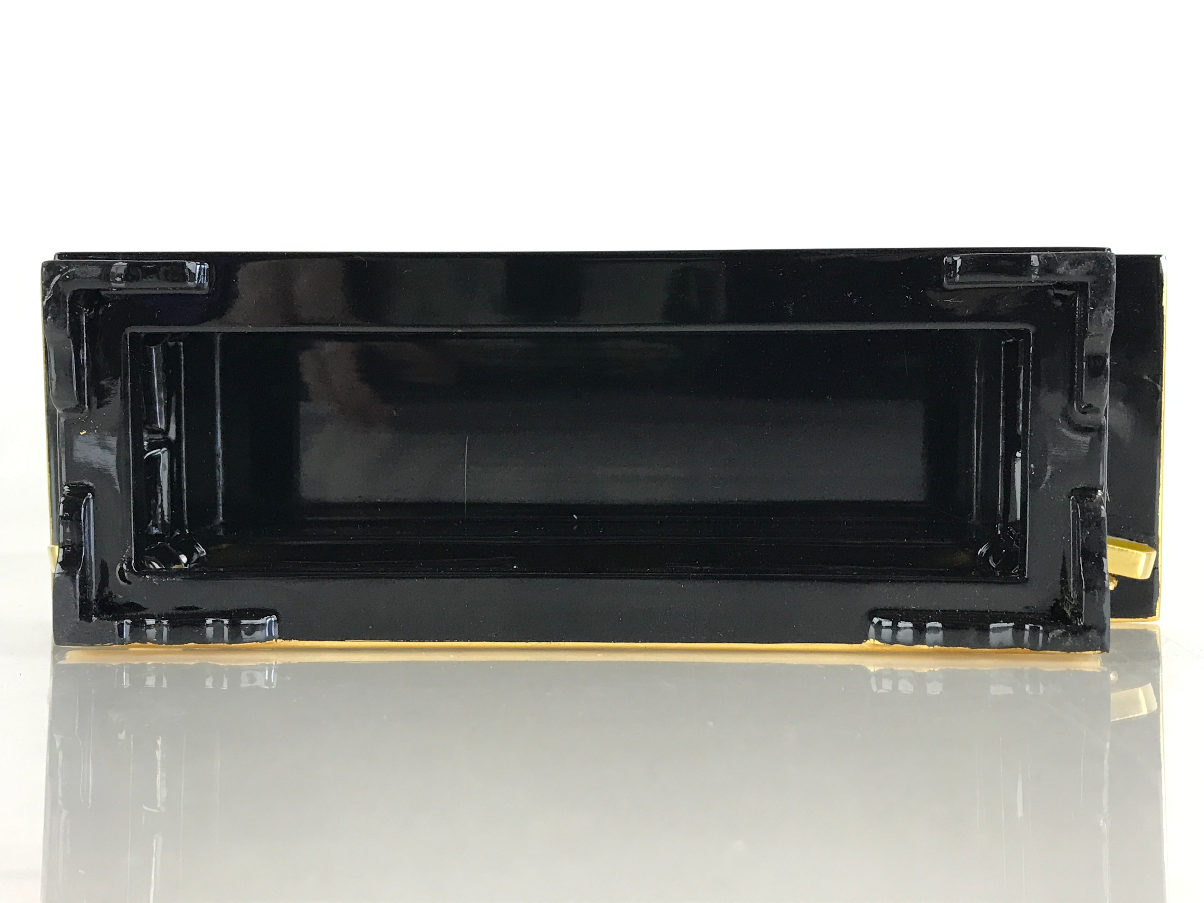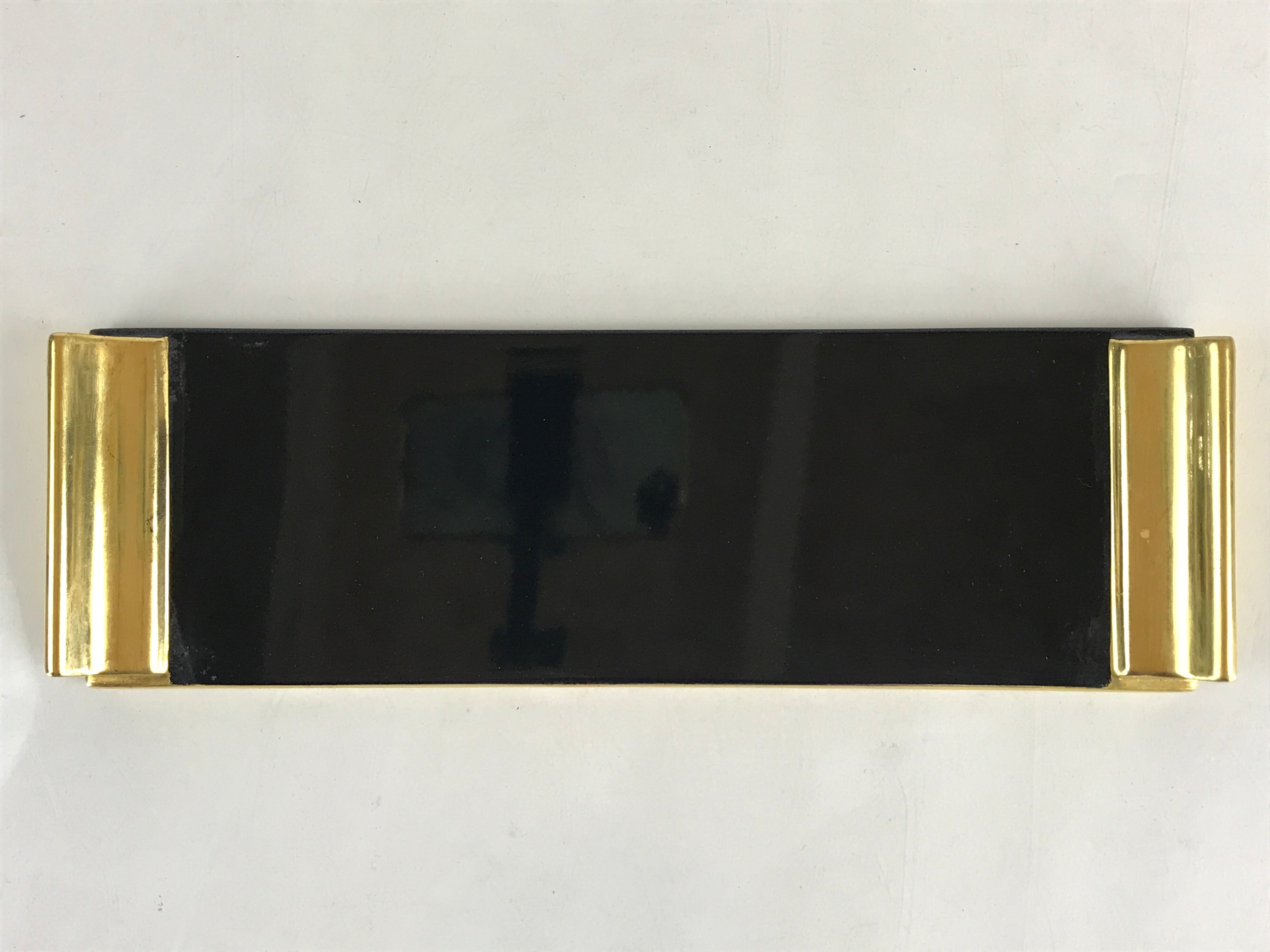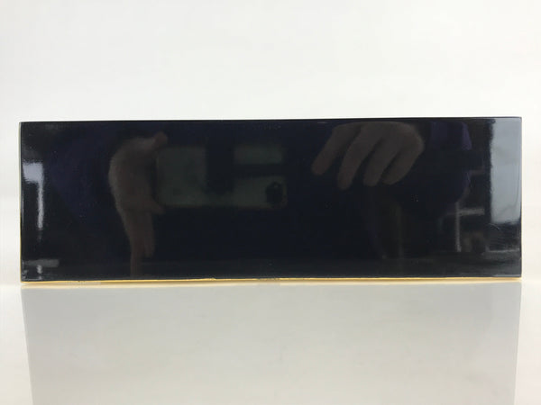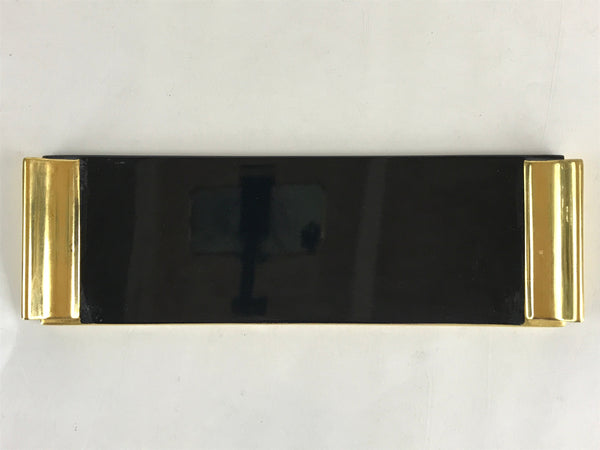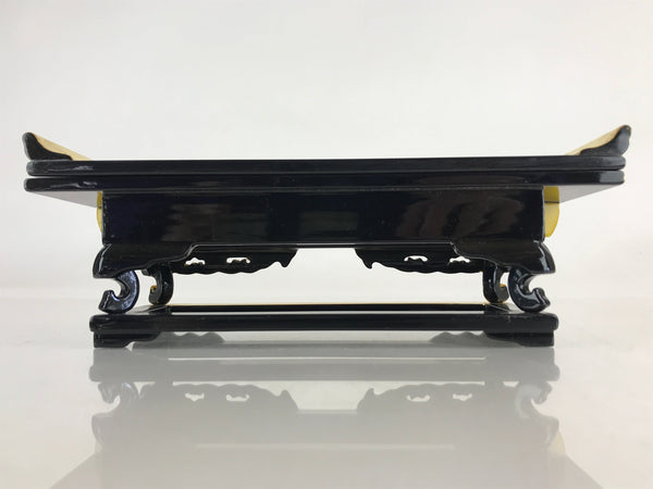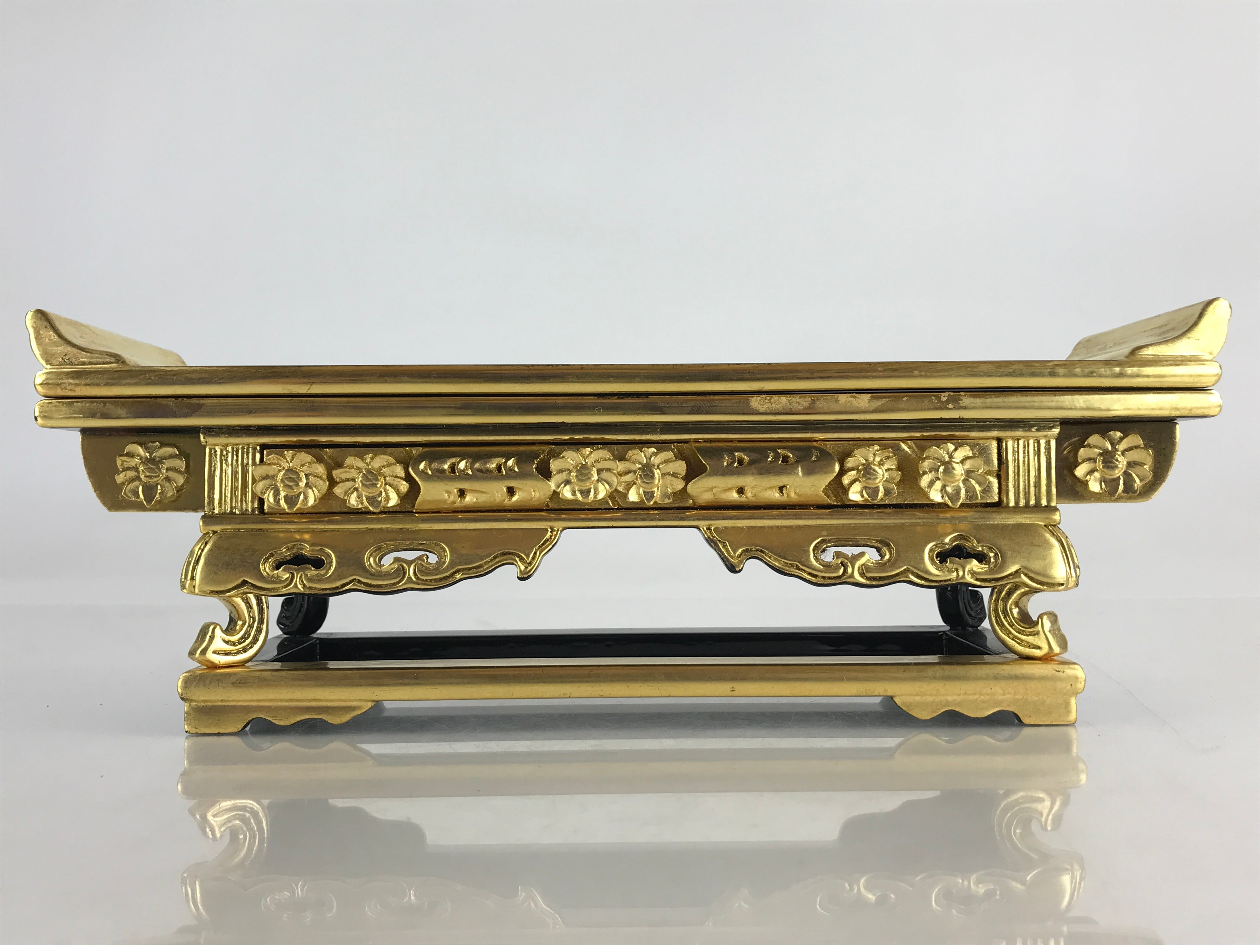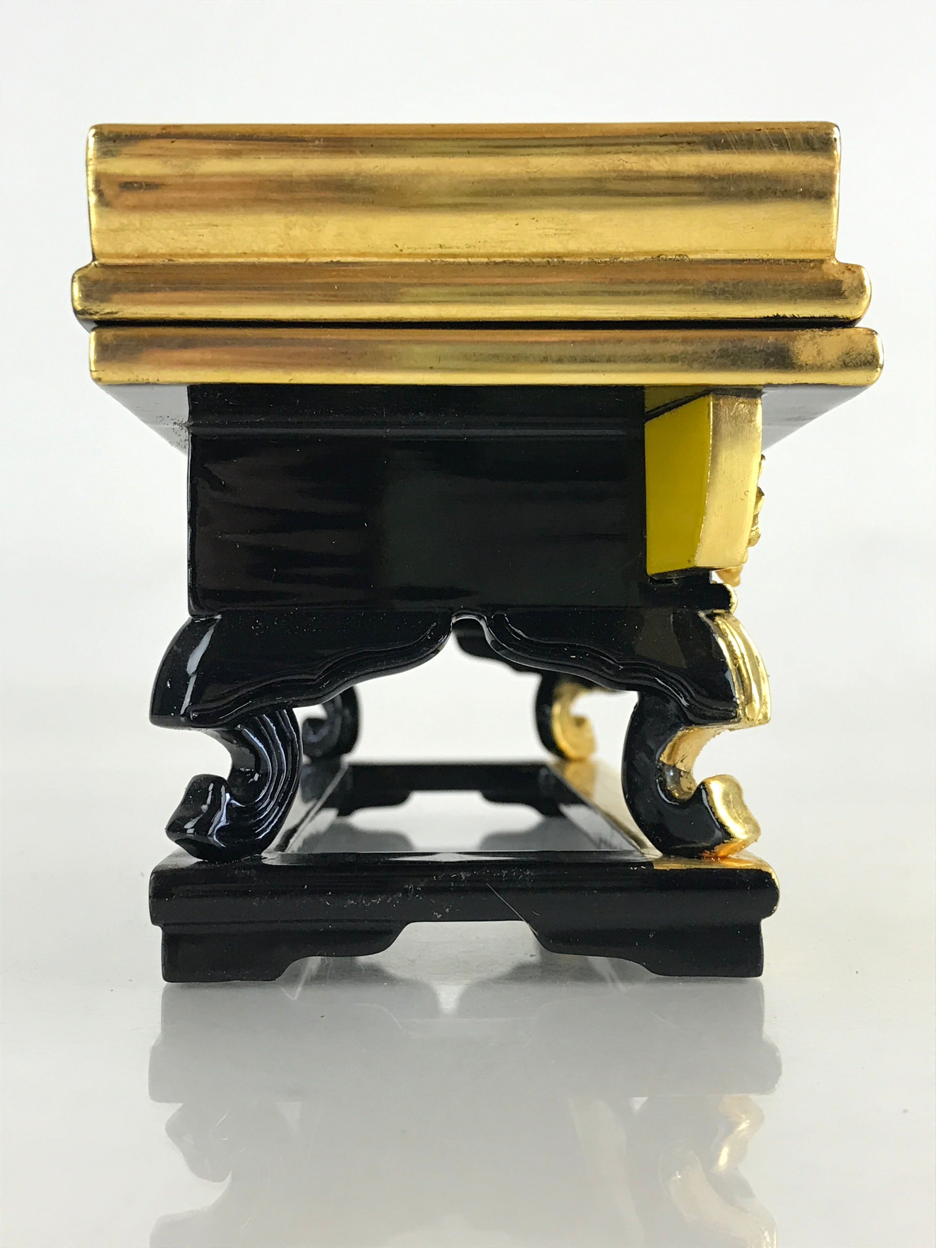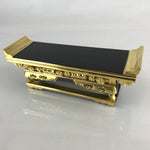 This is a vintage Japanese Buddhist altar fitting wooden offering table Maejyoku. It is coated with gold and black lacquer. The table top can be removed. In the case of memorial services, a piece of cloth called Uchishiki is inserted here. There are two types of offering tables Maejyoku and Uwajyoku. Maejoku is placed in front of the Shumidan. It is used for 3 Gusoku (candle stand, flower vase, and incense burner). Uwajoku is placed in front of Amidanyorai. It is used for a flower vase, a rice cup, and a kasha incense burner.