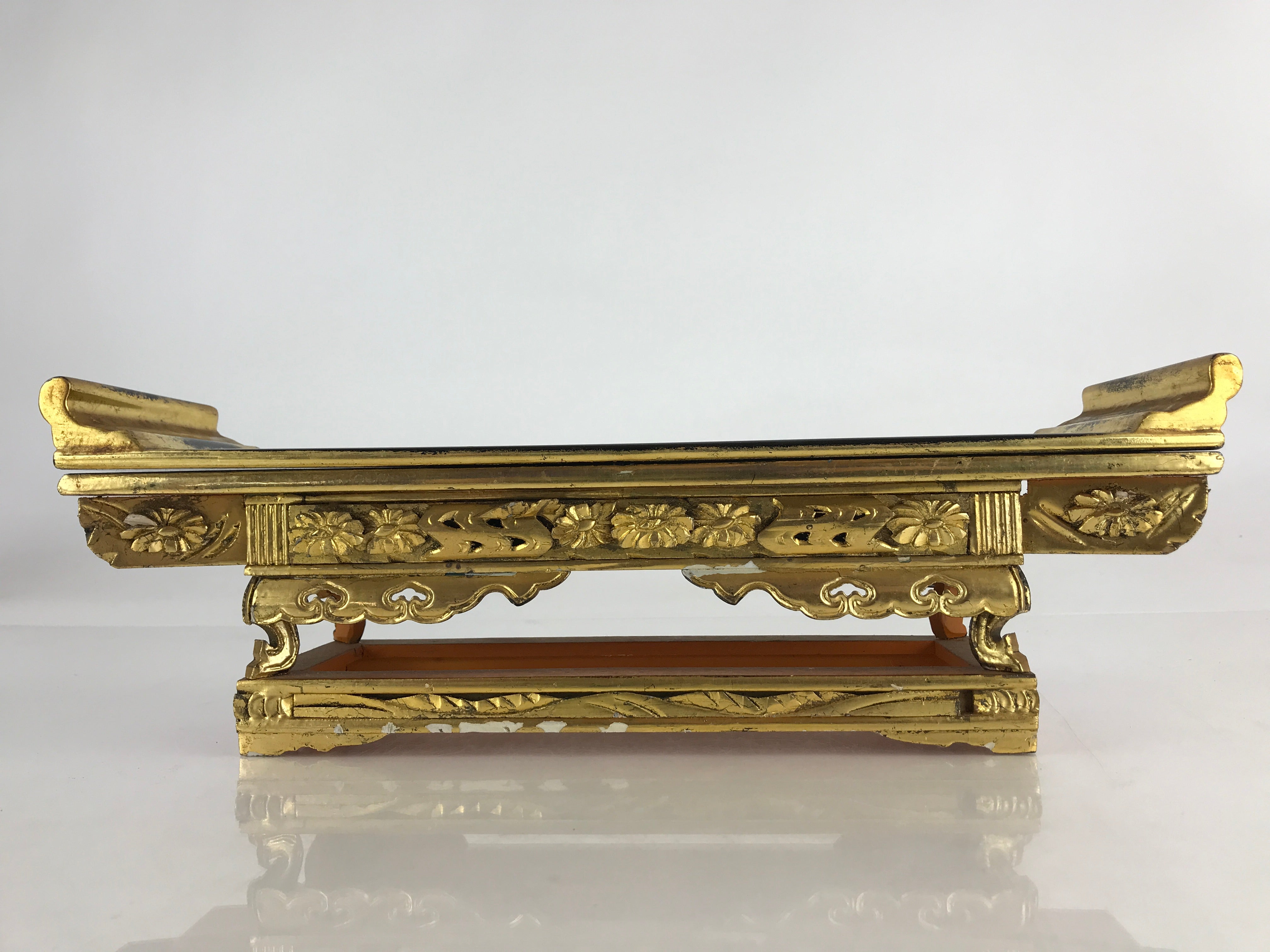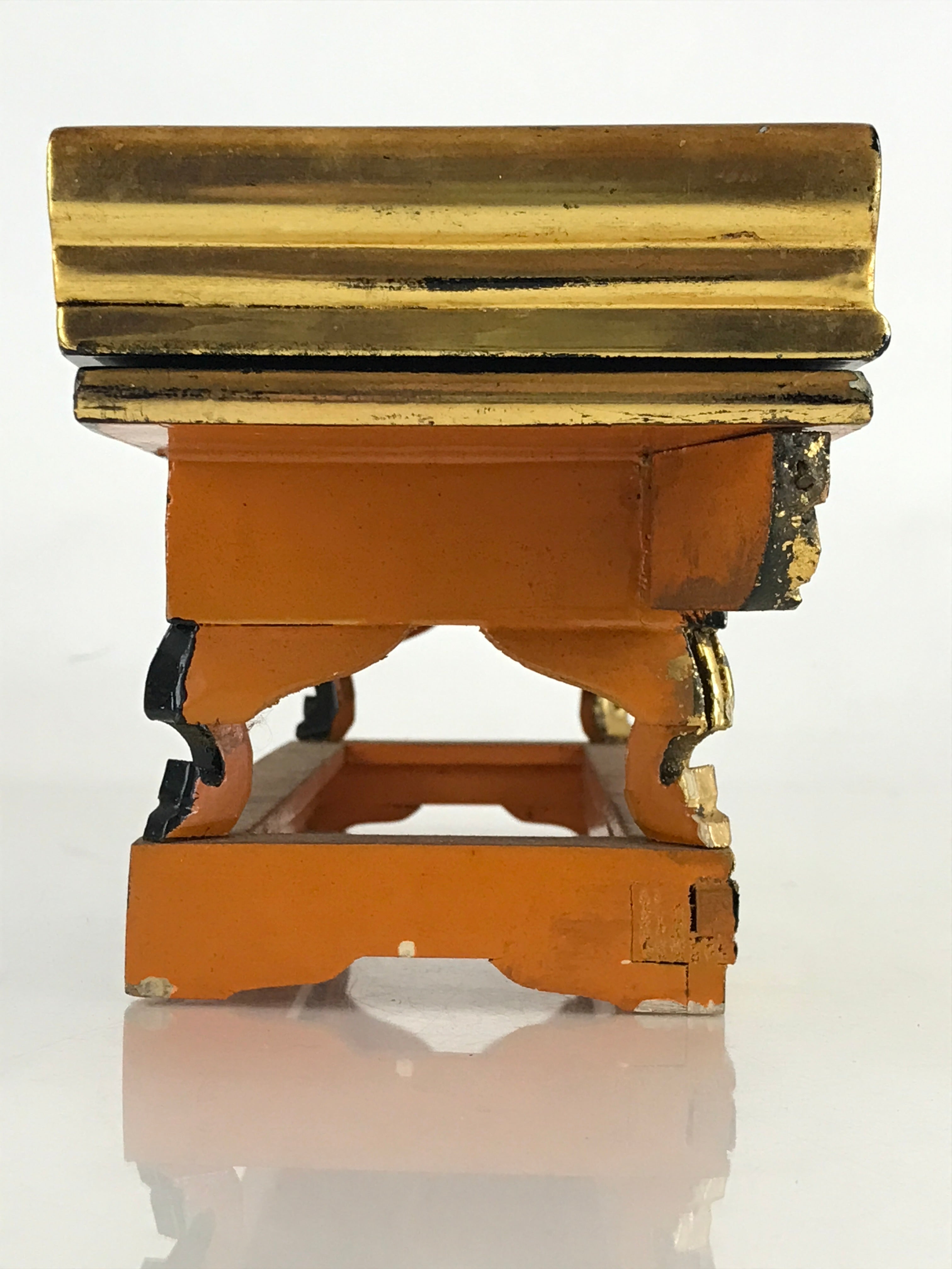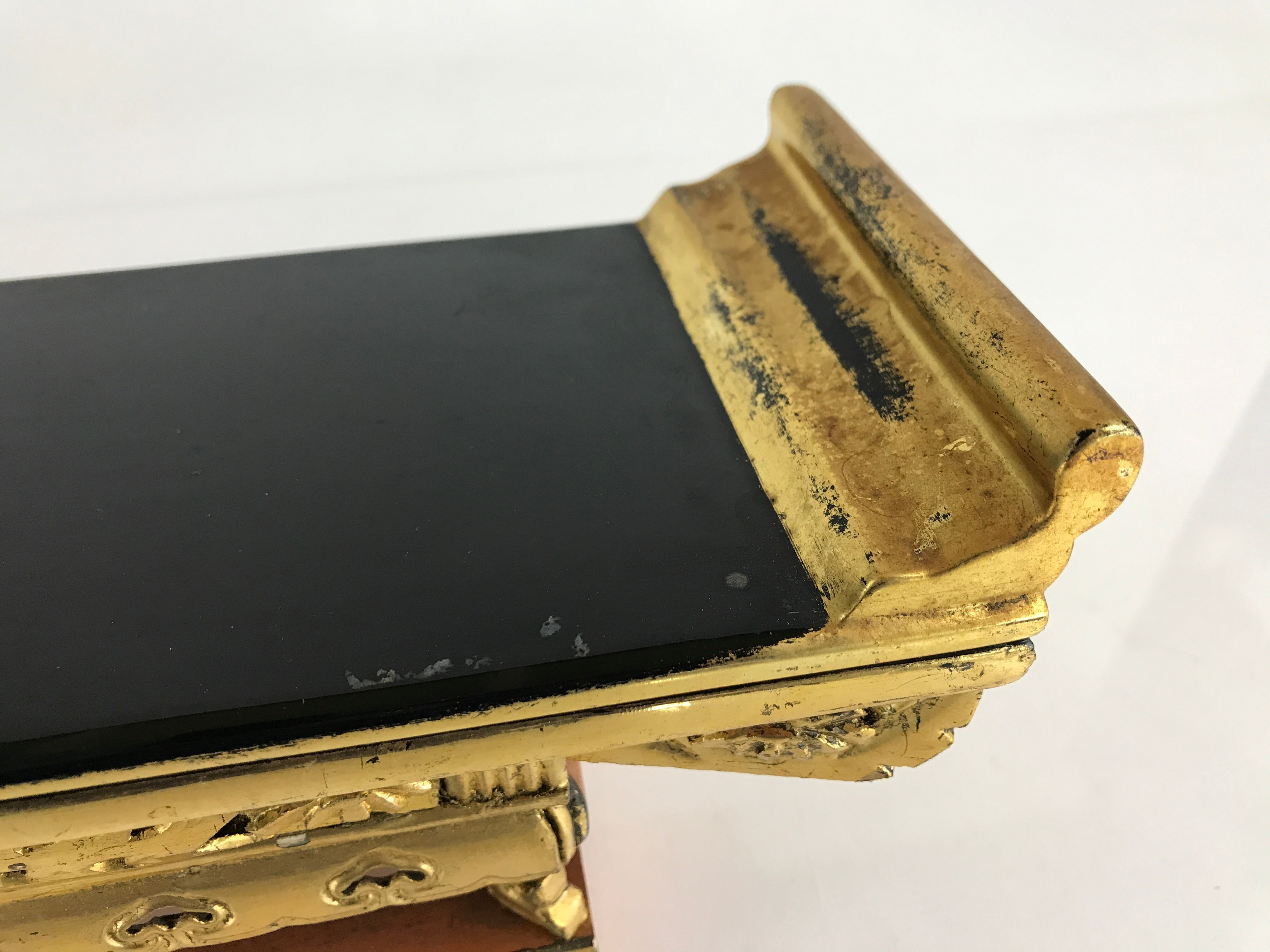 This is a vintage Japanese Buddhist altar fitting wooden offering table Maejyoku. It is coated with gold and black lacquer. The table top can be removed. In the case of memorial services, a piece of cloth called Uchishiki is inserted here. There are two types of offering tables Maejyoku and Uwajyoku. Maejoku is placed in front of the Shumidan. It is used for 3 Gusoku (candle stand, flower vase, and incense burner). Uwajoku is placed in front of Amidanyorai. It is used for a flower vase, a rice cup, and a kasha incense burner.
