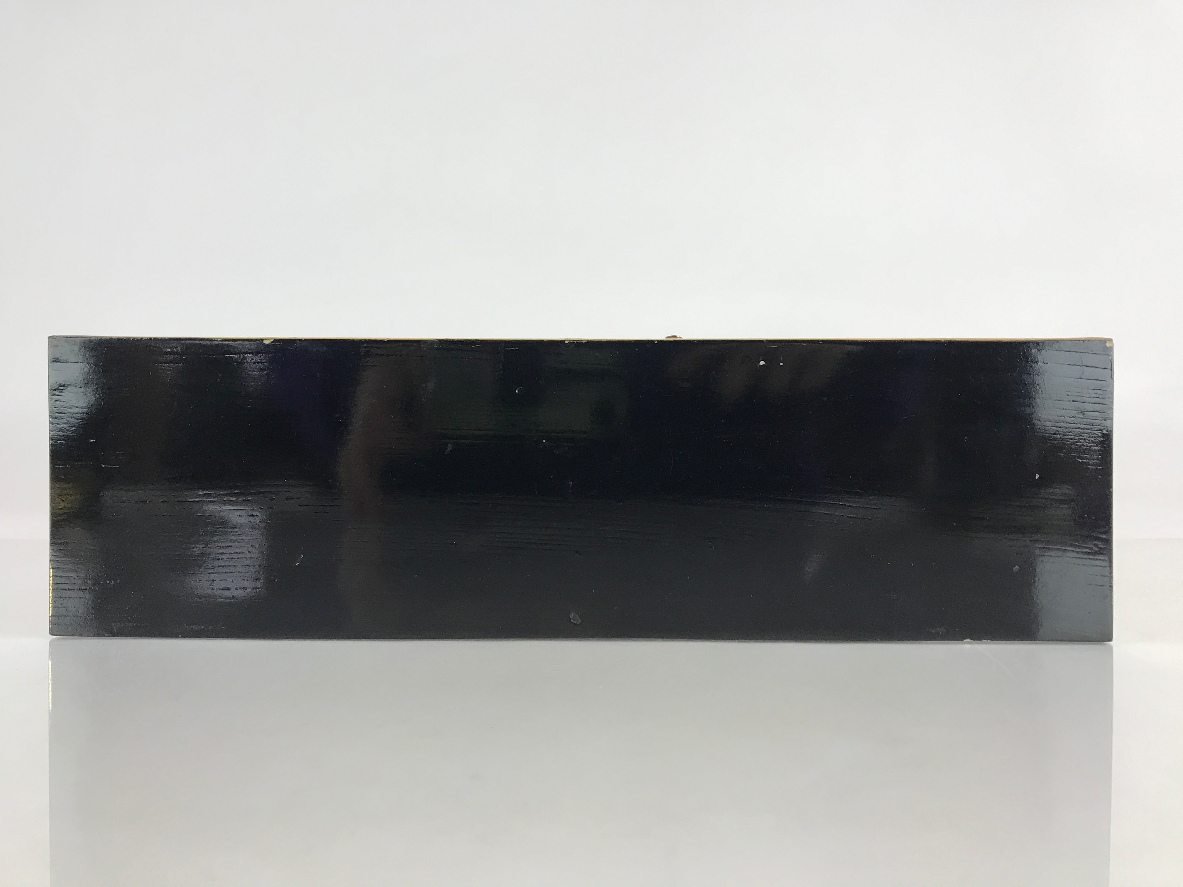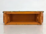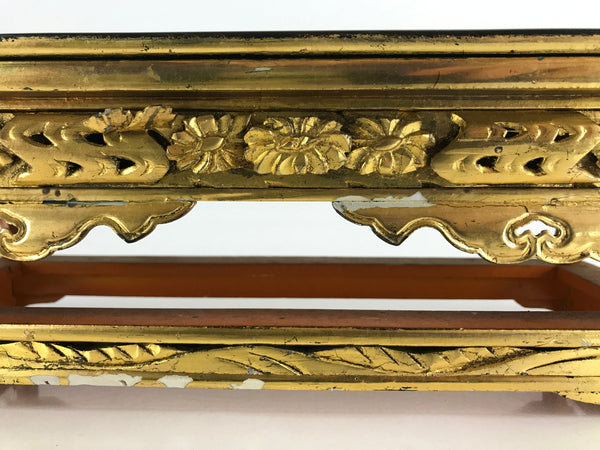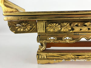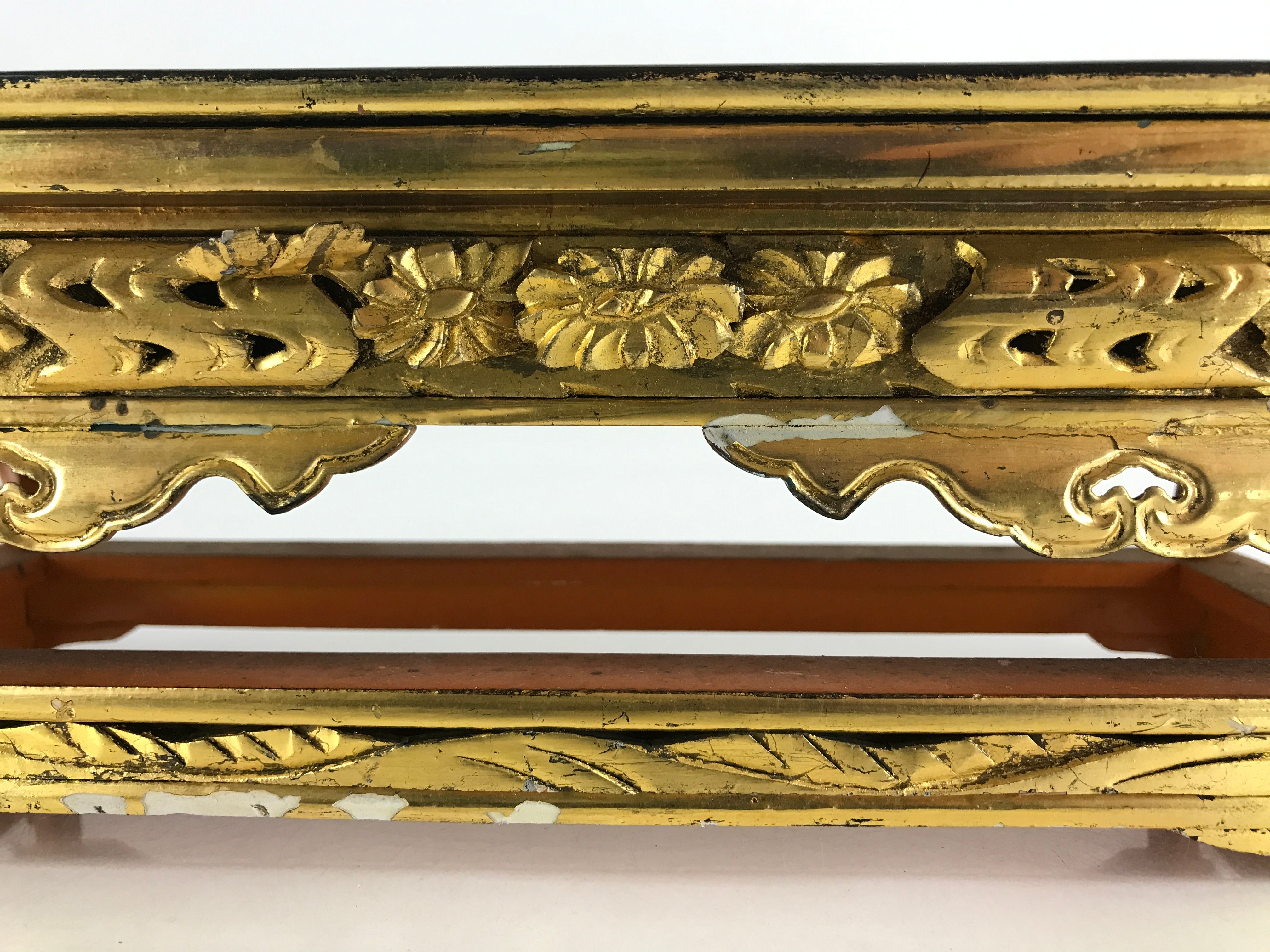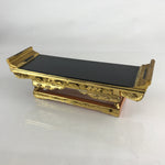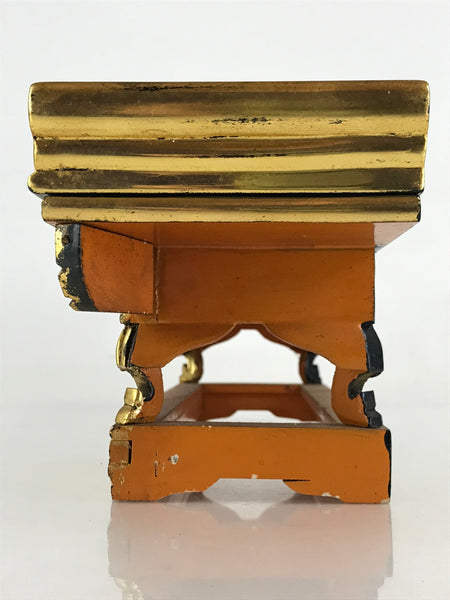This is a vintage Japanese Buddhist altar fitting wooden offering table Maejyoku. It is coated with gold and black lacquer. The table top can be removed. In the case of memorial services, a piece of cloth called Uchishiki is inserted here. There are two types of offering tables Maejyoku and Uwajyoku. Maejoku is placed in front of the Shumidan. It is used for 3 Gusoku (candle stand, flower vase, and incense burner). Uwajoku is placed in front of Amidanyorai. It is used for a flower vase, a rice cup, and a kasha incense burner.