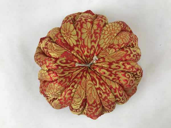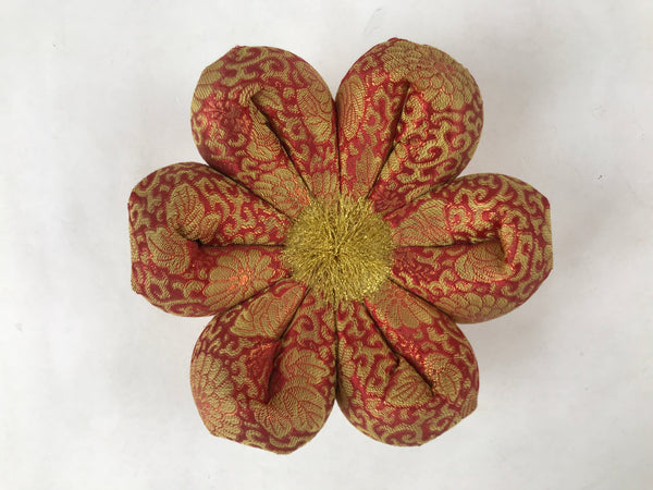 This is a large vintage Japanese orin bell for Buddhist altars. It contains a hammered bronze bowl with an animal skin-covered striker with a lacquered black handle. It rests on a red and gold silk flower-shaped pillow with a gold tassel. Singing bowls are sounded during ritual prayer.