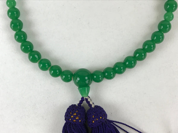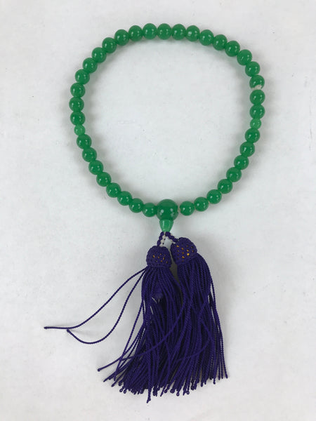 This is a vintage Japanese Buddhist prayer rosary bracelet, Juzu. It is made of green small beads. The main bead is bigger and has two attached purple tassels.