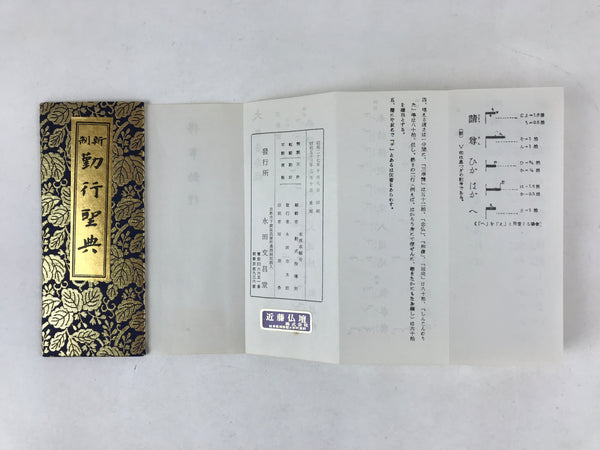 This is a vintage Japanese Buddhist sutra book. This book's title is Gongyo Seiten. This sutra book has a dark blue and gold cover and it has a green protective case. It was published in 1978 (Showa 53).