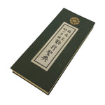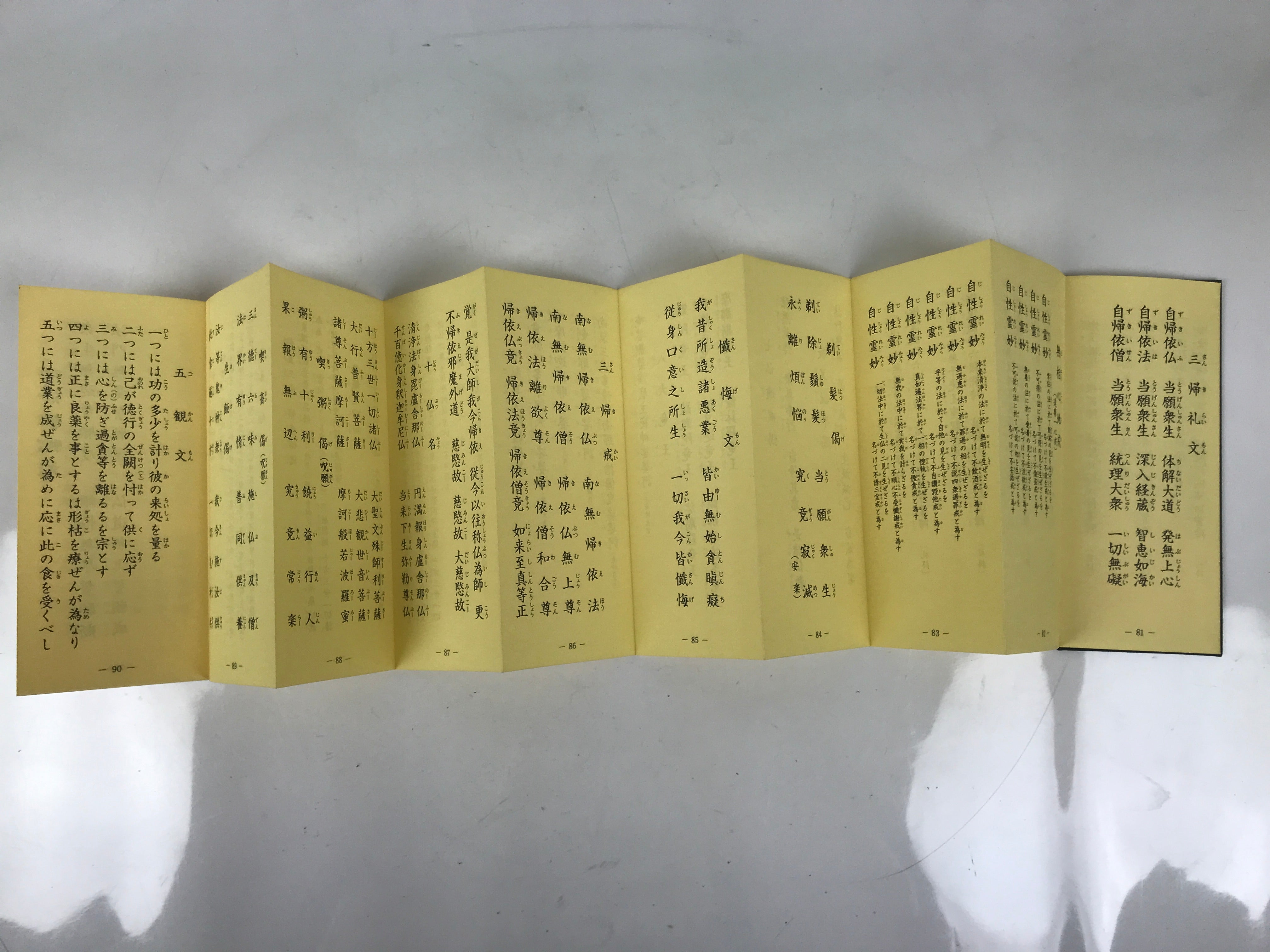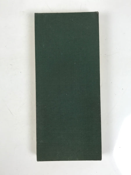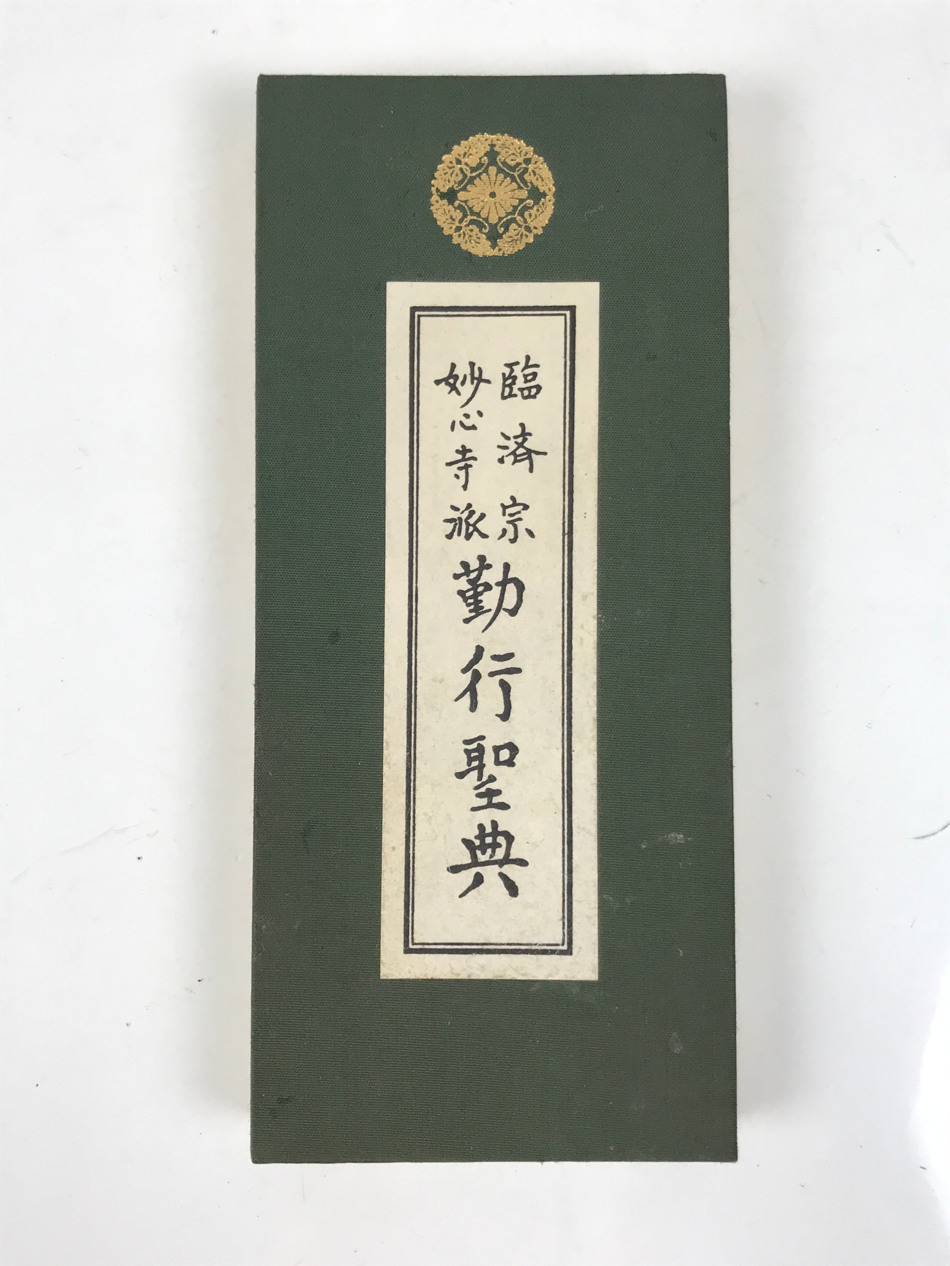 This vintage Japanese Buddhist book called Gongyo Seiten is for Rinzai school Myoshinji temple sect services. It is an accordion-type book with a dark green cover.