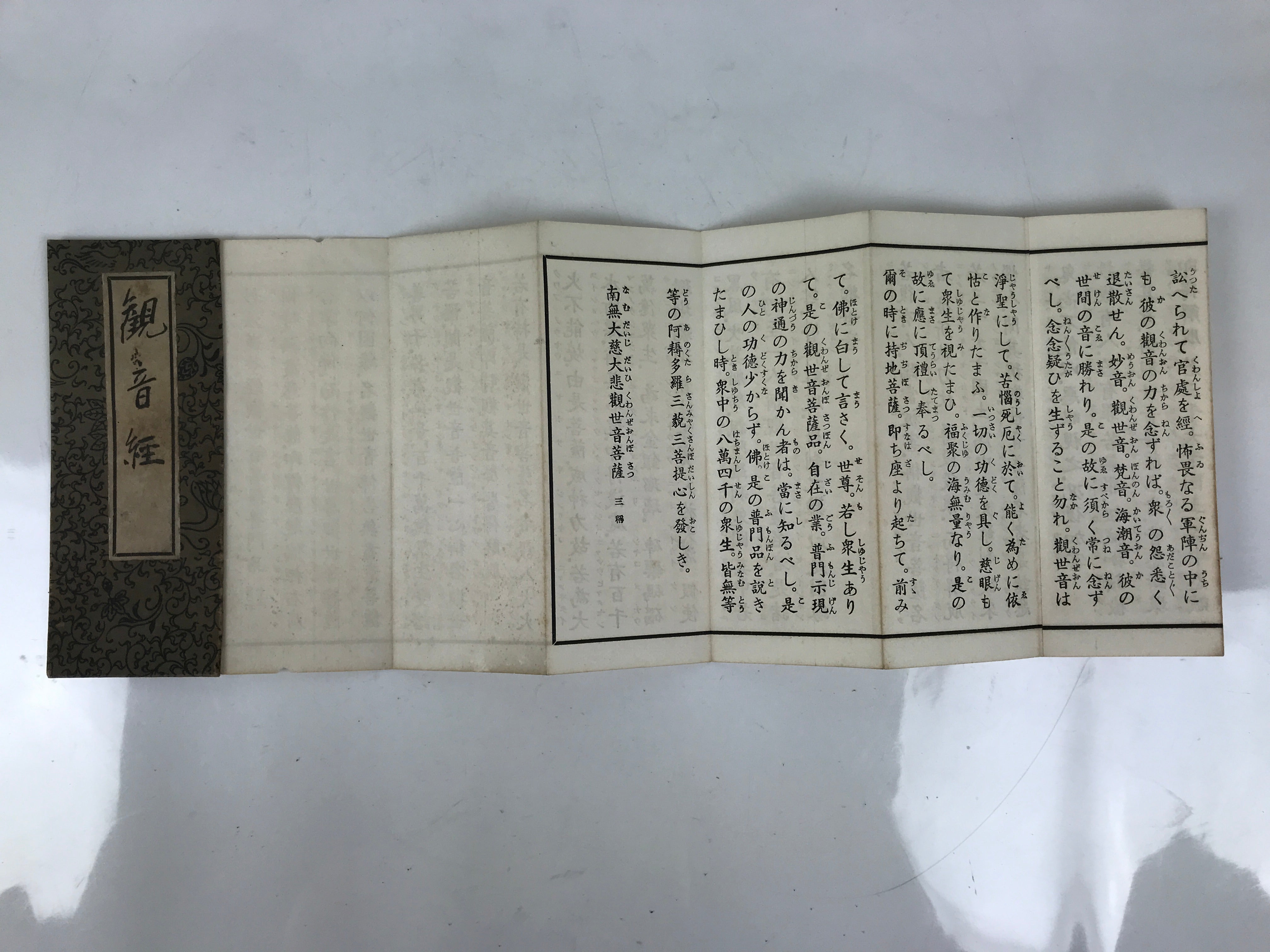 This vintage Japanese Buddhist book called Kannon-kyo (Universal Gateway, Chapter 25 of the Lotus Sutra) is an accordion-type book with a brown cover with a floral design.