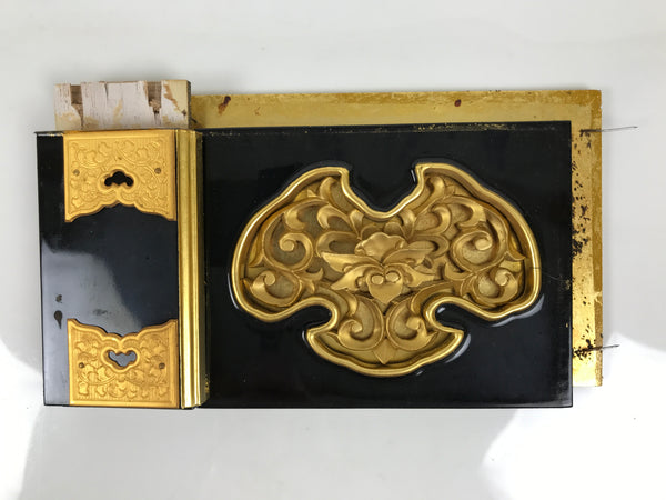This is a vintage Japanese part of a Buddhist altar. It is a very beautiful decorative panel crafted from wood. It features a carved design of a flower among vines inside a gold and black lacquered frame. A piece attached to the side is lacquered black to match and has brass metal plates attached with a subtle plant design. This piece was originally part of a Buddhist home altar (butsudan). It can be used as a spare part, for repair, or decoration.