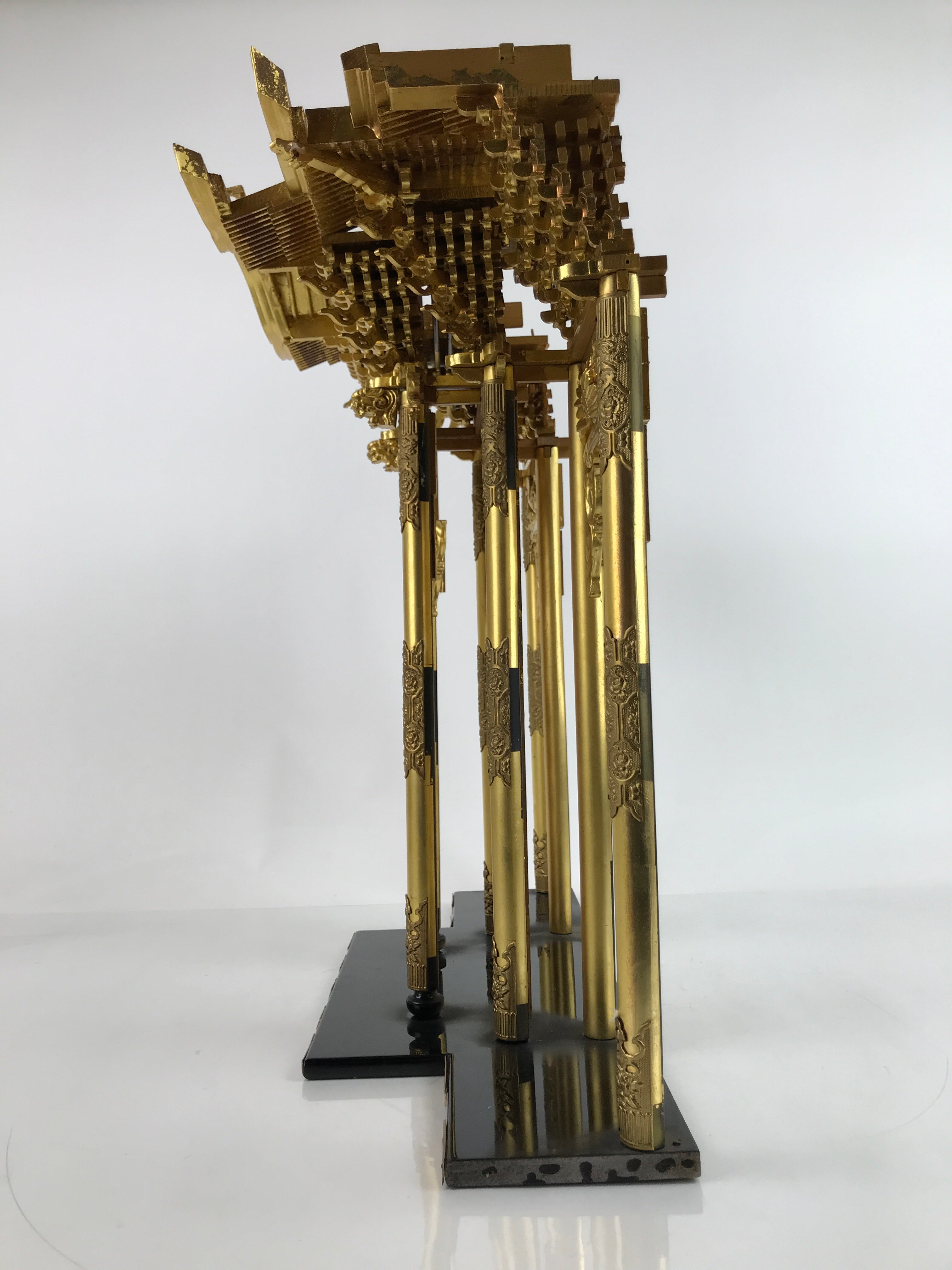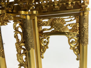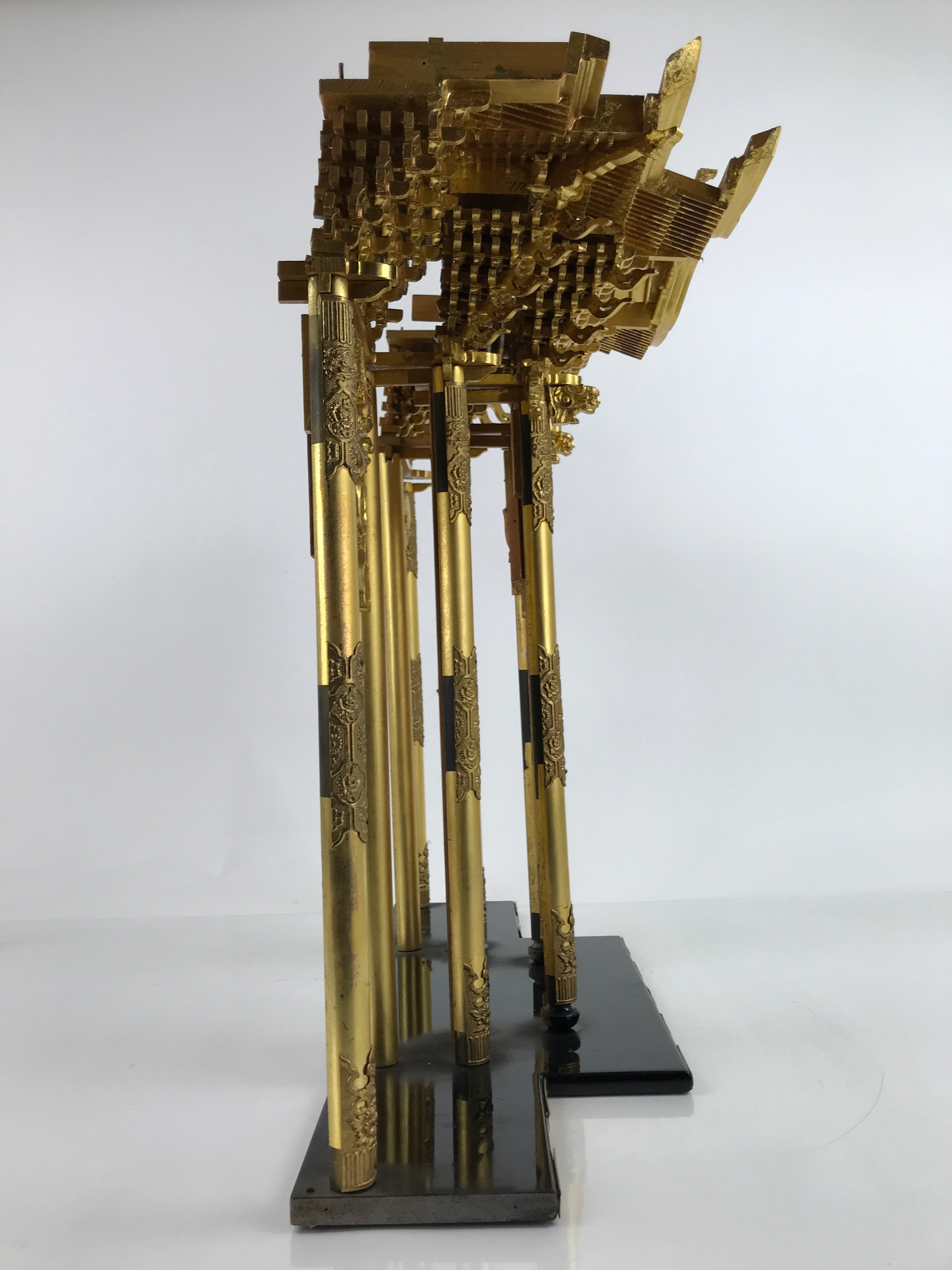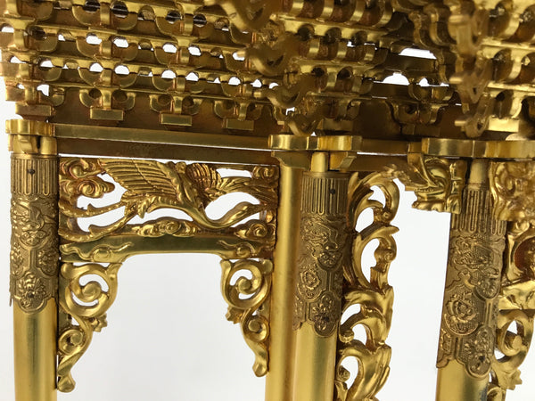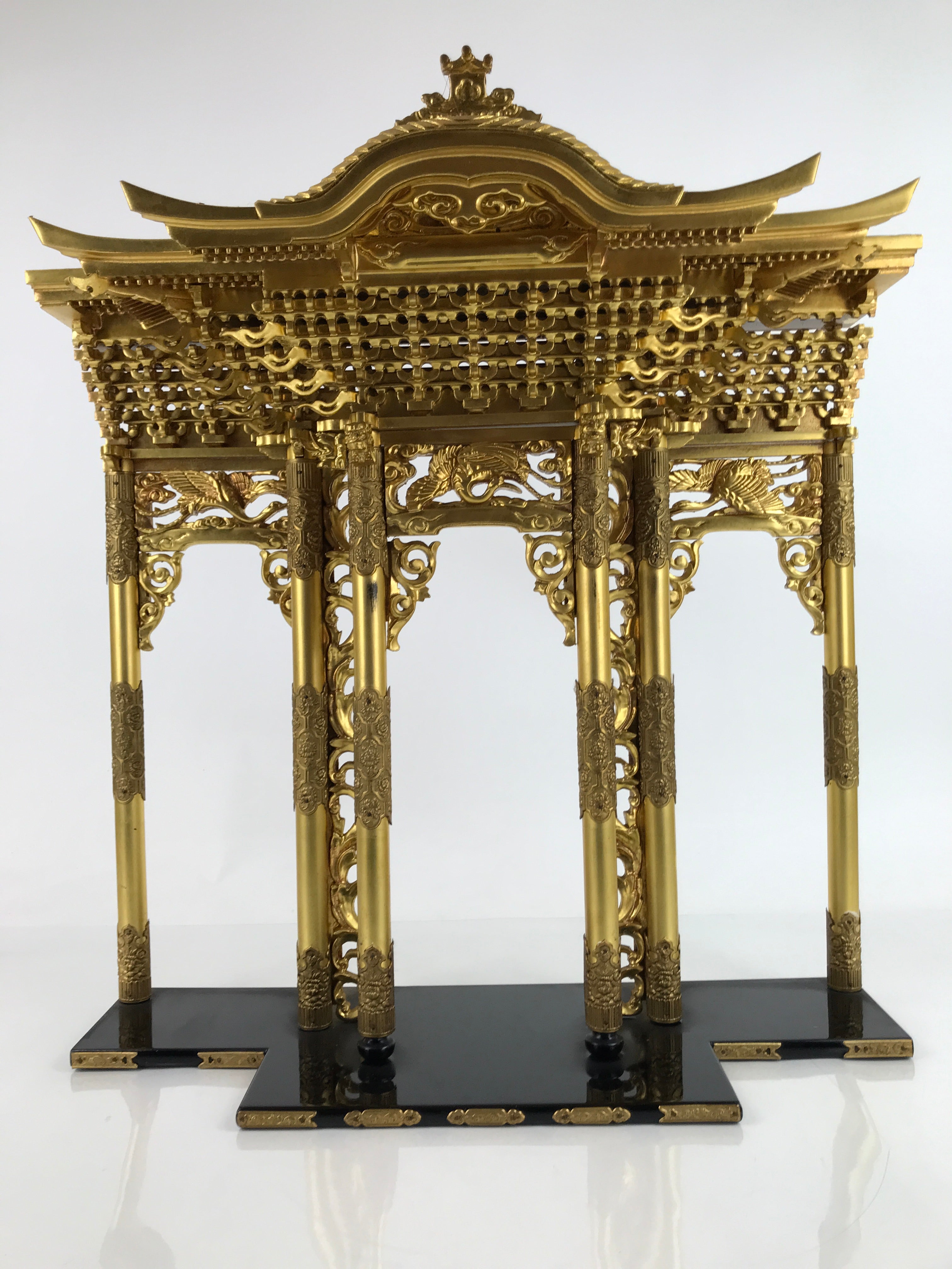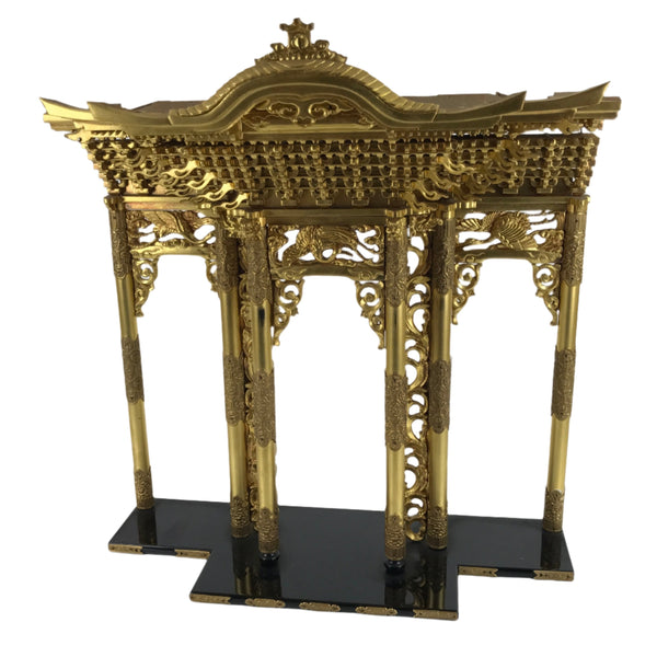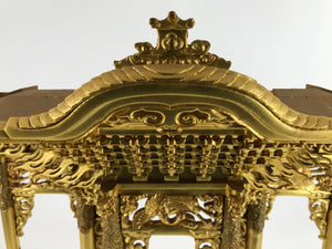This item is a large decorative part from a Japanese vintage wooden Buddhist altar cabinet. This piece is the inner temple and the main feature of the altar. Typically it houses a statue and small scrolls at the back. It is a stunning piece with 3D carved wood pieces and decorations exactly as one might see in a real Japanese temple. It is mostly gold with a black lacquered base and brass embellishments throughout. It has an embossed brass plate at the back depicting a pond scene. There are numerous bird and floral motifs throughout.