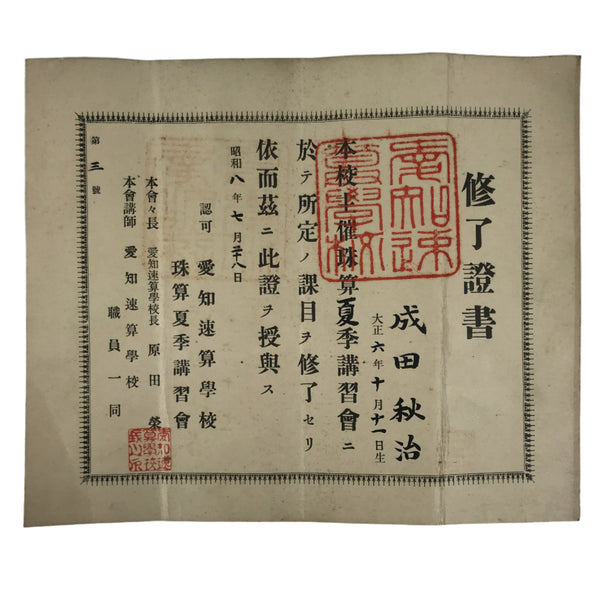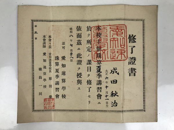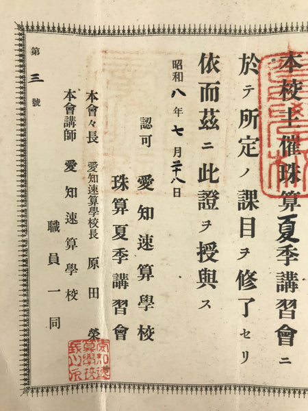 This vintage Japanese Soroban (Japanese abacus) calculation Summer camp completion certificate was issued in 1933 (Taisho 6) by a school called Rapid Calculation School in Aichi.