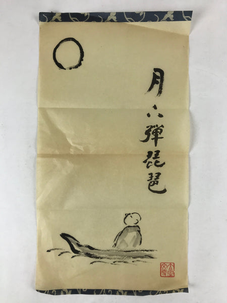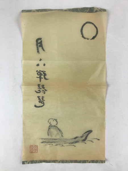 This item is a vintage printed reproduction of a calligraphy. It is in the vertical format and represents a monk sitting on a small boat on lake Biwa and contemplating the full moon. There is a poem to explain the scene. The calligraphy is signed with a red seal.
