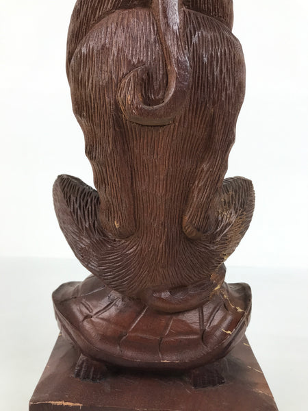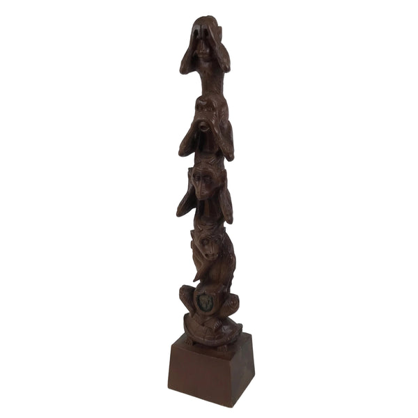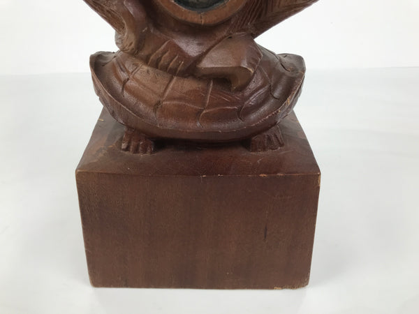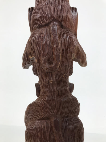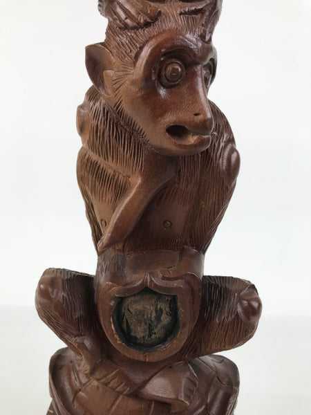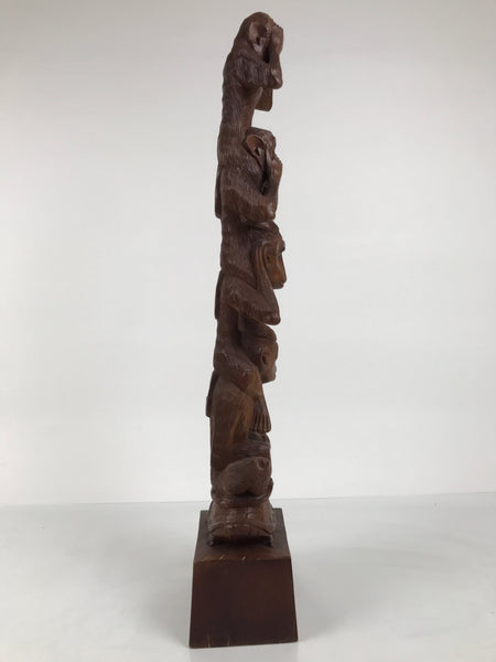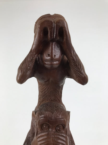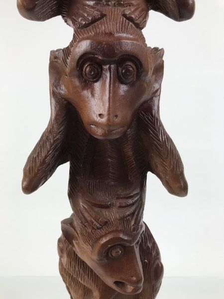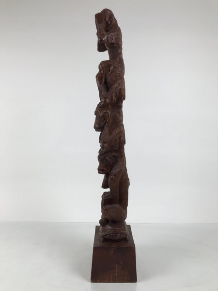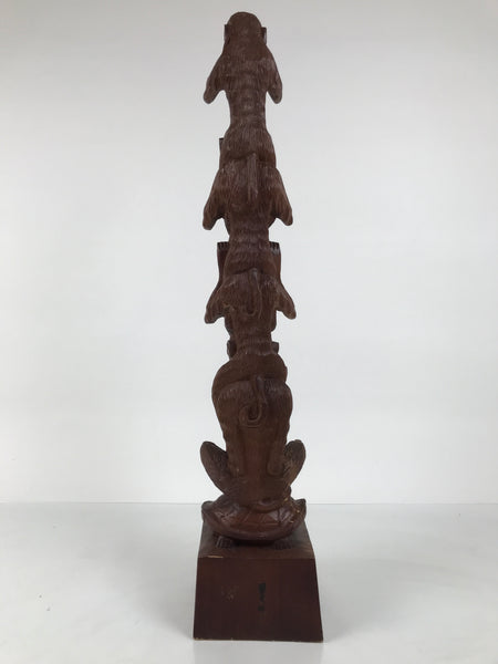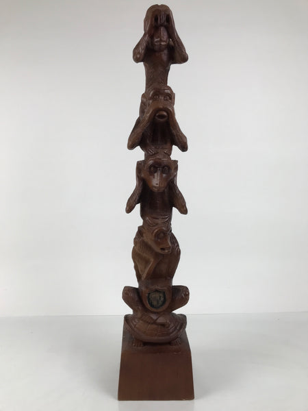 This is a vintage Japanese carved wooden statue of four monkeys stacked on top of a turtle. The three monkeys at the top are inspired by the popular figure of the three wise monkeys covering their ears, mouth, and eyes, but for this actual statue, the monkeys are not covering their body parts but placing their hands close to them to increase their hearing, voice, and sight. This wooden statue is carved from one solid piece of wood, and the base is squared for stability.