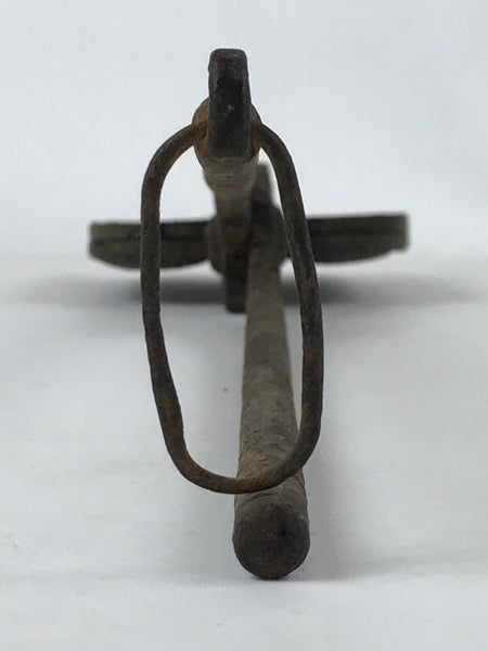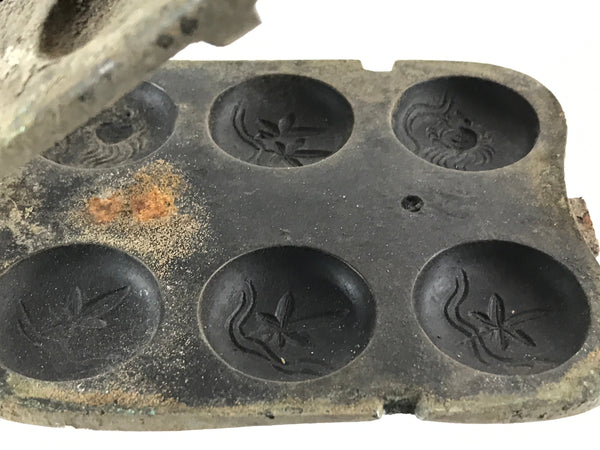 This is a vintage cast iron baking mold for making monaka shells. Monaka are a traditional Japanese sweets that consists of two thin wafer-like shells that are assembled together with red bean paste, cream, fruit, or other fillings. Today, these delicate confections are crafted by using electric presses. This piece is meant to be placed over fire or coals. It has six small round impressions of maple leaves and minogame turtles, and has an iron loop at the end to secure the mold shut during baking.