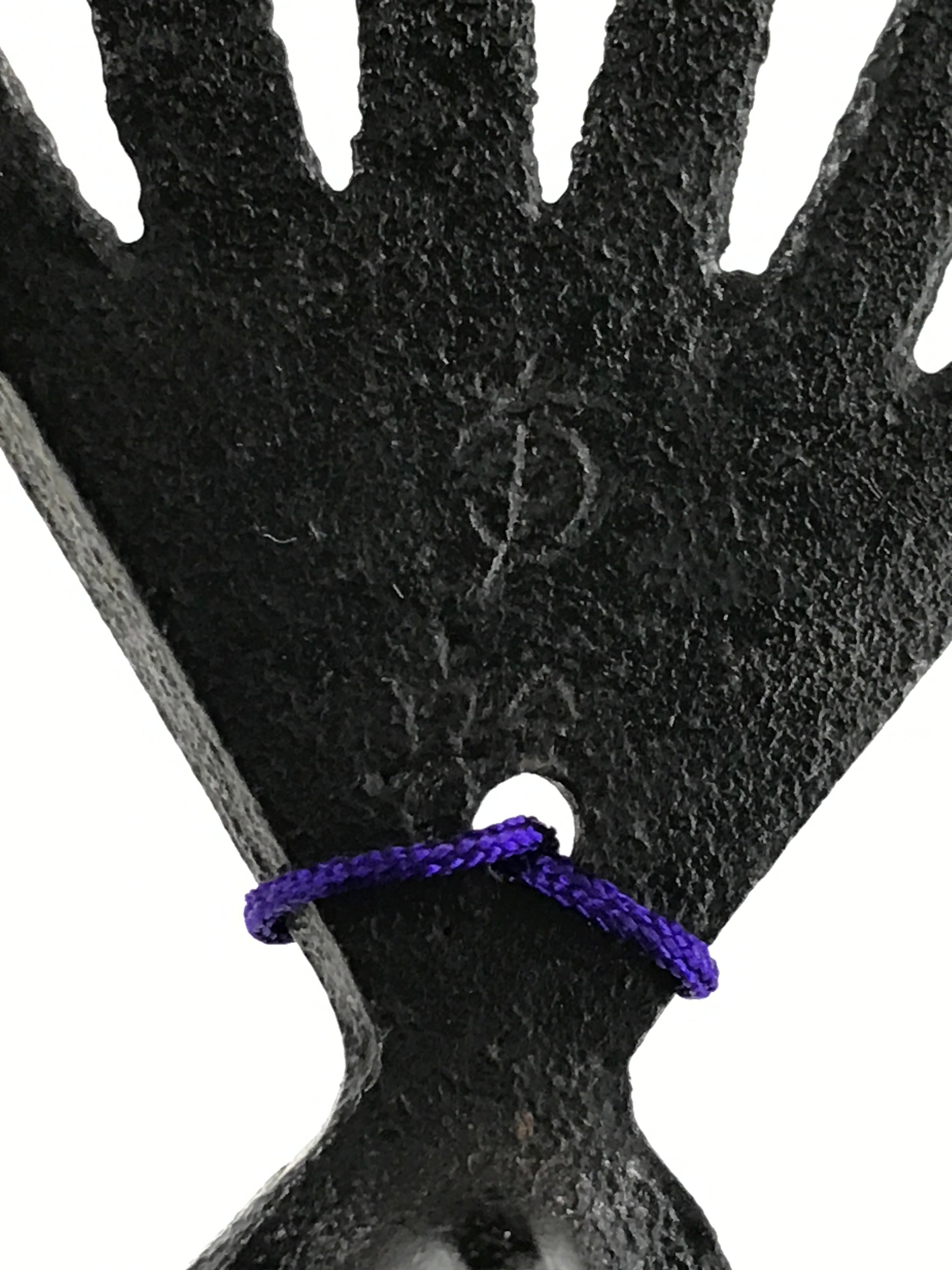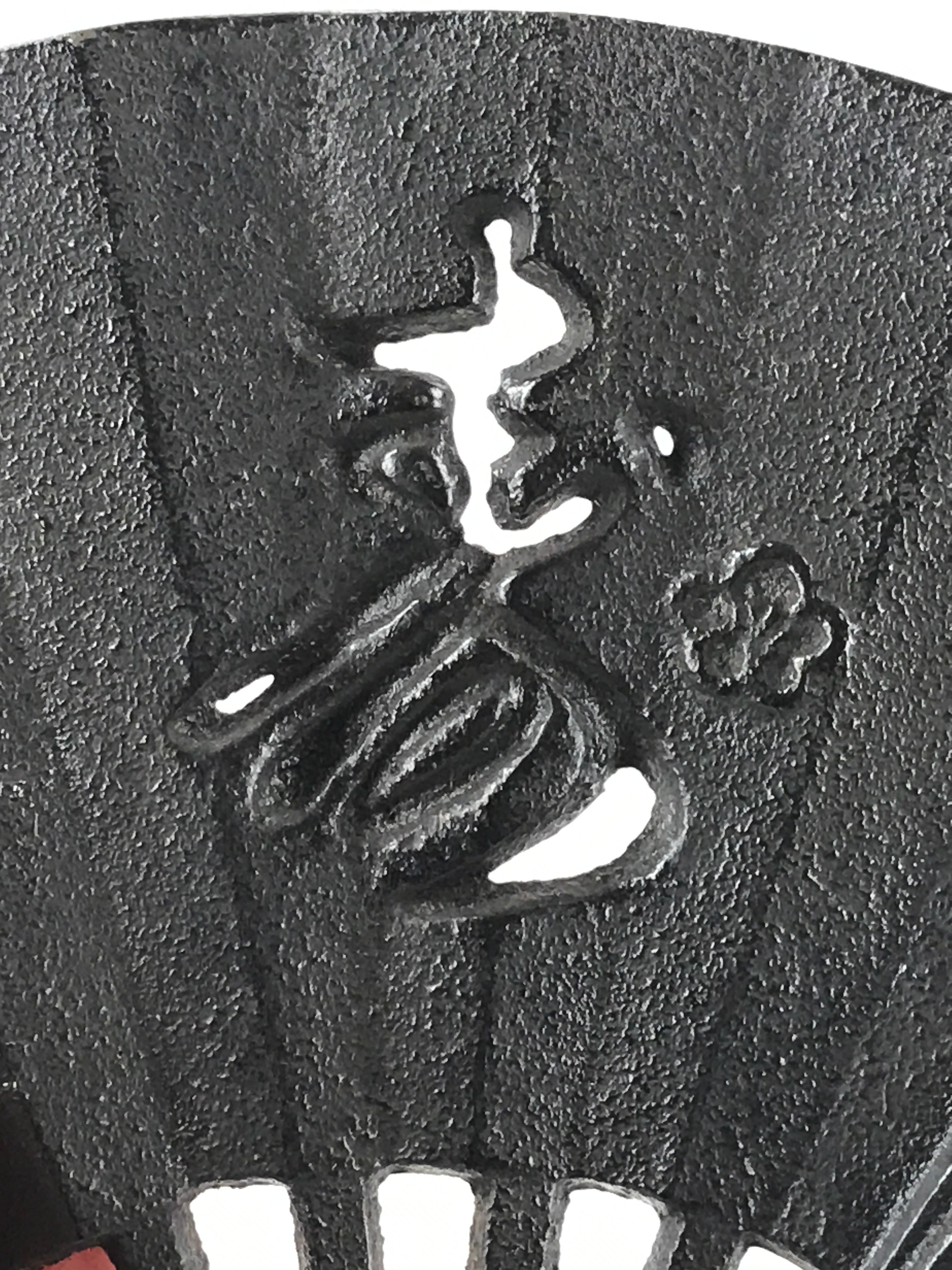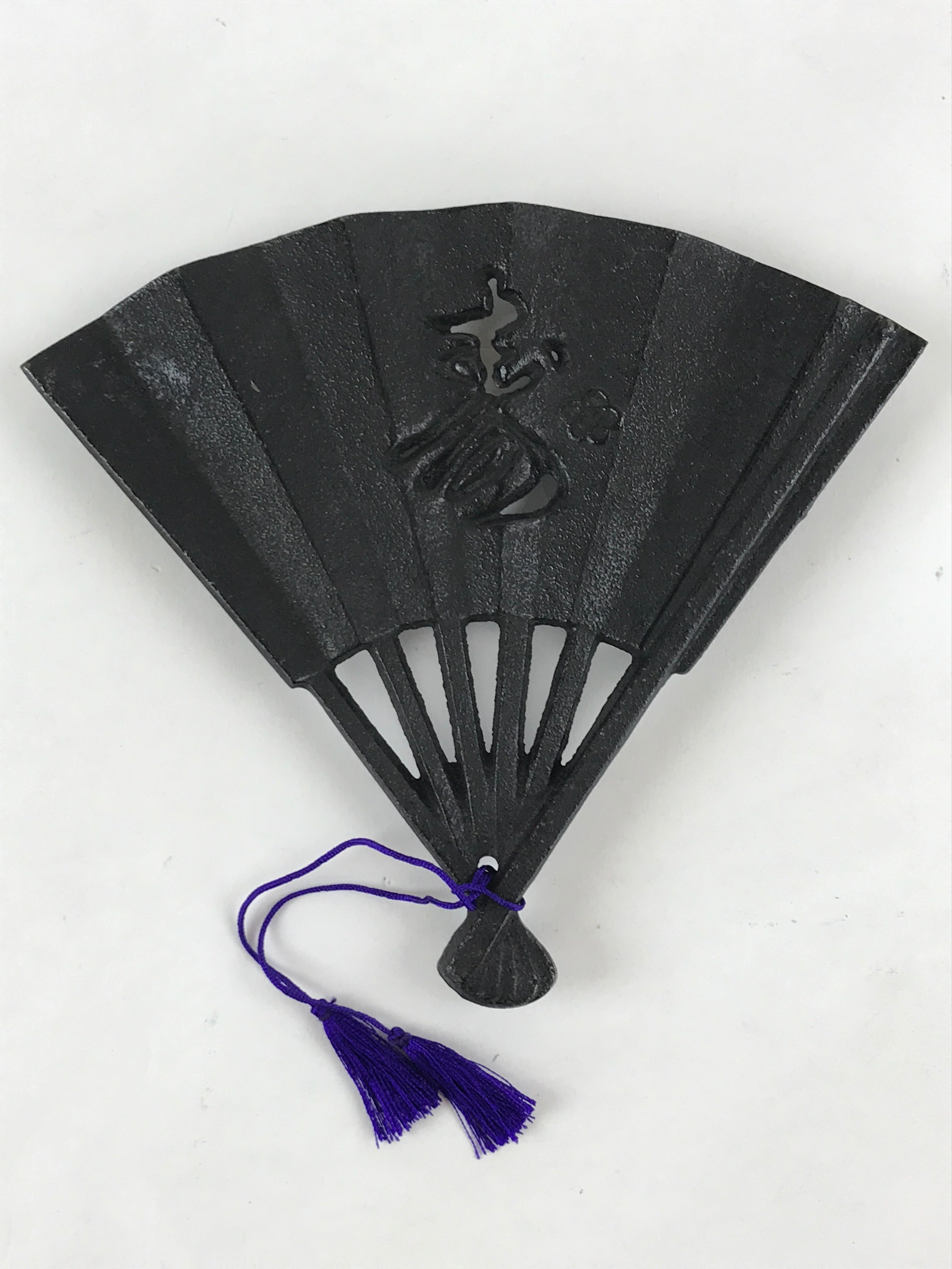This is an iron trivet (Nabeshiki) made by Nambu Tekki in Japan. It is shaped like a folding fan and has the kanji character "Kotobuki" in the middle, which means congratulation. There is a signature on the back that says "Nanbu".