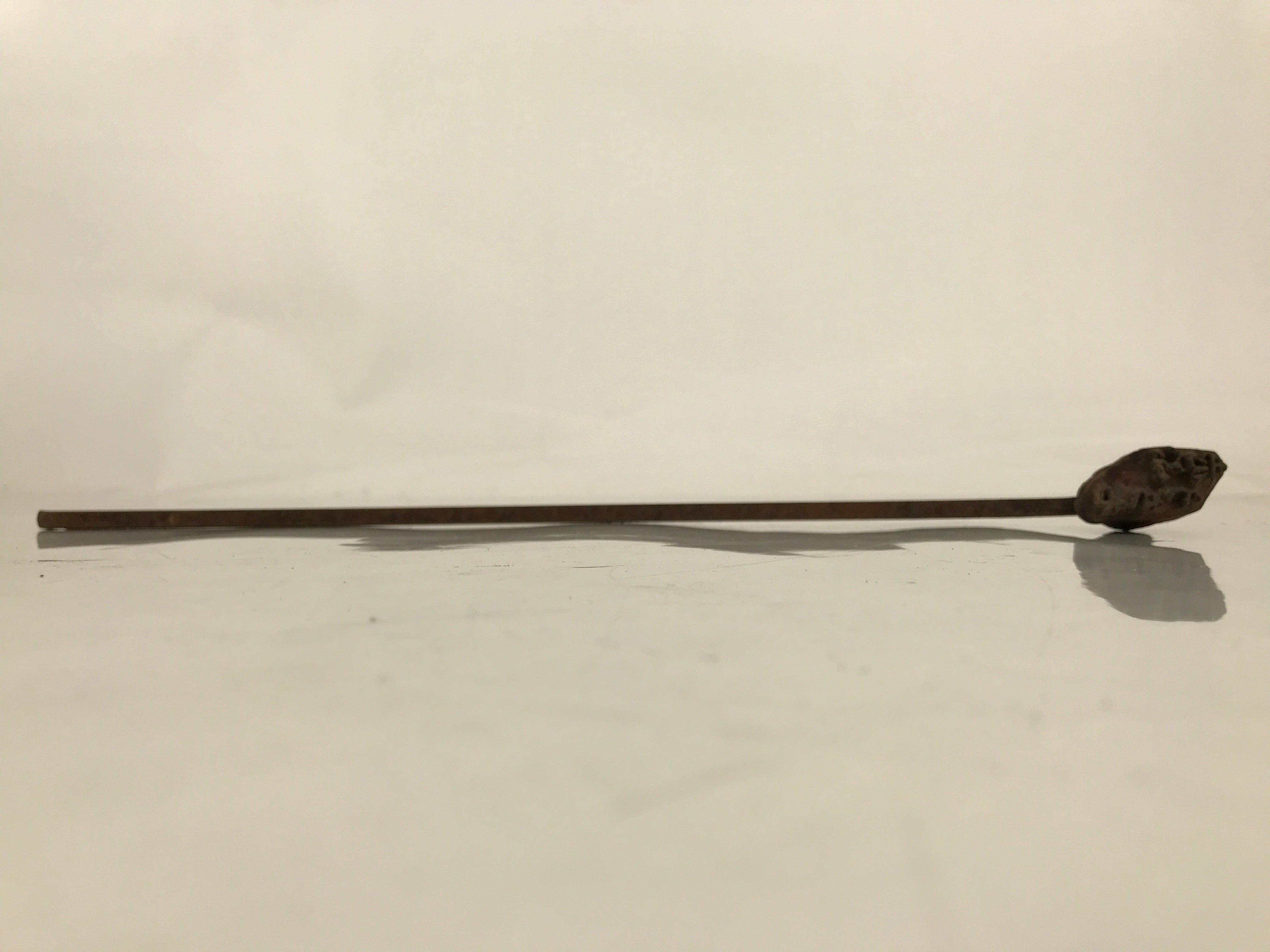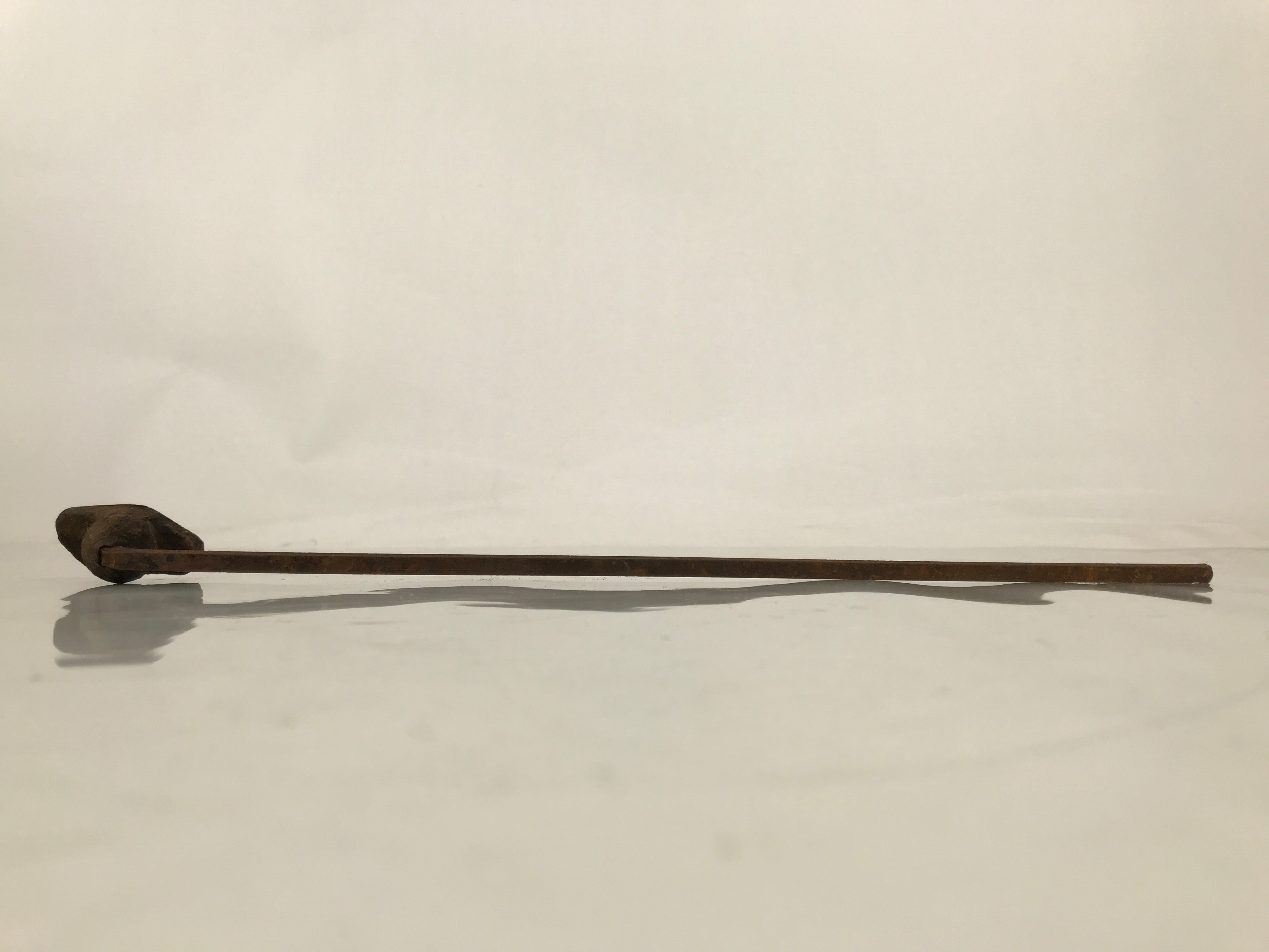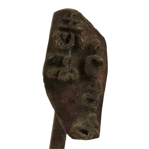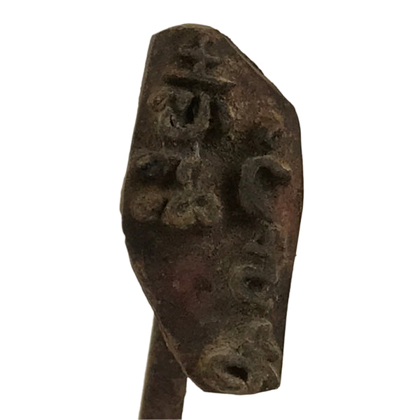 This is a vintage cast iron branding stamp called yaki-in. This piece is meant to be placed over fire or coals and is used to mark wood, leather, fabrics, and, most famously, Japanese sweets such as manju. It has kanji for an uchiwa (flat hand fan) shop (志ぶ うちわ kokorozashibu uchiwa).