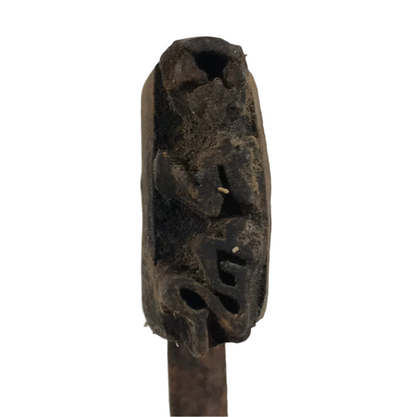 This is a vintage cast iron branding stamp called yaki-in. This piece is meant to be placed over fire or coals and is used to mark wood, leather, fabrics, and, most famously, Japanese sweets such as manju. It features kanji (本力良 moto chikara ryou more powerful).