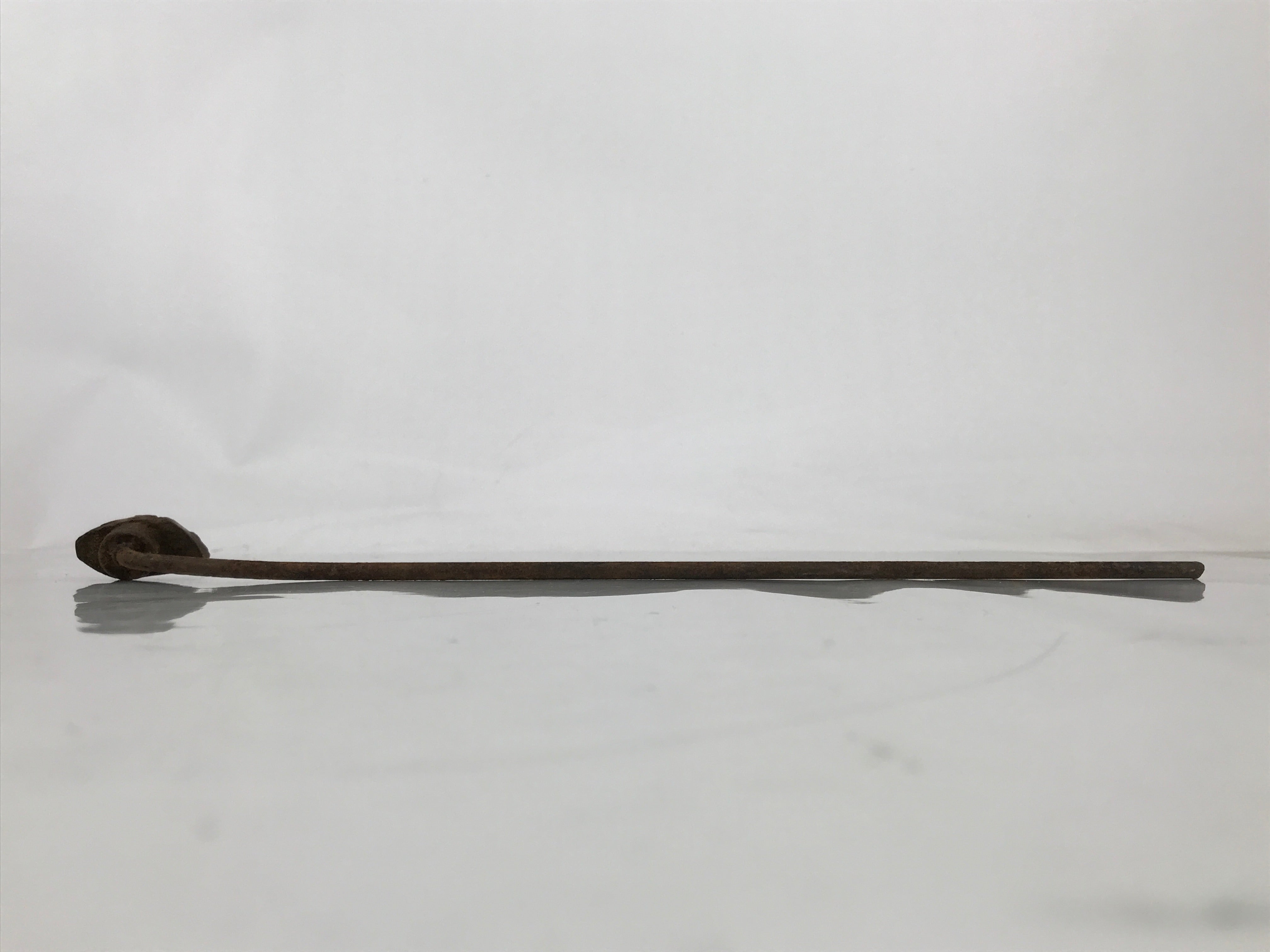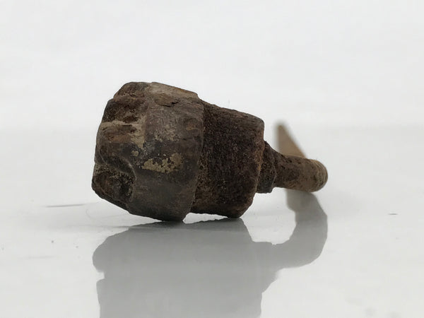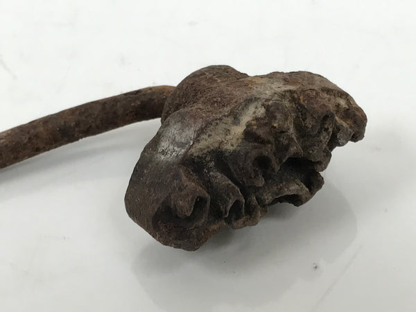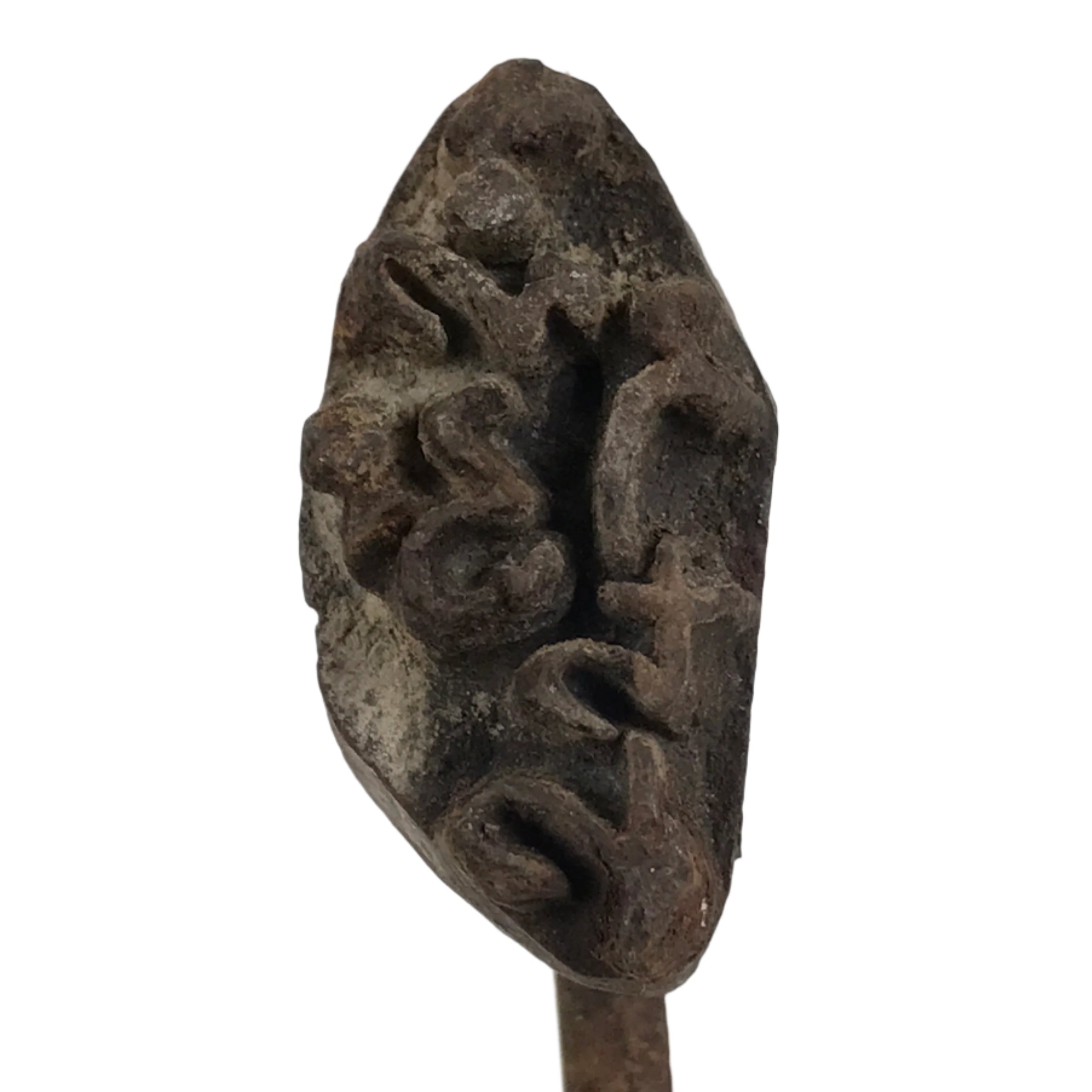 This is a vintage cast iron branding stamp called yaki-in. This piece is meant to be placed over fire or coals and is used to mark wood, leather, fabrics, and, most famously, Japanese sweets such as manju. It has kanji for an uchiwa (flat hand fan) shop (志ぶ うちわ kokorozashibu uchiwa).