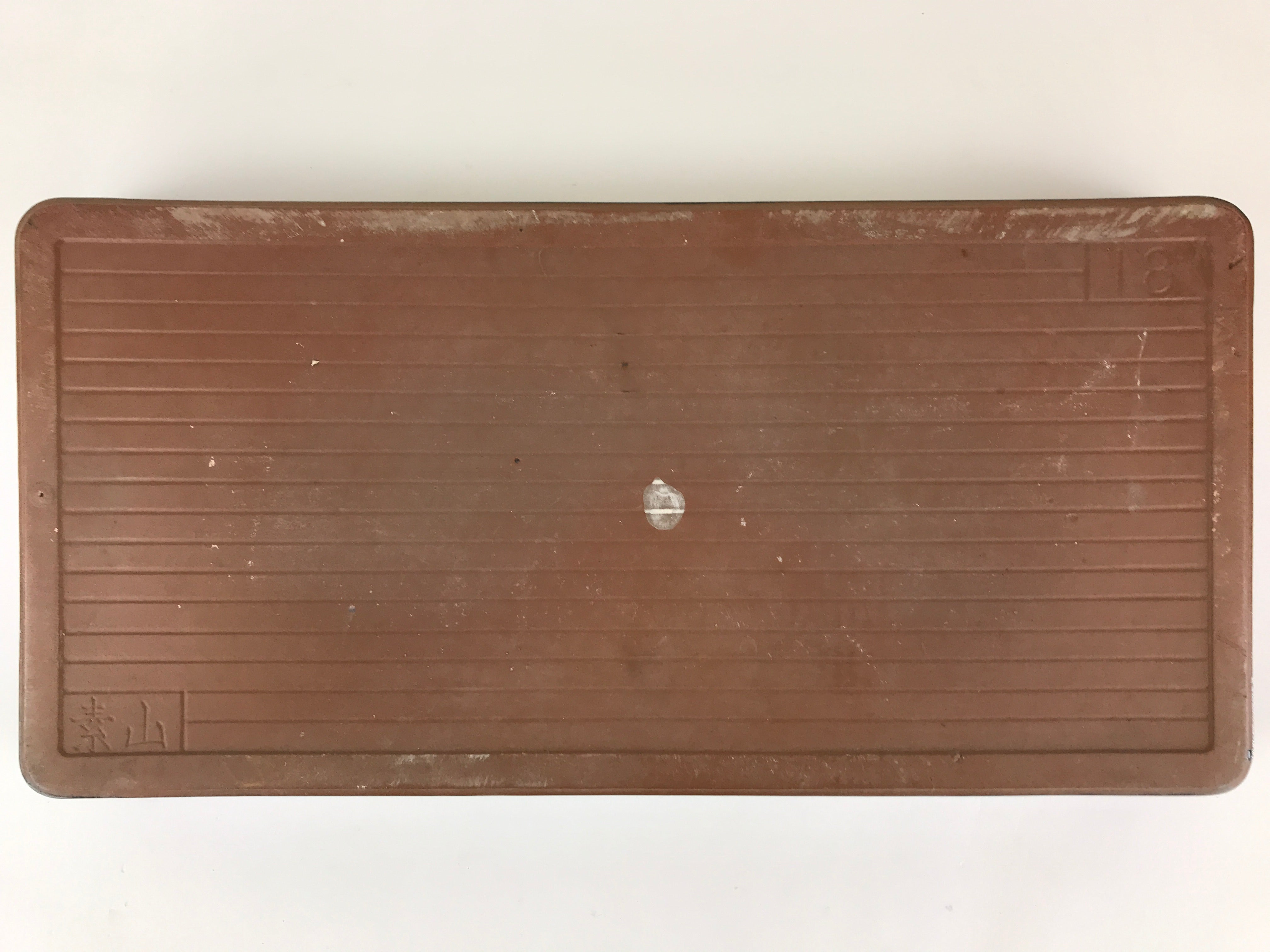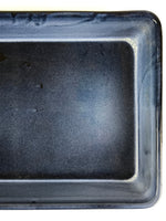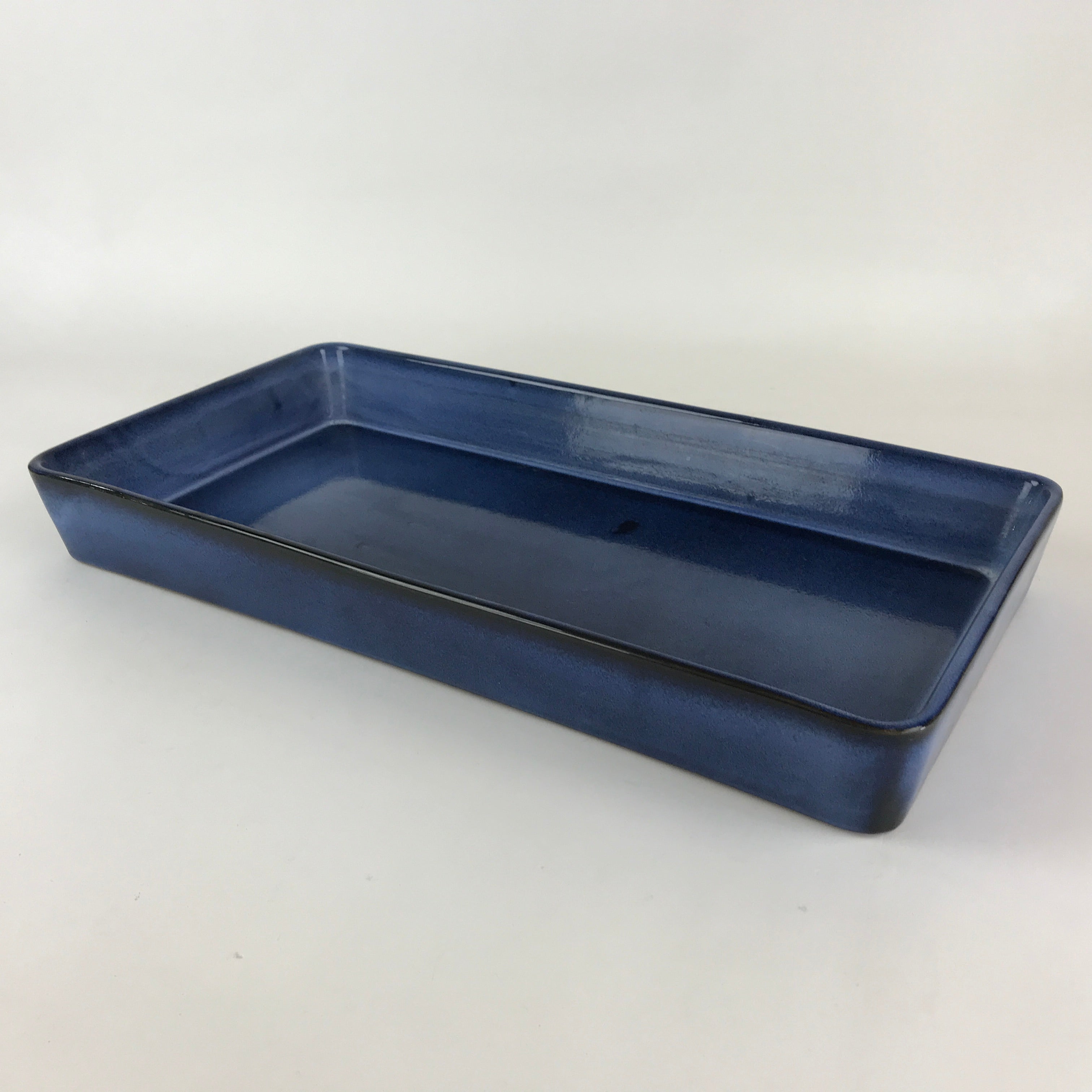 This is a Japanese vintage ceramic flower vase Suiban. It is a shallow flat vase used in the ikebana flower arrangement in Japan. Blue rectangle shape.