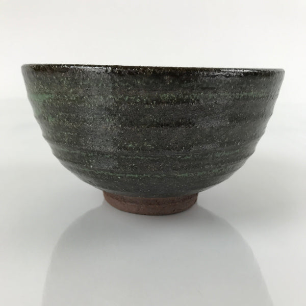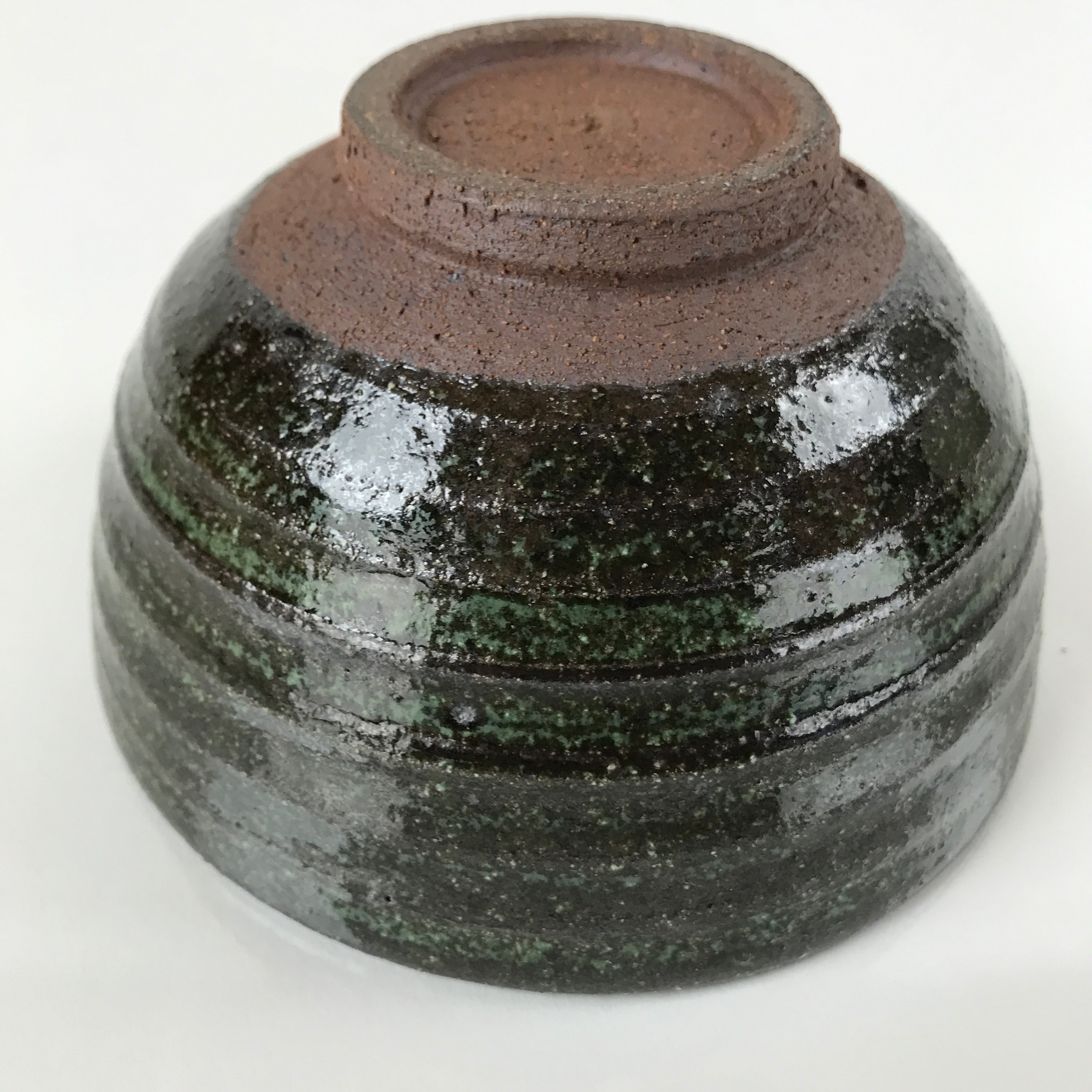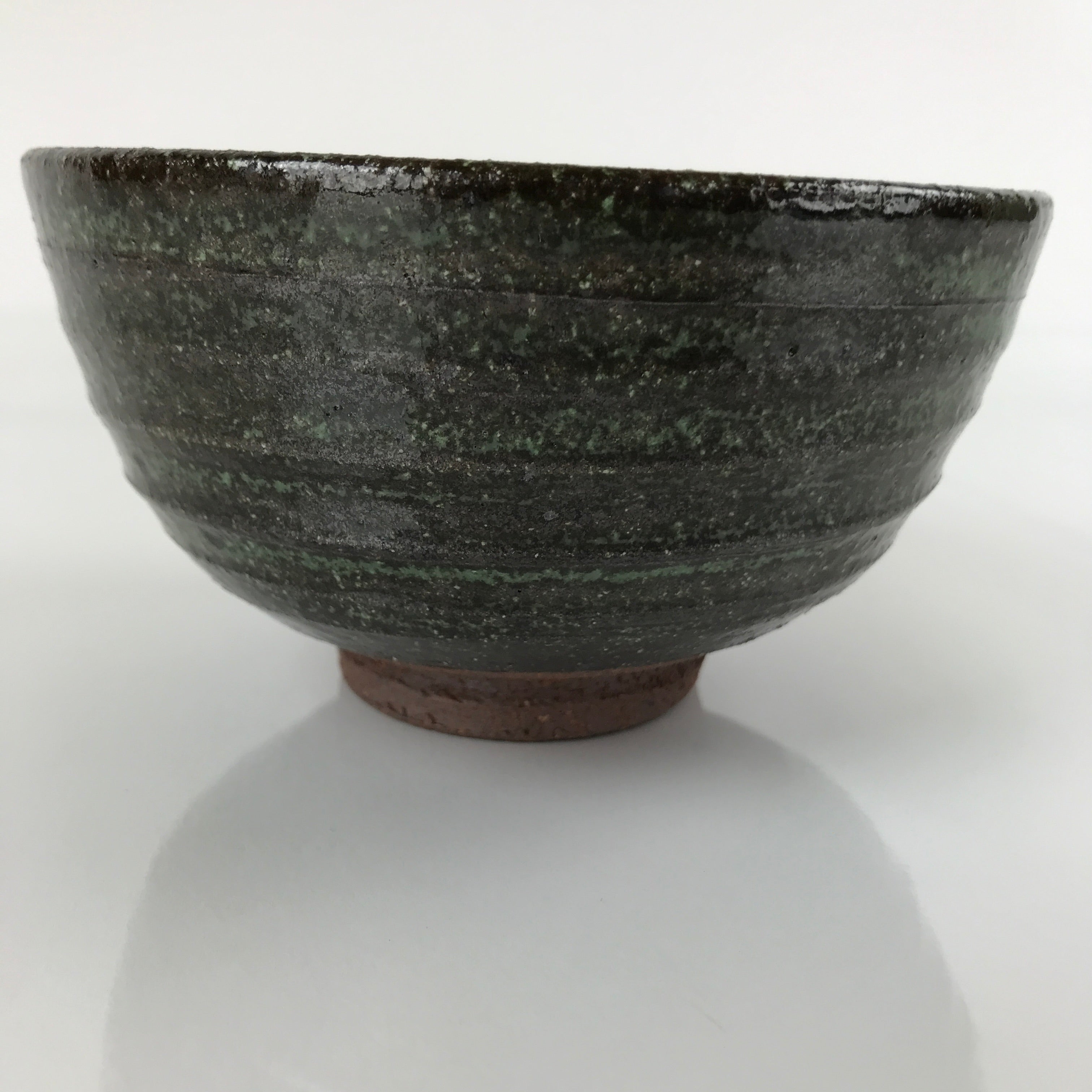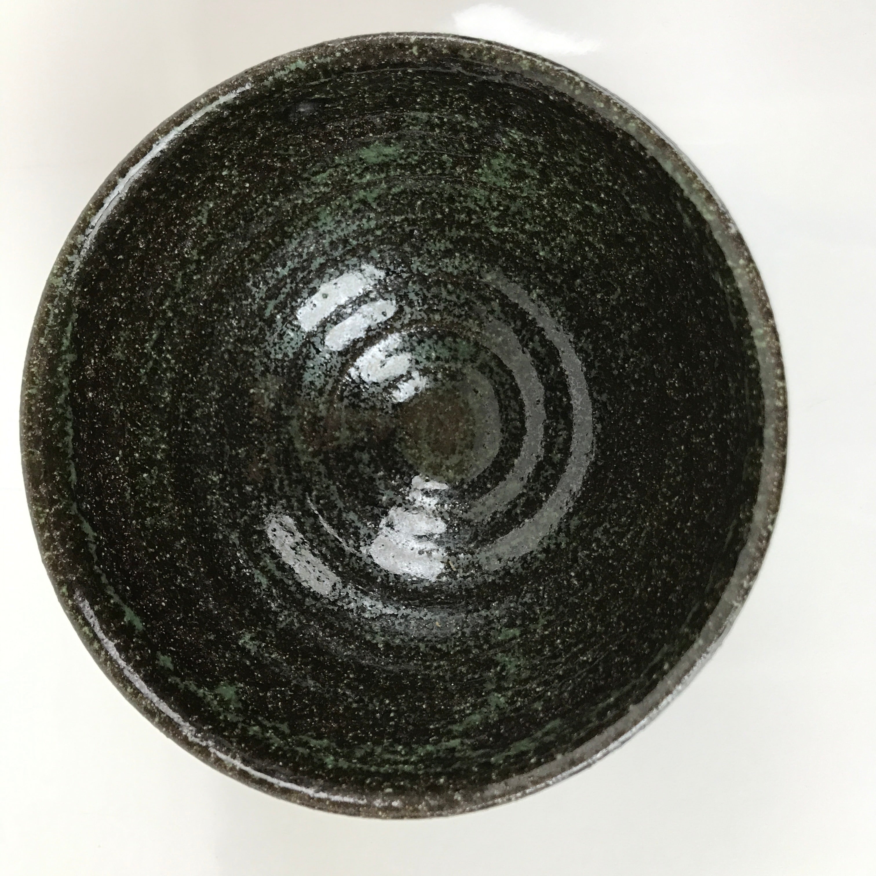 This is a vintage Japanese ceramic green tea bowl, or matcha chawan. It is dark brown almost black, with green speckles and drips. It has a ribbed and grainy texture. This bowl is signed with a stamped mark on the bottom. It is simple, sturdy, and easy to handle.