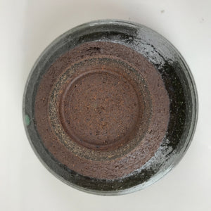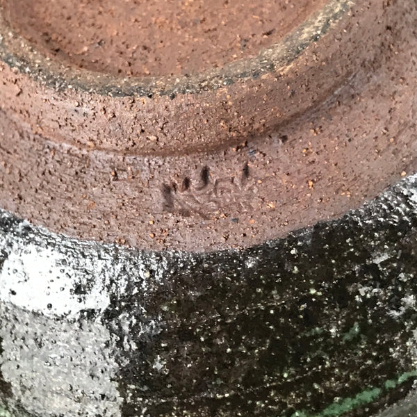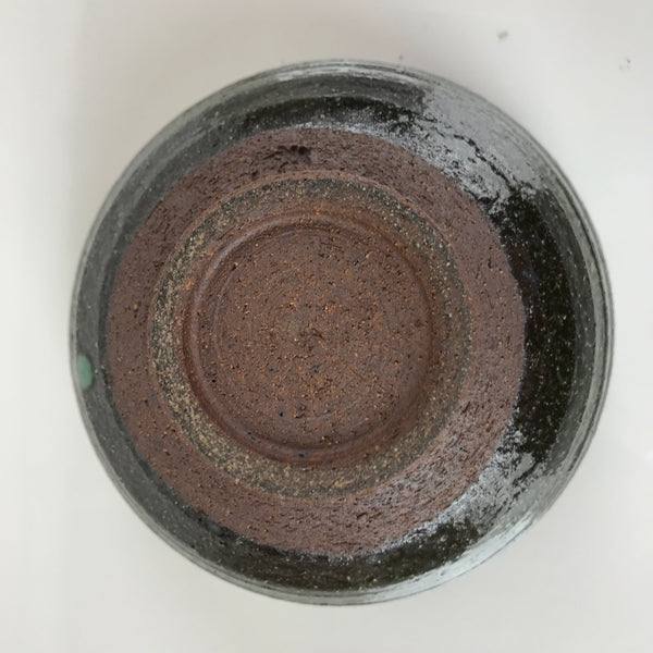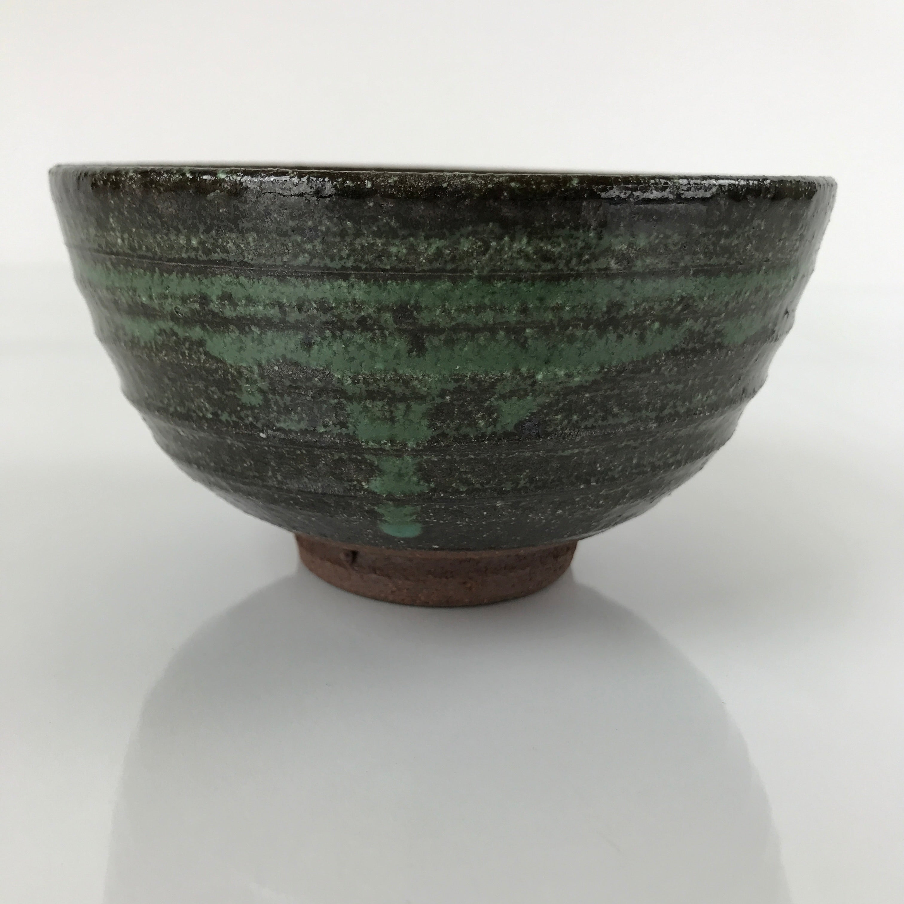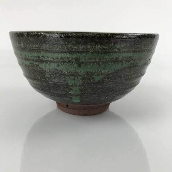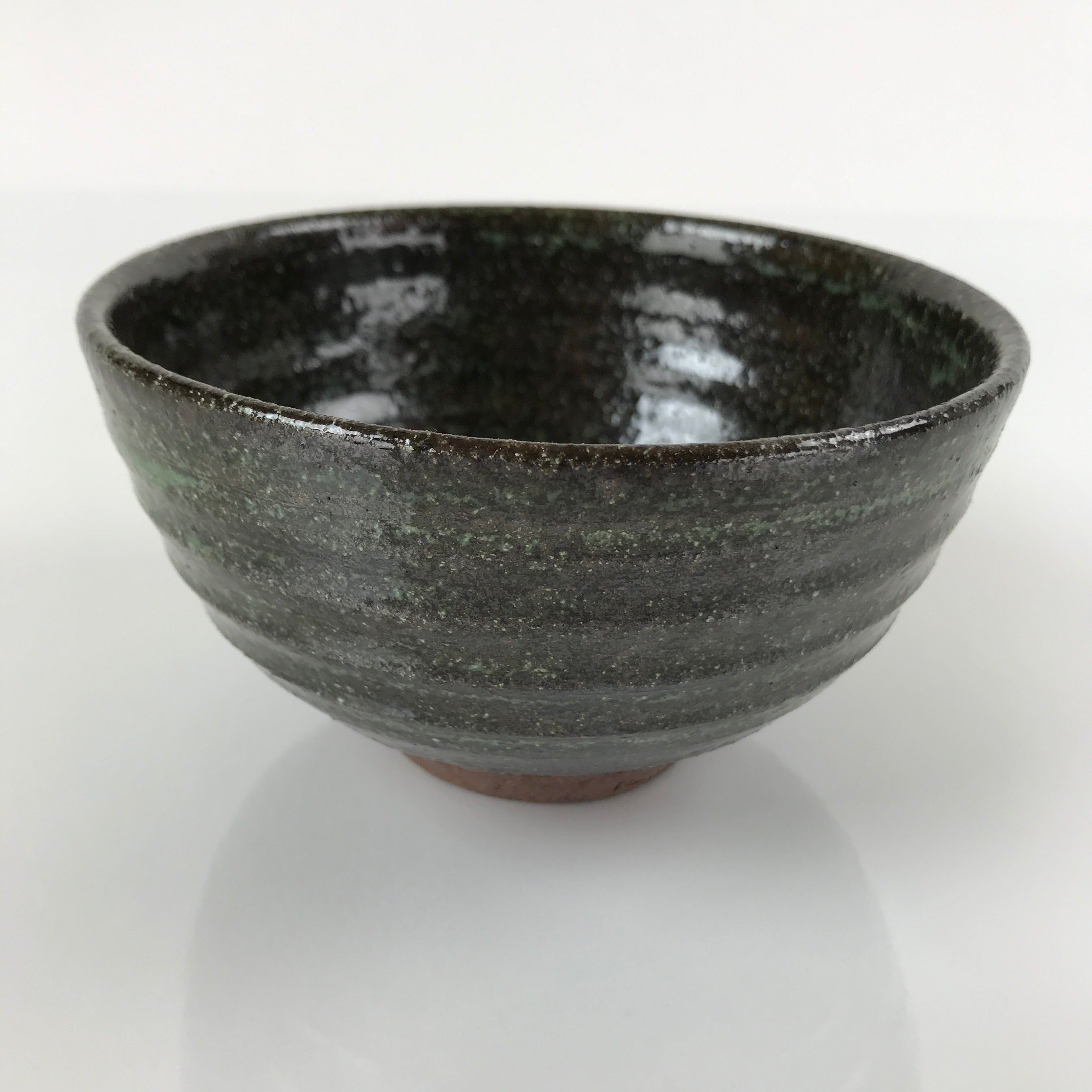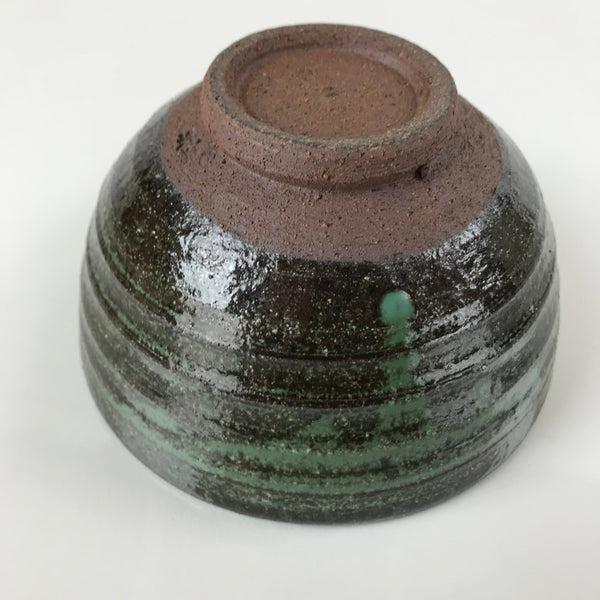 This is a vintage Japanese ceramic green tea bowl, or matcha chawan. It is dark brown almost black, with green speckles and drips. It has a ribbed and grainy texture. This bowl is signed with a stamped mark on the bottom. It is simple, sturdy, and easy to handle.