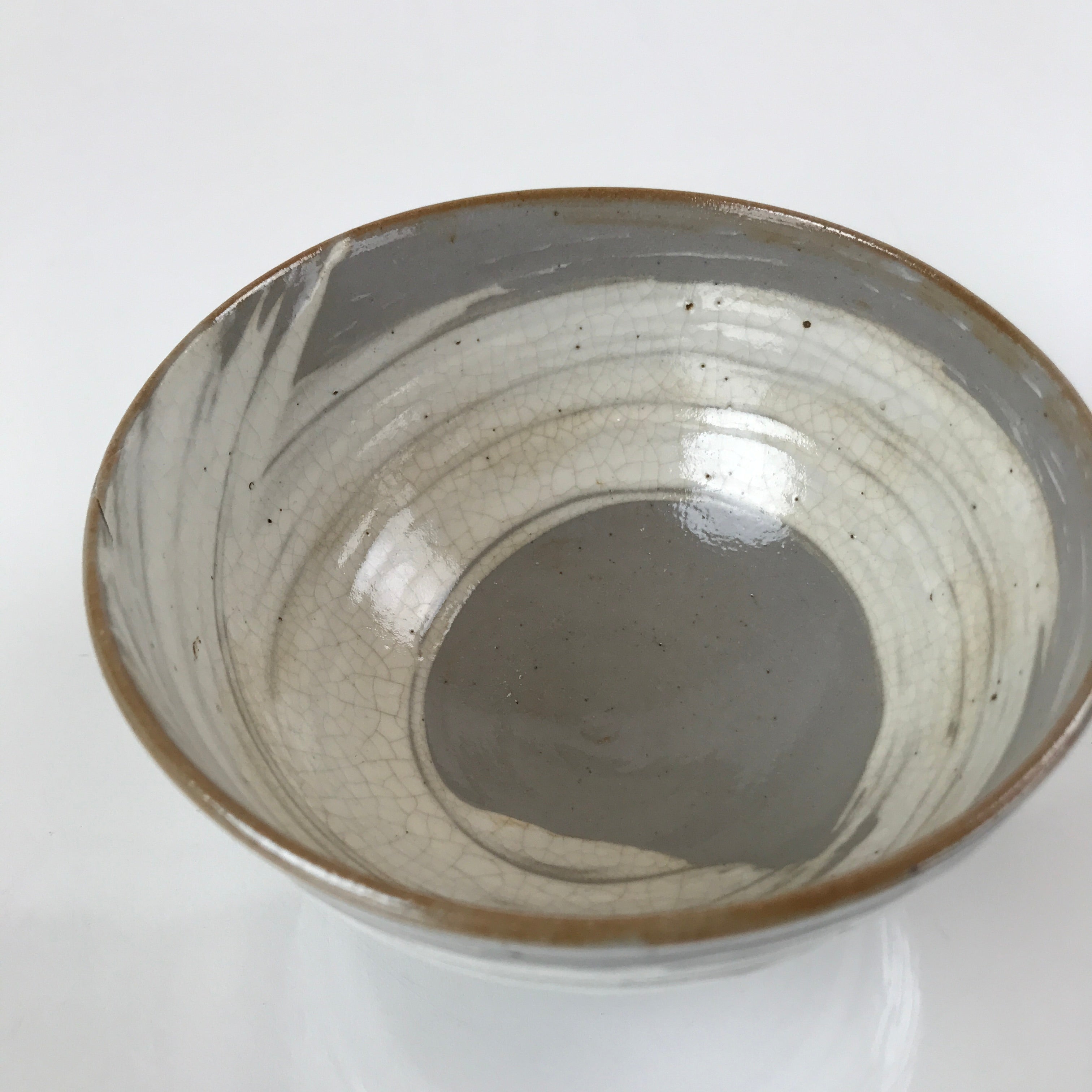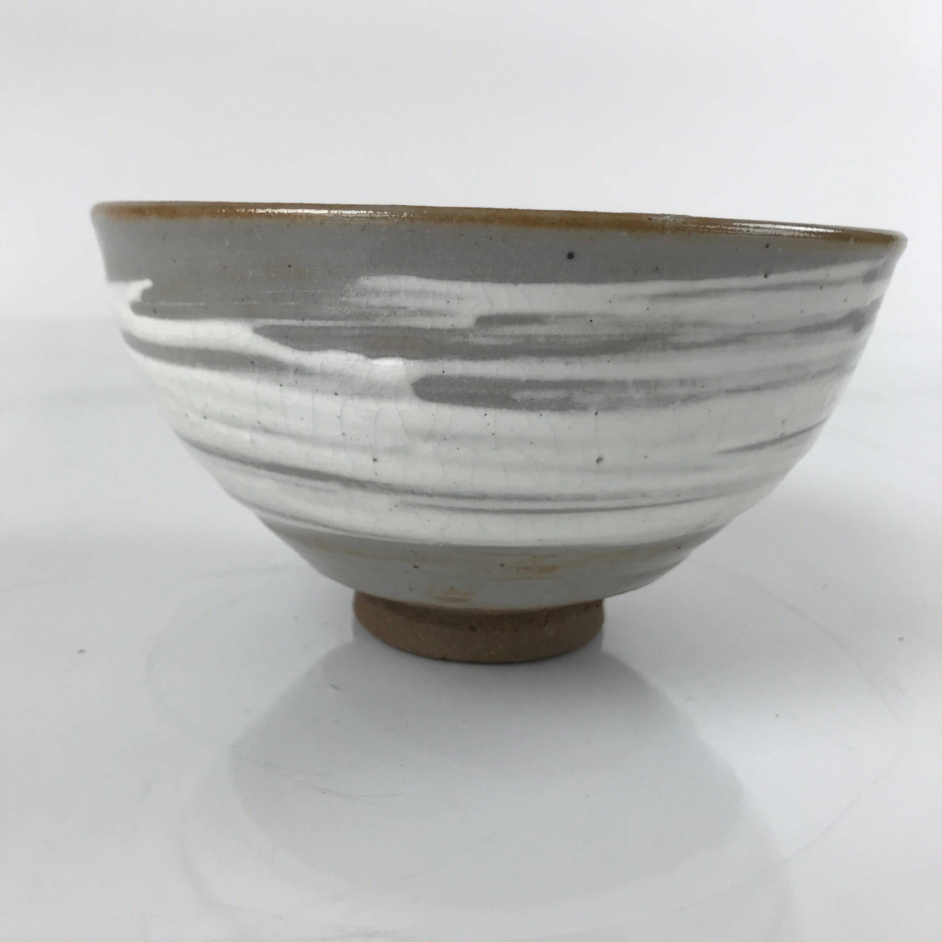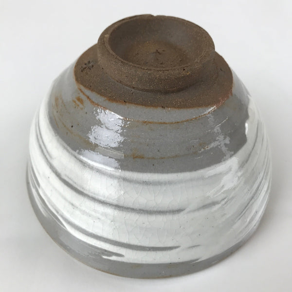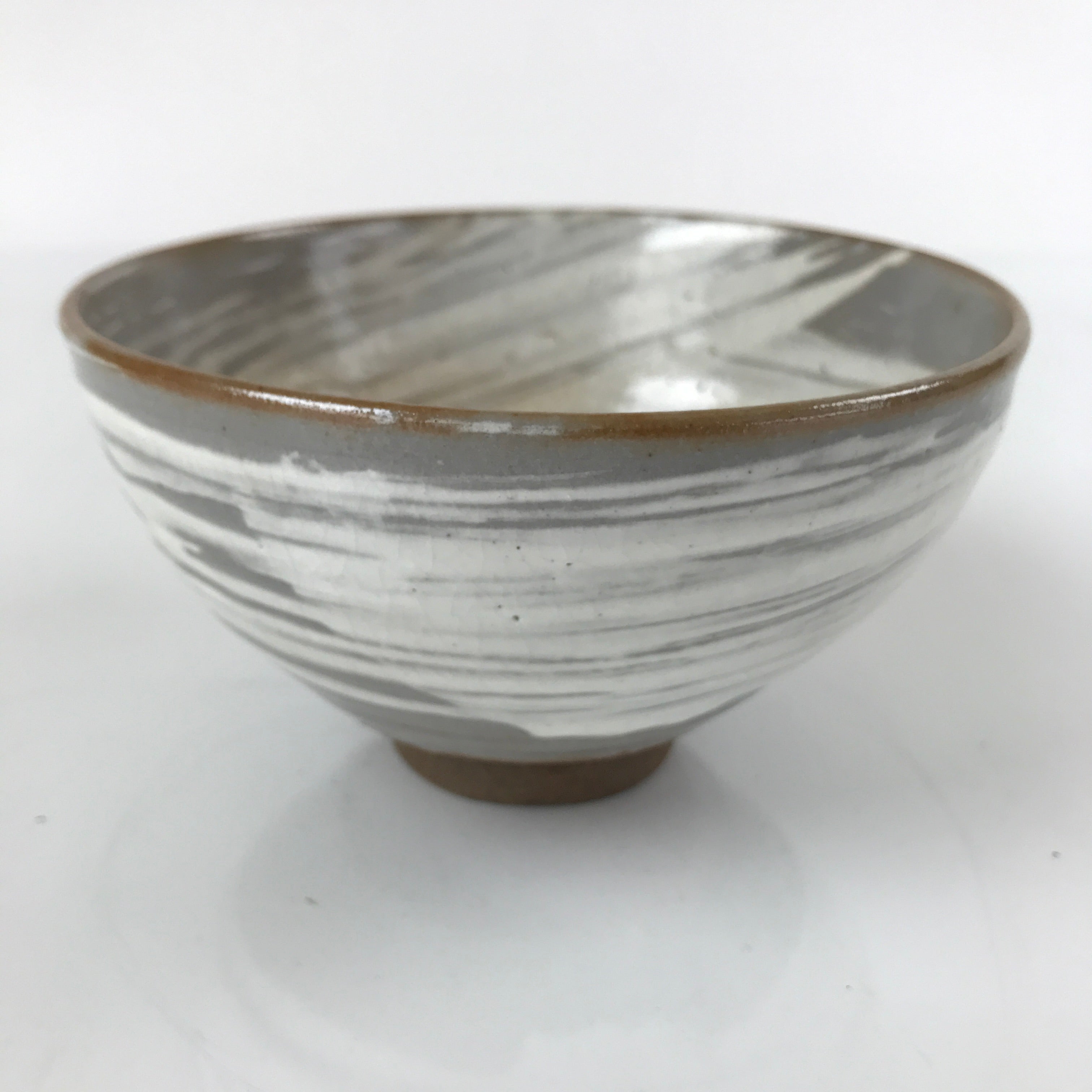 This is a vintage Japanese ceramic green tea bowl, or matcha chawan. It is gray with thick white brush strokes on the inside edge and outside. It has a grainy texture. This bowl is signed with a stamped mark on the bottom. It is simple, sturdy, and easy to handle. This type of bowl is called wan-nari, which is a tea bowl resembling a soup or rice bowl.