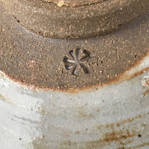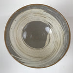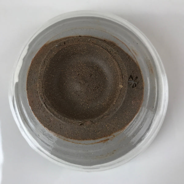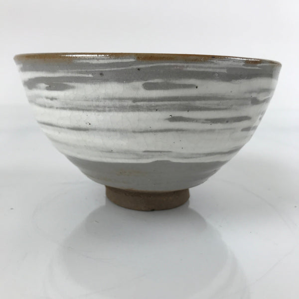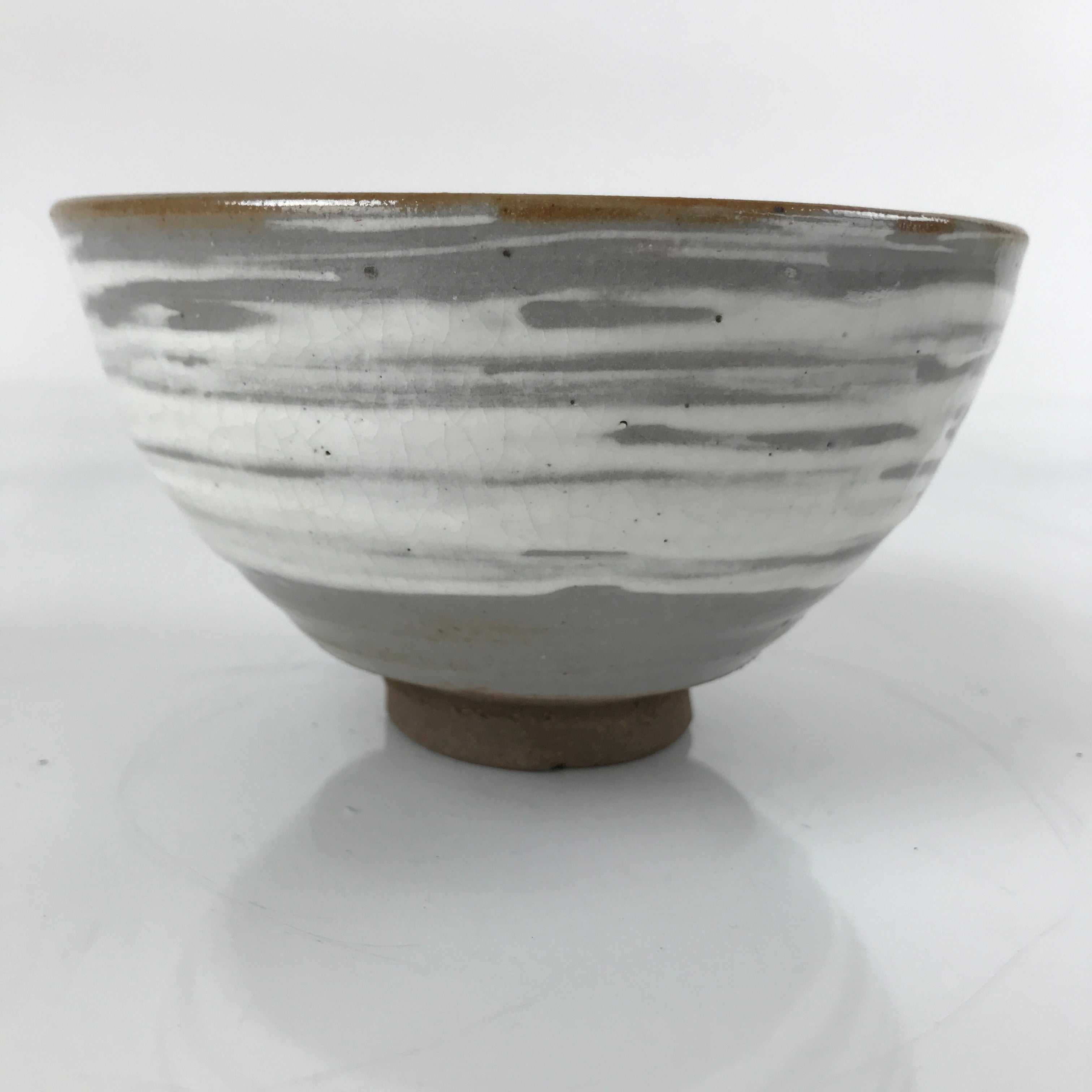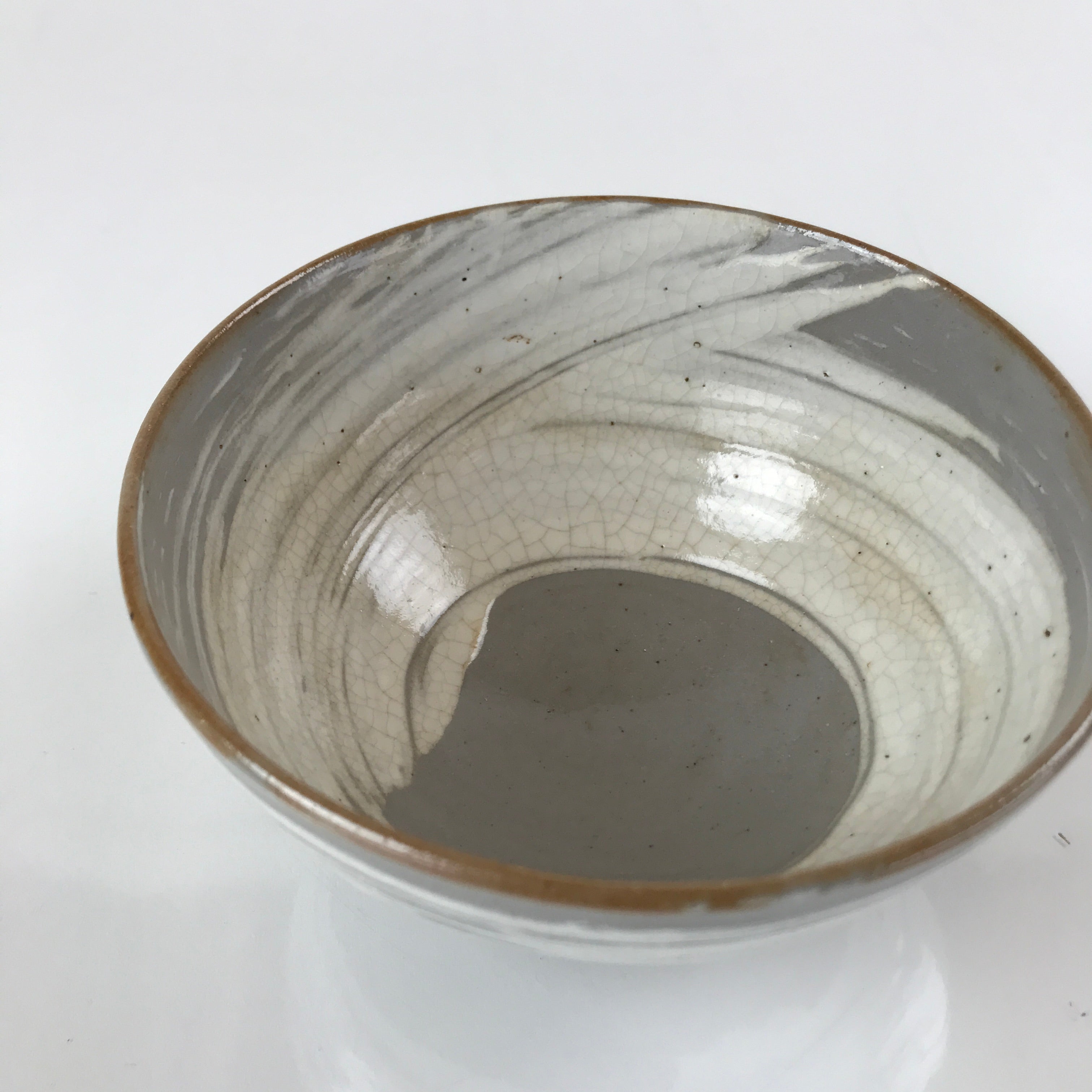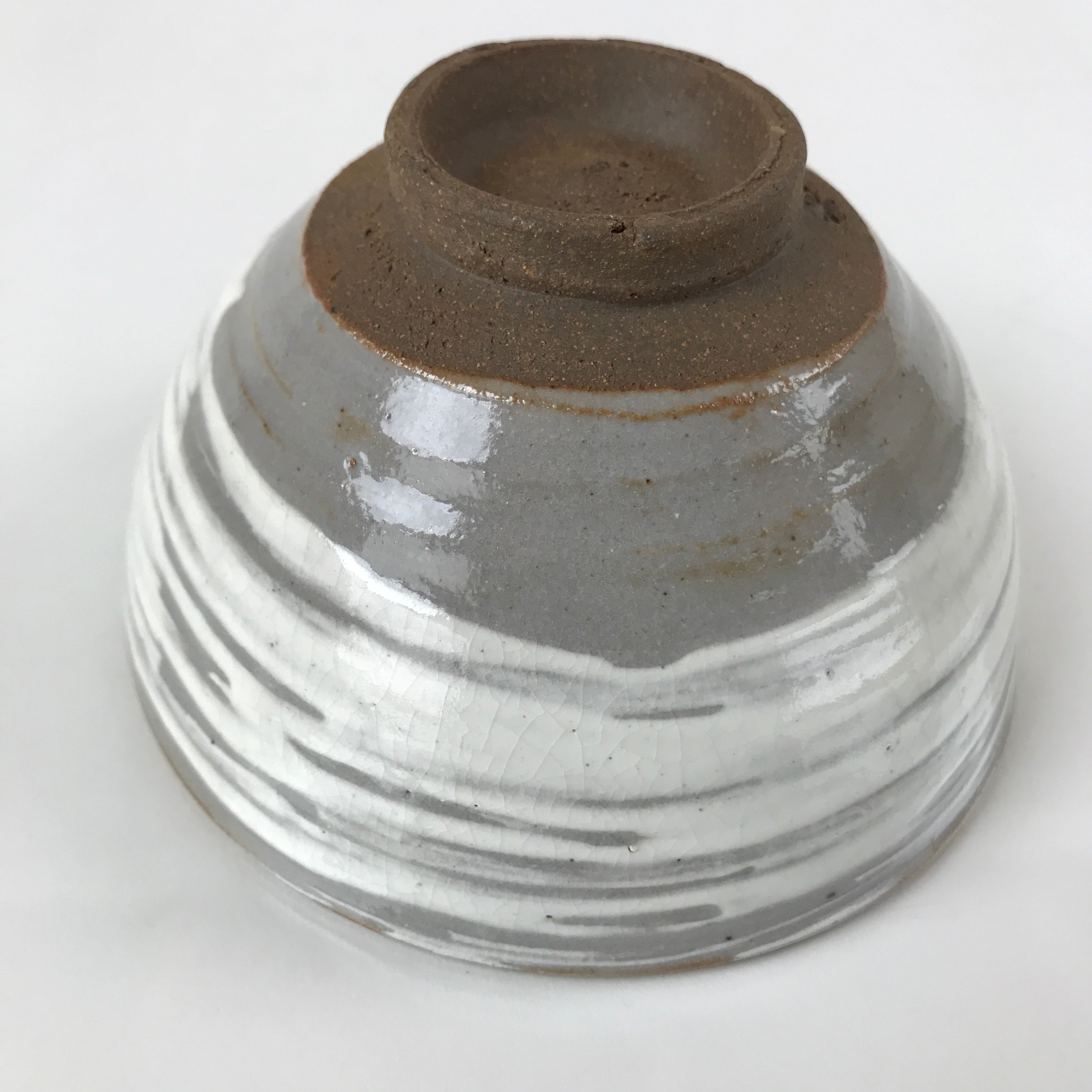 This is a vintage Japanese ceramic green tea bowl, or matcha chawan. It is gray with thick white brush strokes on the inside edge and outside. It has a grainy texture. This bowl is signed with a stamped mark on the bottom. It is simple, sturdy, and easy to handle. This type of bowl is called wan-nari, which is a tea bowl resembling a soup or rice bowl.