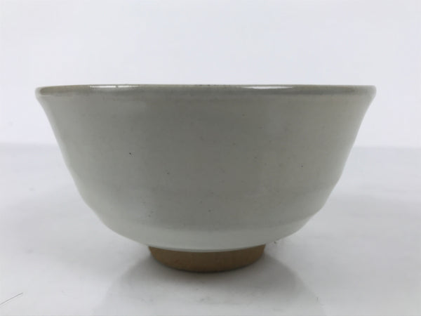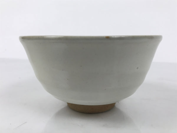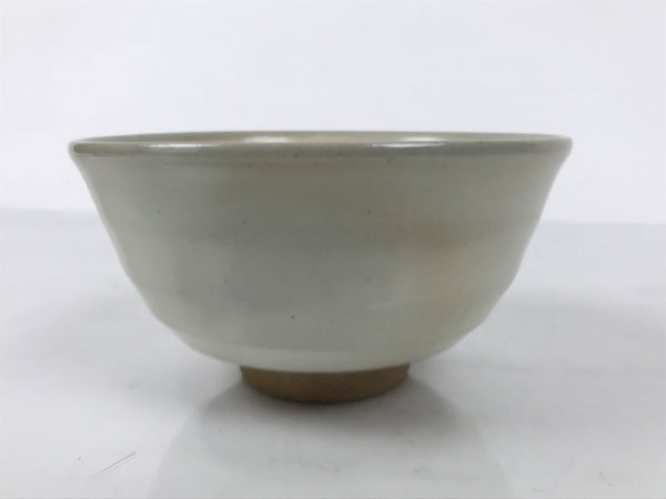 This is a vintage Japanese ceramic green tea bowl or matcha chawan in the Hagi ware style. It is off-white with orange accents. There is a signature around the foot.