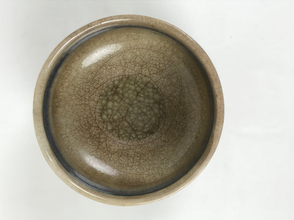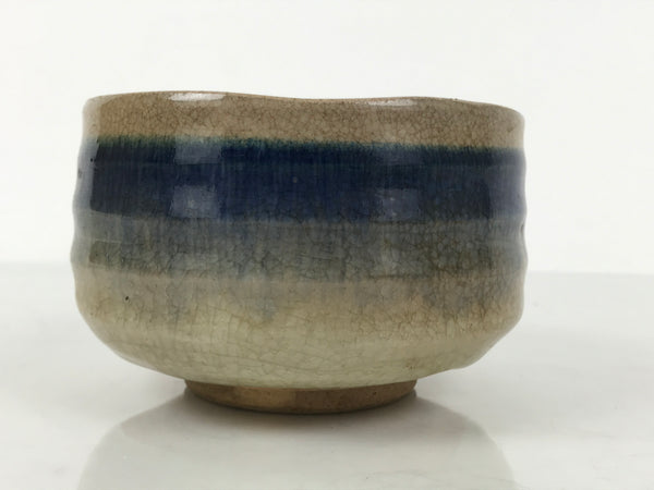 This is a vintage Japanese ceramic green tea bowl or matcha chawan. It is gray and blue. The gray crackle glass glaze covers the bowl, with a pooling around the inside and outside bottoms. It has an accent of a deep indigo-blue band with soft edges on the inside and the outside. There is a signature around the foot.