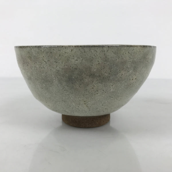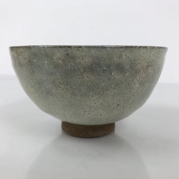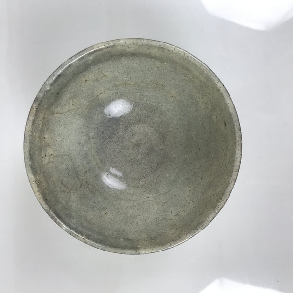 This is a vintage Japanese ceramic green tea bowl or matcha chawan. It is pale gray with some tones made during firing. The base is brown.
