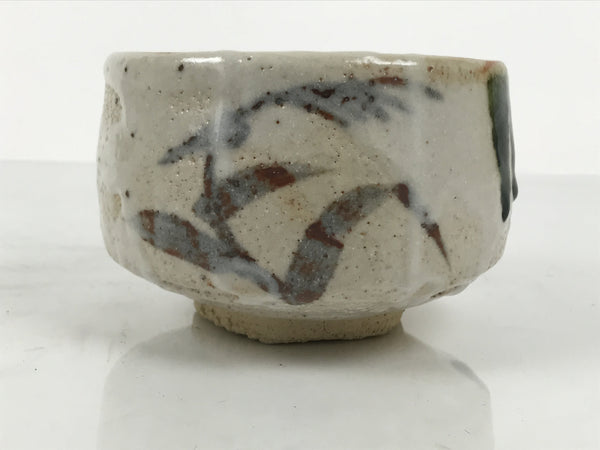This is a vintage Japanese ceramic green tea bowl or matcha chawan. This piece is in a shino style, a white pocked glaze over a thick base with a brown or orange rim. Under the white glaze, it has a dark brown leaf-like design, and over the white glaze, a green glaze is melting. There is a signature near the foot. This bowl comes with a paper box.