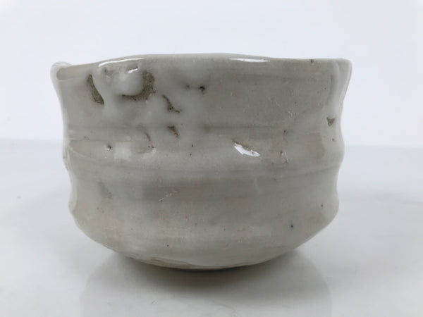 This is a vintage Japanese ceramic green tea bowl or matcha chawan. This thick bowl is glossy white. It has a Rokurome pattern on the side and hand-formed irregularity on the rim. There is a signature near the foot.