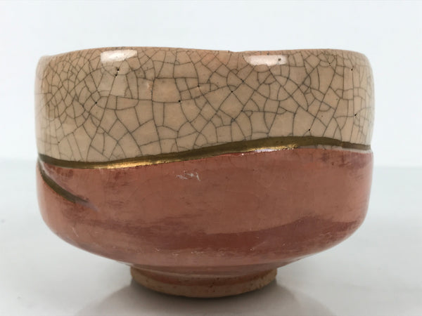 This is a vintage Japanese ceramic green tea bowl or matcha chawan. It is in the raku style. This unique bowl is primarily orange, with varied tones and designs across the surface. A gold line separates the outside design: the upper part is pale orange with crackle glaze, and the lower part features various shades of orange, pale to dark. Inside the bowl, it is solid orange with a crackle glaze underneath. There is a signature around the foot.