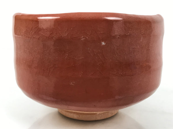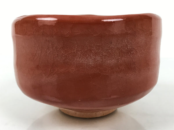 This is a vintage Japanese ceramic green tea bowl or matcha chawan in the Raku ware style. This bowl has a brownish-red glossy glass glaze with brown spots. The glaze makes an off-white glaze drip inside the bowl. There is a sign on the foot.