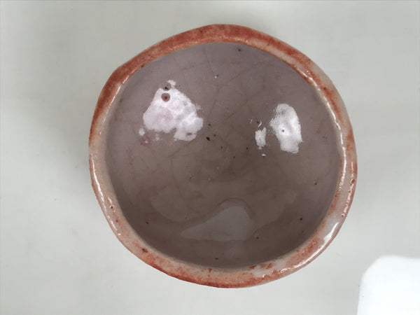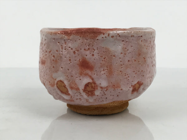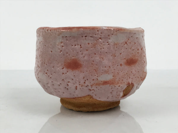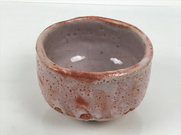 This is a vintage Japanese ceramic green tea bowl or matcha chawan. This piece is a perfect example of pink Shino ware. A rich terracotta brown base with a white pocked layer over the top that allows the pinkish brown to peek through. It has a thicker glaze on the inside, which makes it white with pockmarks and crackle.