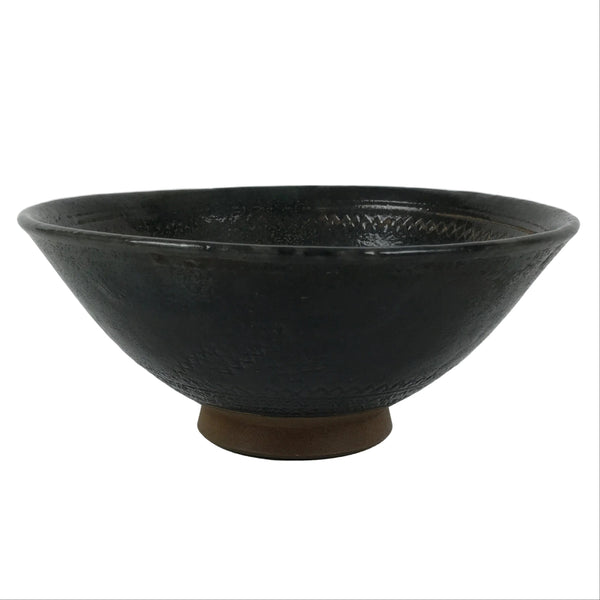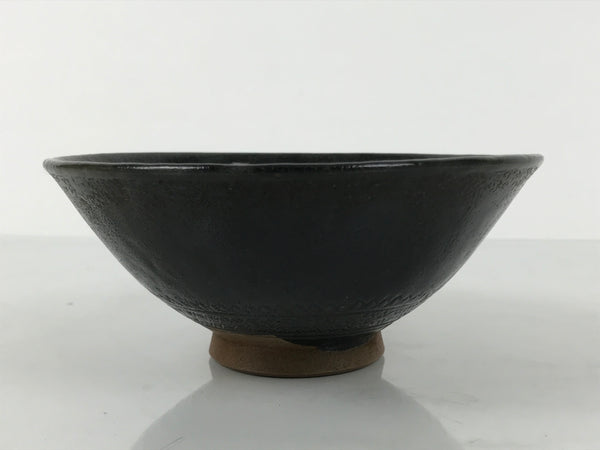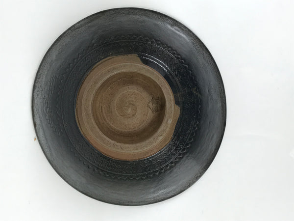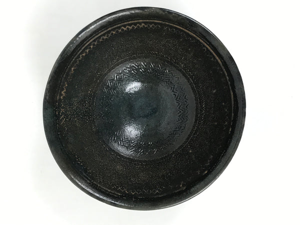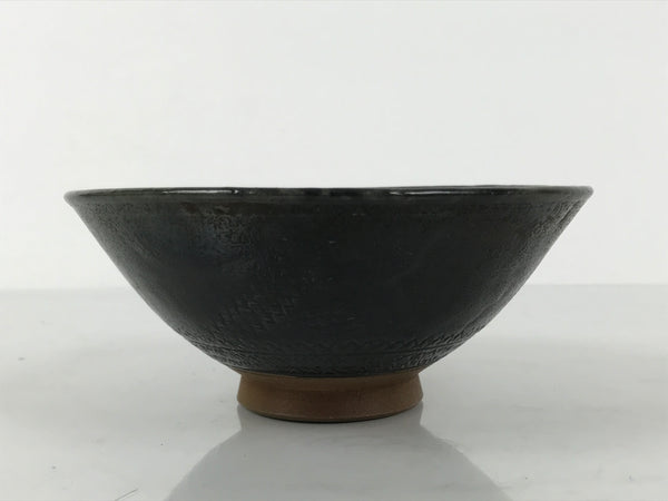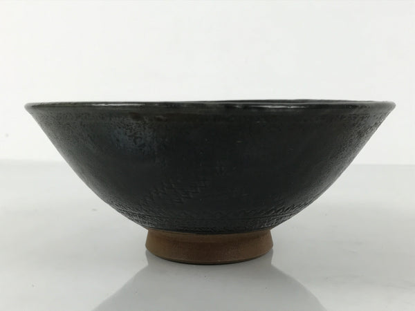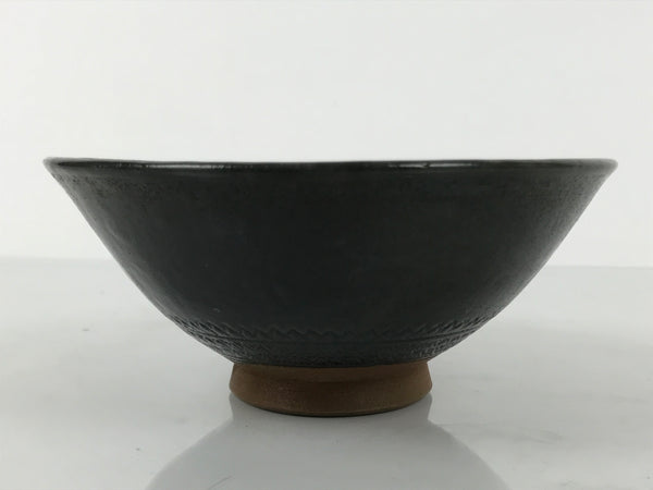 This is a vintage Japanese ceramic green tea bowl or matcha chawan. This bowl is dark gray with a brown base. It has an abstract incising design with a brown base, though the outside design is covered in gray. It has a signature inside the foot.