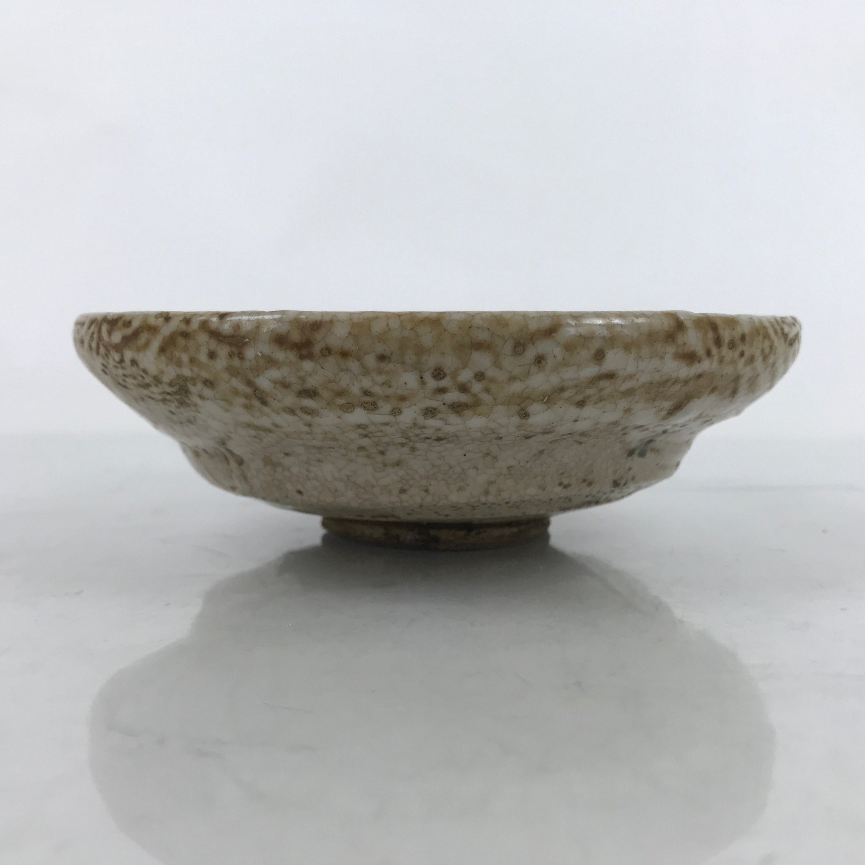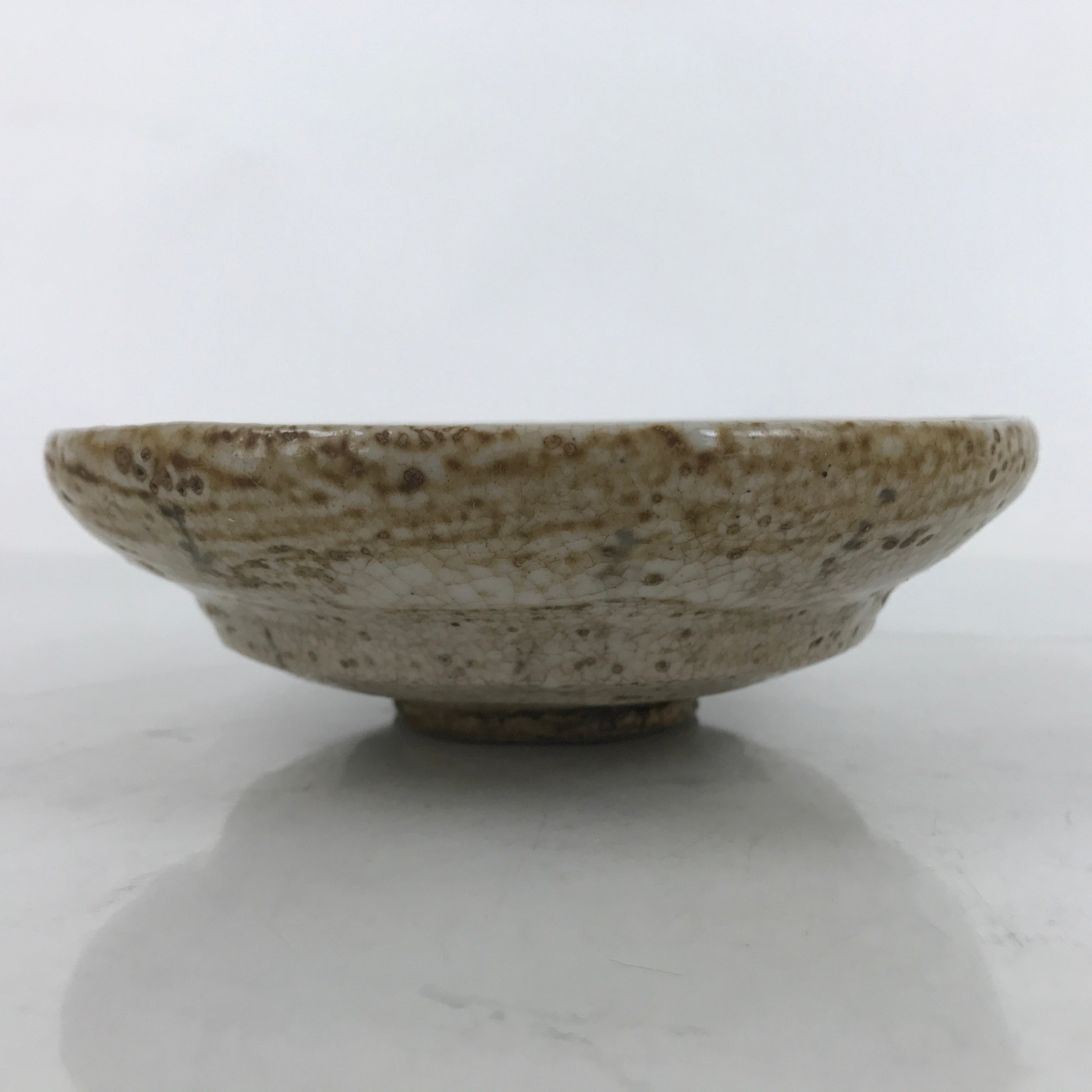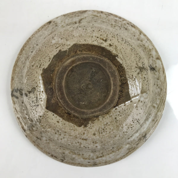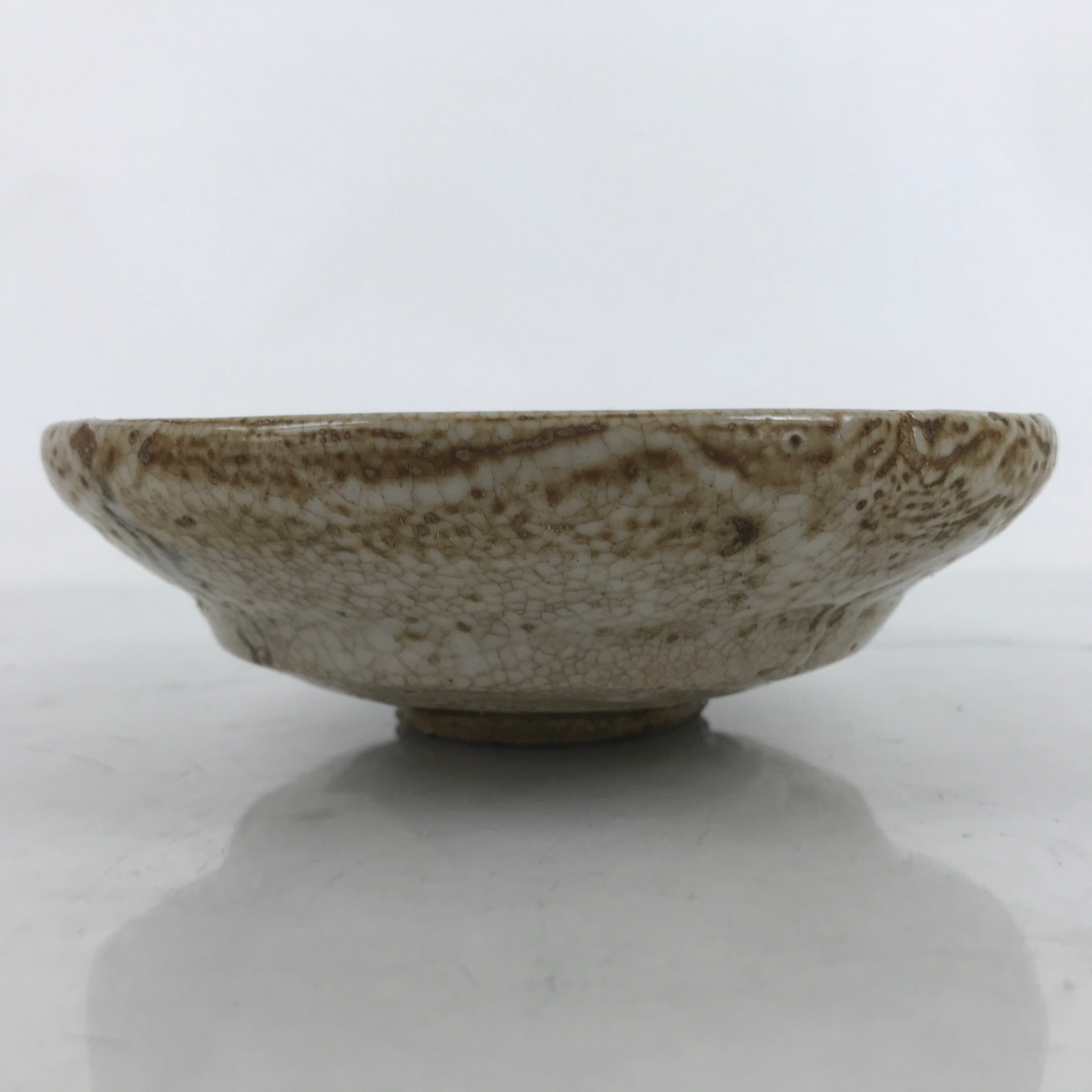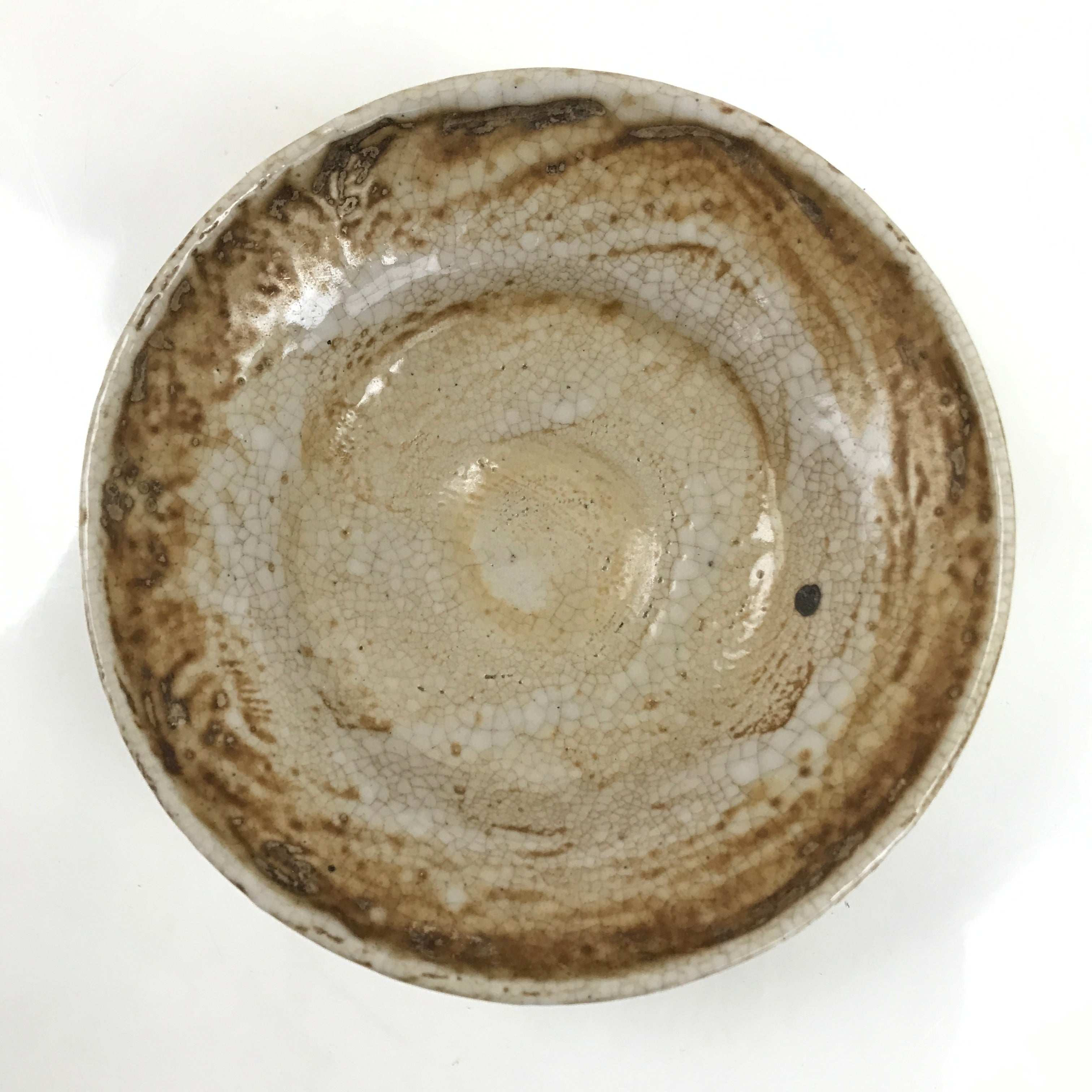 This is a vintage Japanese ceramic green tea bowl, or matcha chawan. It is covered with a beige crackle glaze. Brown accents are on the inside. Some Japanese letter design is on the outside. It has a shallow shape with a generously wide width for the summer tea ceremony. It allows the tea to cool slightly before drinking from the open air.