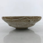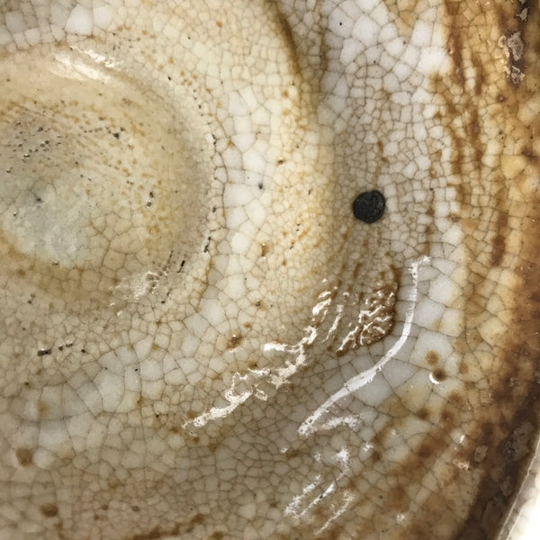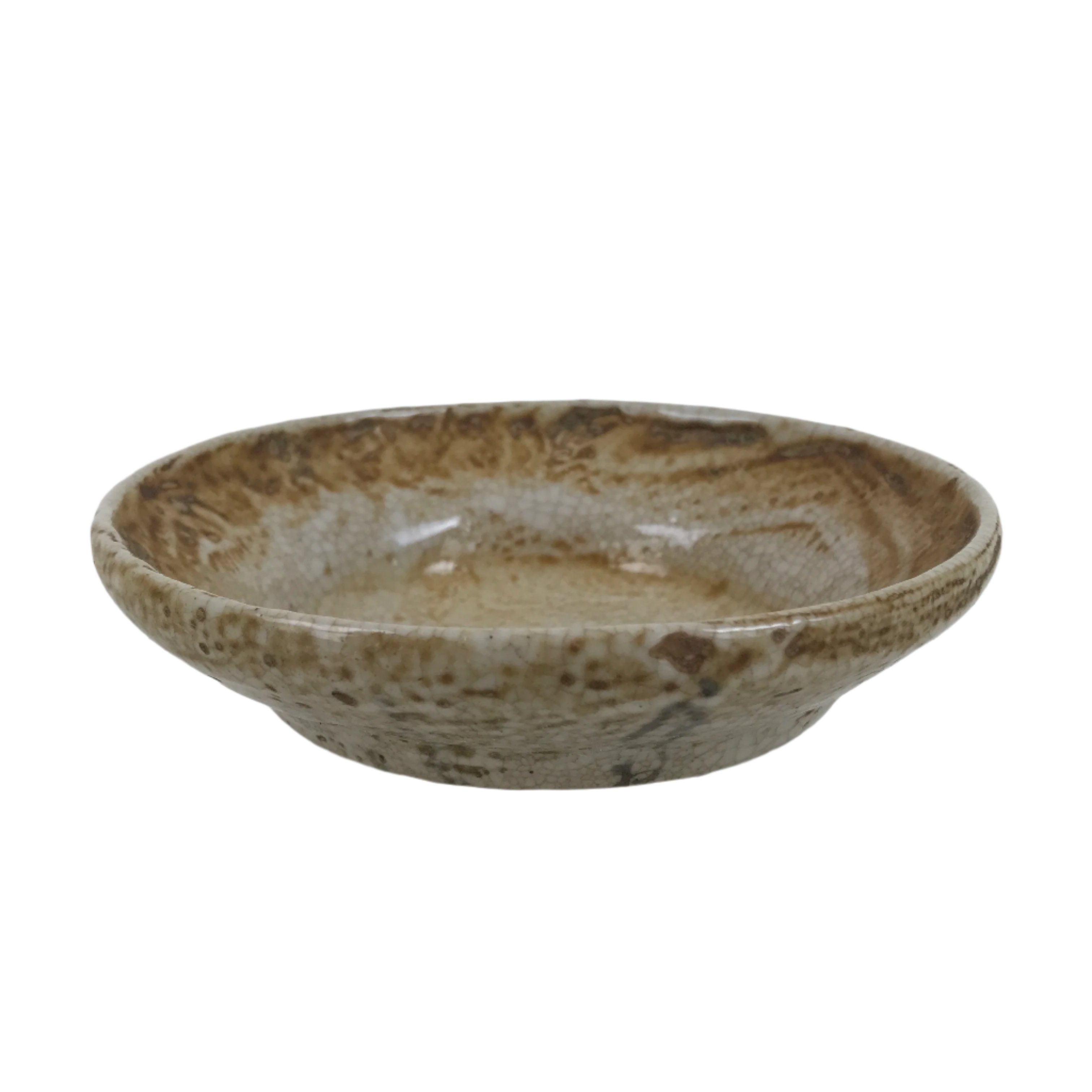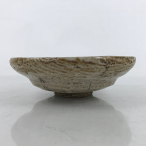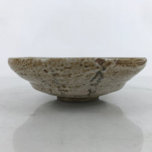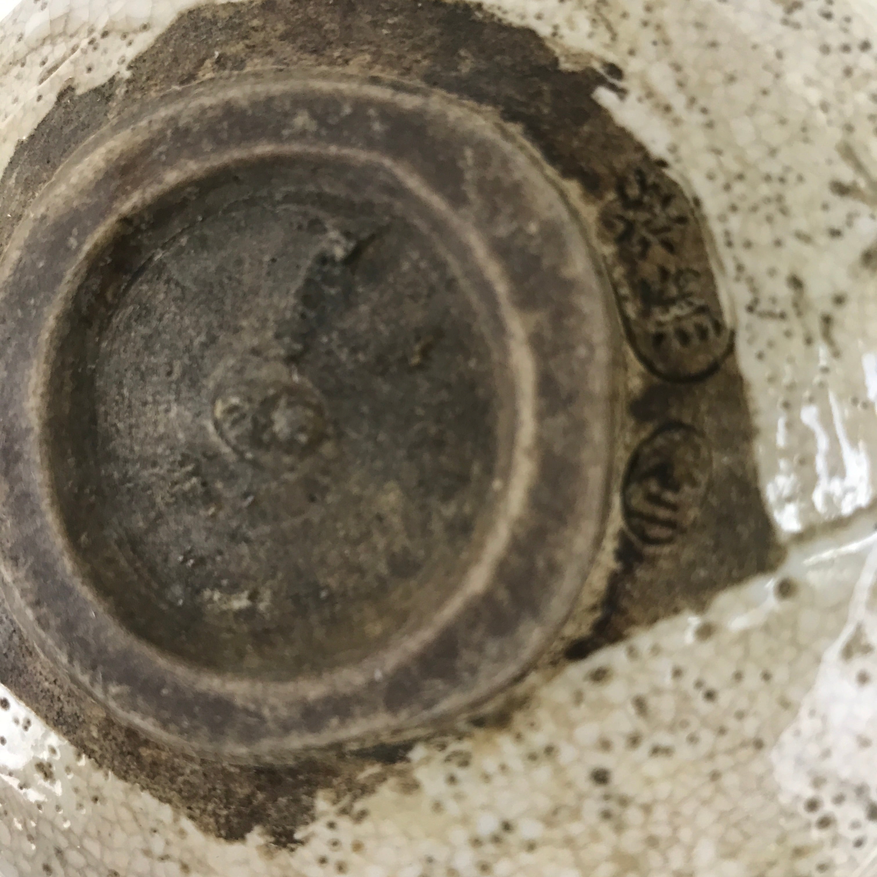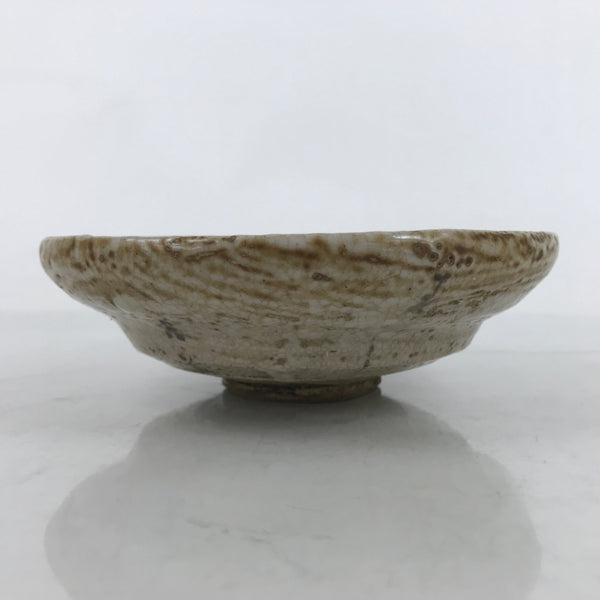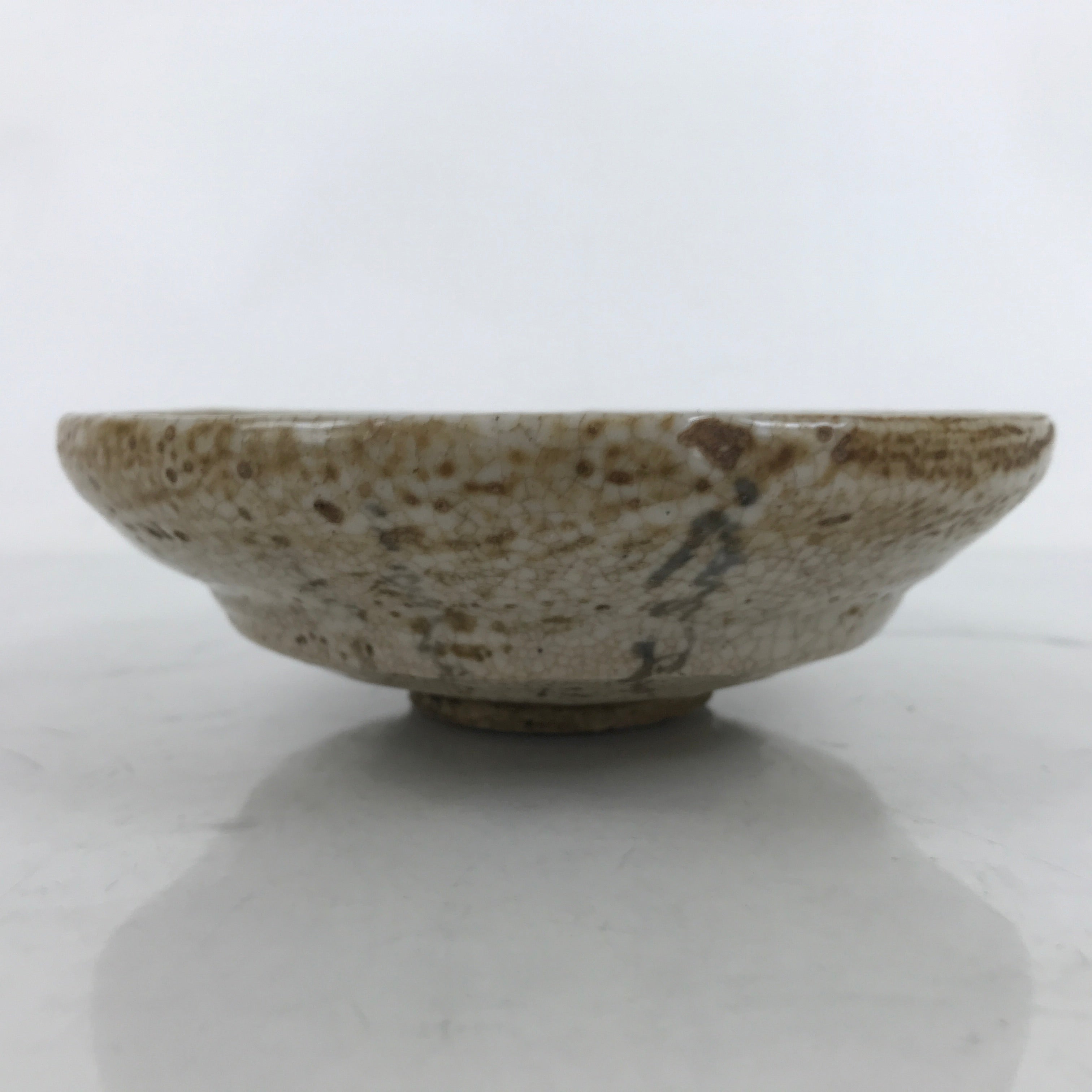 This is a vintage Japanese ceramic green tea bowl, or matcha chawan. It is covered with a beige crackle glaze. Brown accents are on the inside. Some Japanese letter design is on the outside. It has a shallow shape with a generously wide width for the summer tea ceremony. It allows the tea to cool slightly before drinking from the open air.