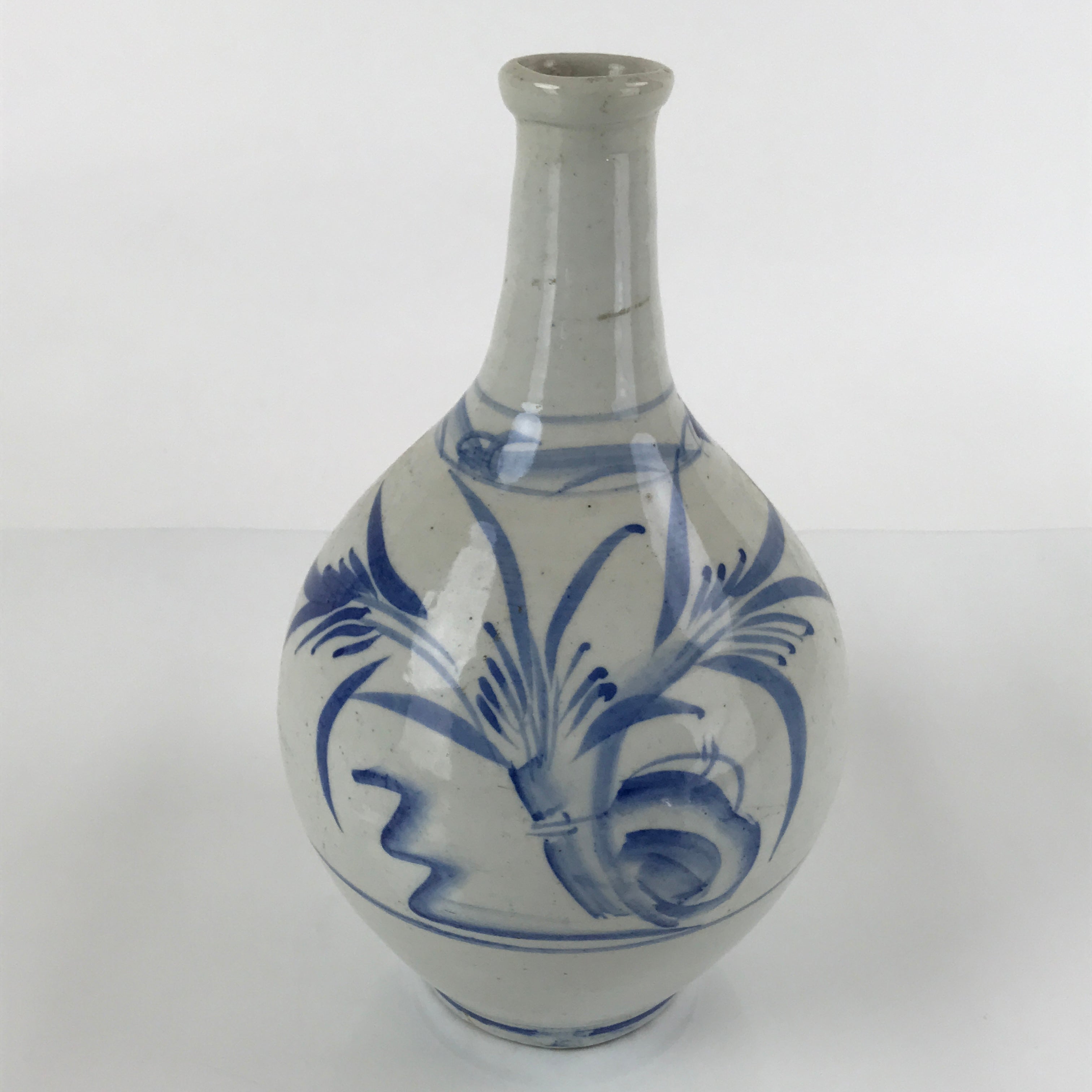 This is an antique Japanese ceramic sake bottle. It is called a kayoi-tokkuri and is used to pour and store sake. The commuting sake bottle became popular as a rental container for liquor stores in the Edo period when sake began to be consumed daily. This bottle is an off-white color with a handpainted indigo blue floral motif painted on one side and various simple linework. This particular tokkuri bottle has an elegant long neck with a rounded lip and is an excellent choice for a flower vase or general home decor.