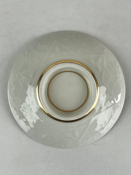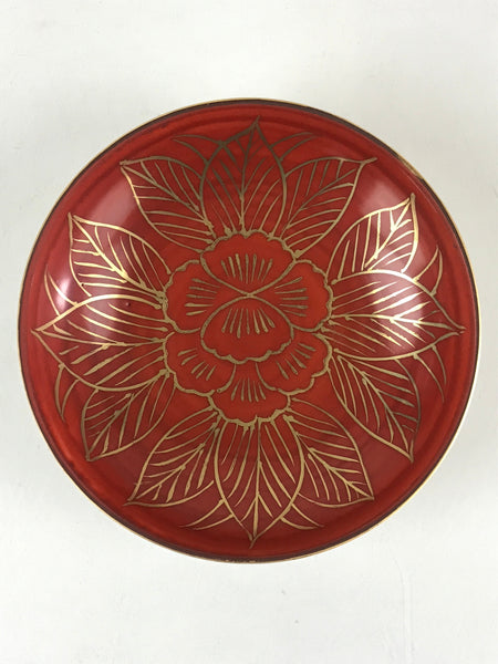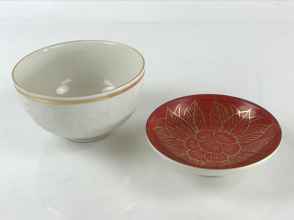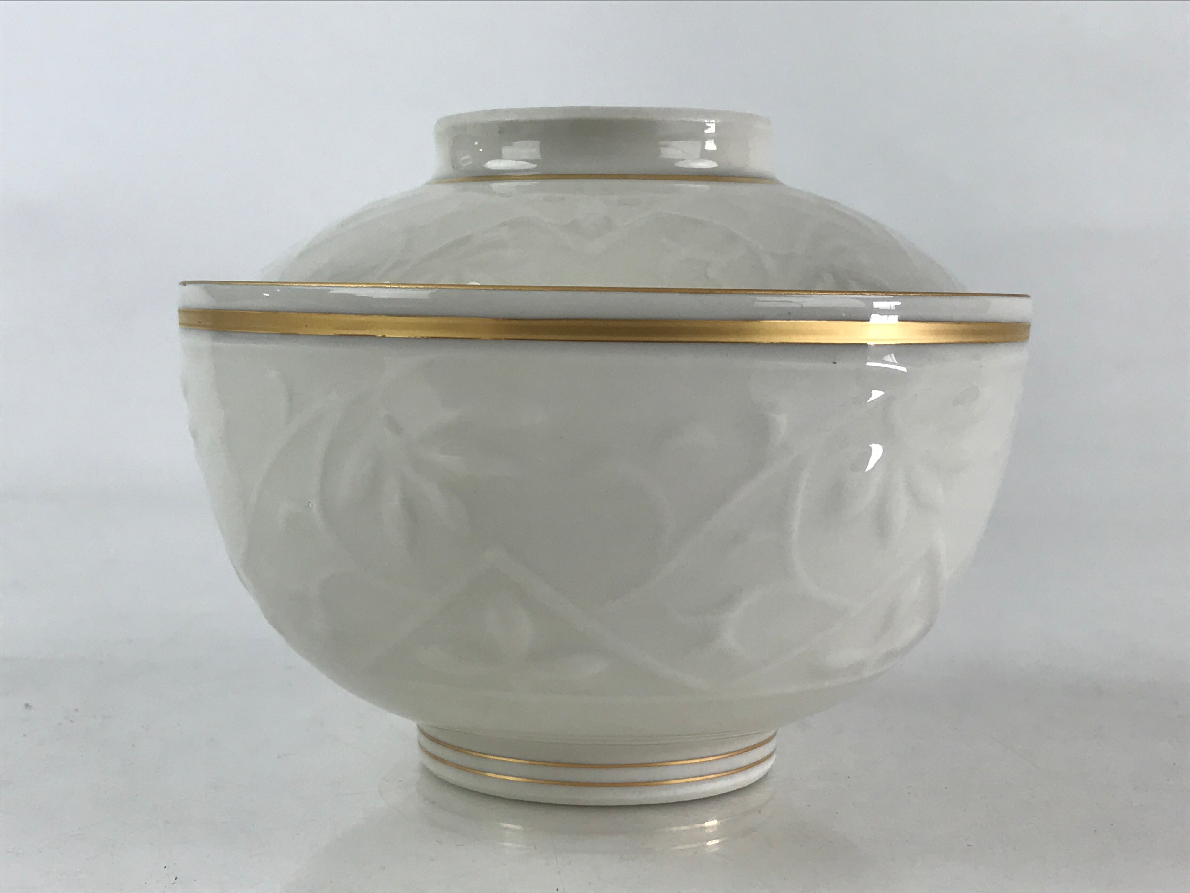 This is a vintage Japanese ceramic lidded rice bowl. The bowl has a plant design Uki-Bori (embossed carving) around it. The Inside lid is red and a golden flower is drawn. It's very beautiful pottery.