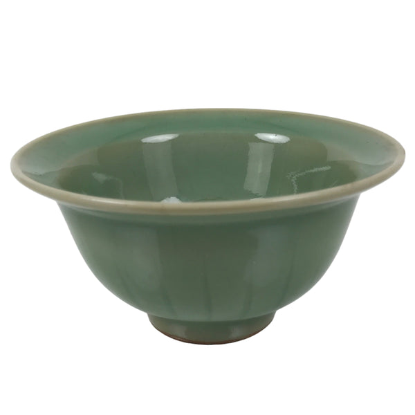 This vintage Japanese ceramic pottery small bowl, also called kobachi, is a beautiful celadon green color throughout. It is a simple design with no added details aside from a large kanji at the very bottom (髙) which means high/tall/expensive. It has a wide rim that tilts outward and is perfect for side dishes and desserts.