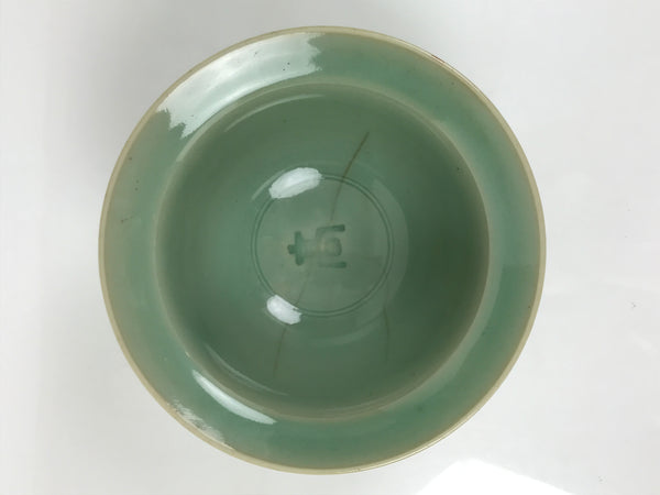 This vintage Japanese ceramic pottery small bowl, also called kobachi, is a beautiful celadon green color throughout. It is a simple design with no added details aside from a large kanji at the very bottom (髙) which means high/tall/expensive. It has a wide rim that tilts outward and is perfect for side dishes and desserts.