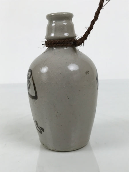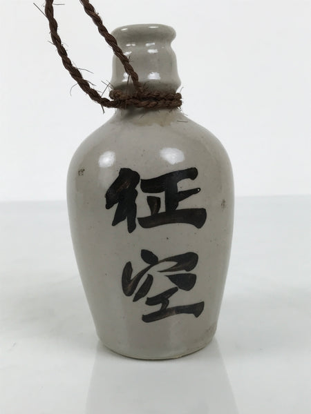 This is a vintage Japanese ceramic empty sake bottle or Tokkuri. It is a miniature kayoi tokkuri-style sake bottle used for selling sake named Seiku. It is gray and features Kanji characters. There is a braided string tied around the neck. There are incised letters on the bottom.